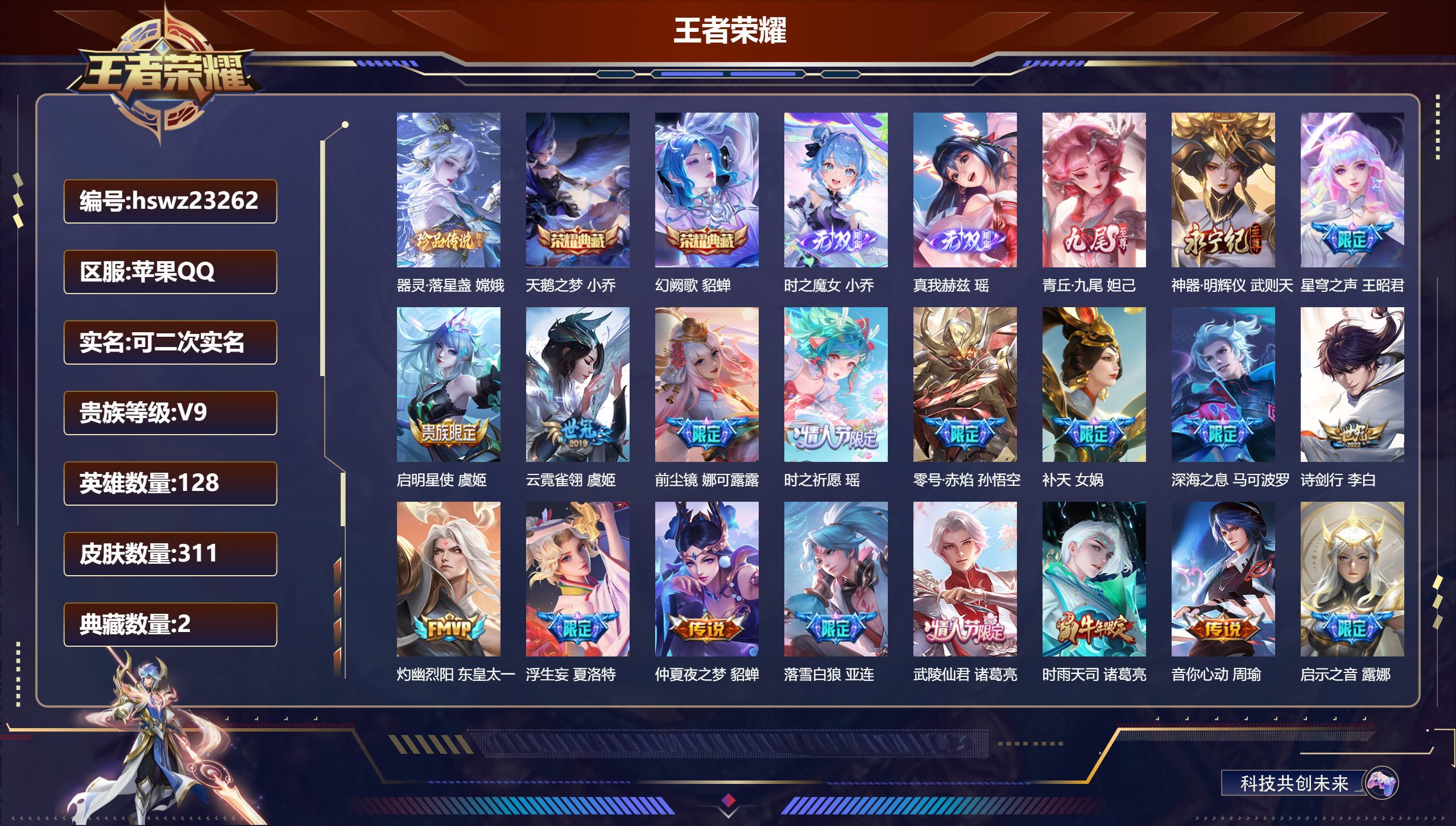 苹果QQ/尊贵铂金/311皮肤/128英雄/2典藏/0珍品无双/4无双/1珍品传说/38传说/84史