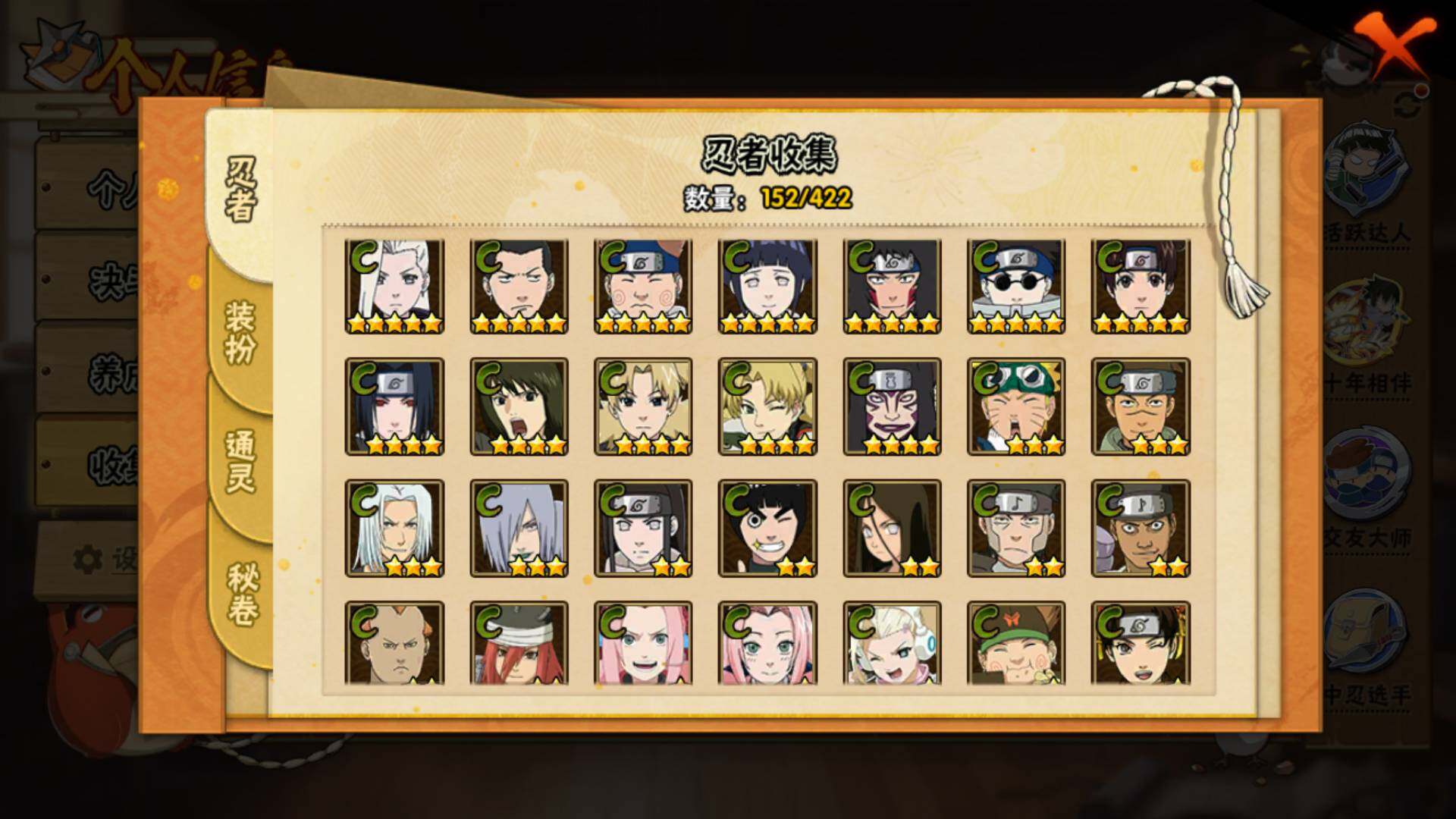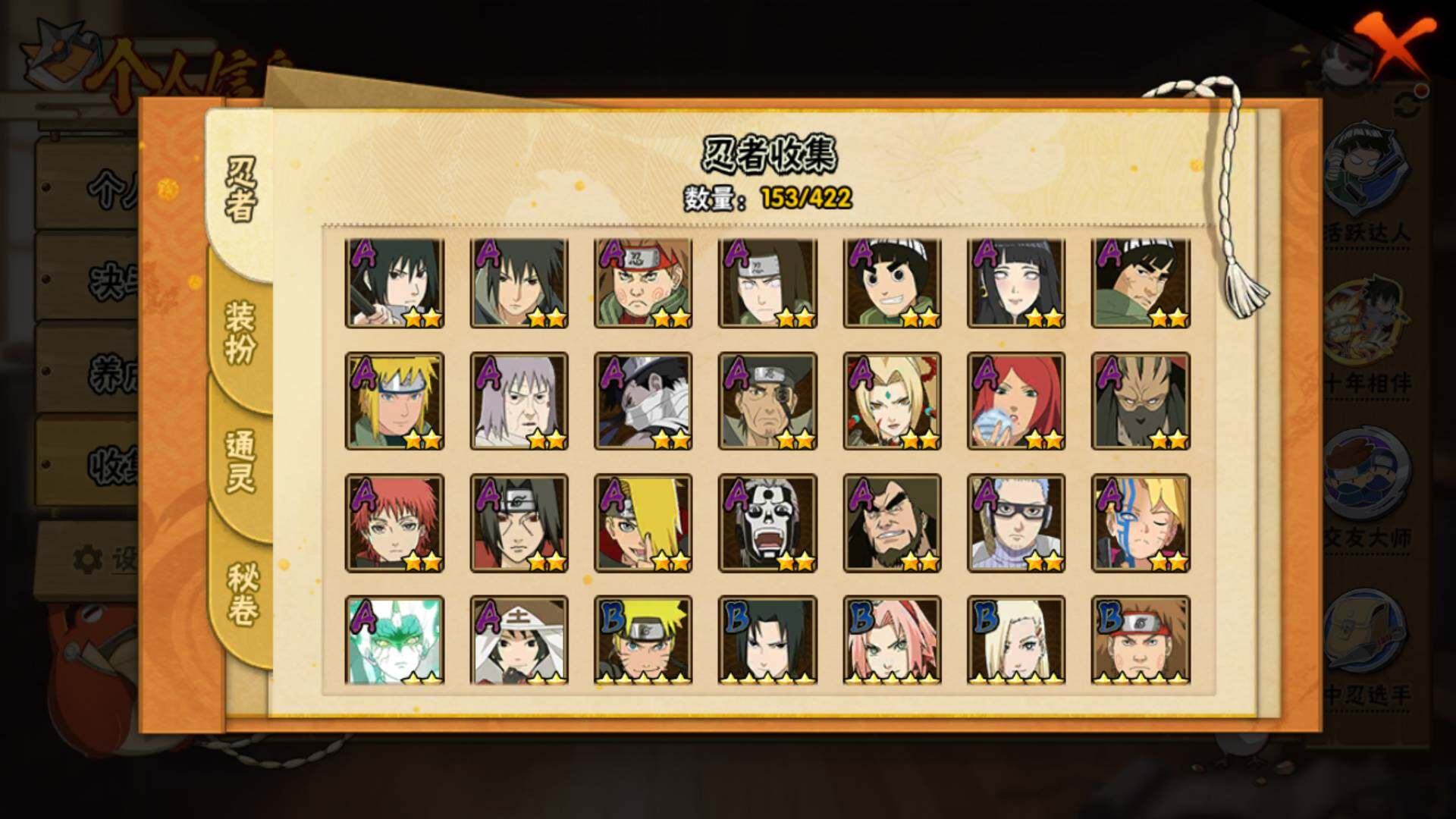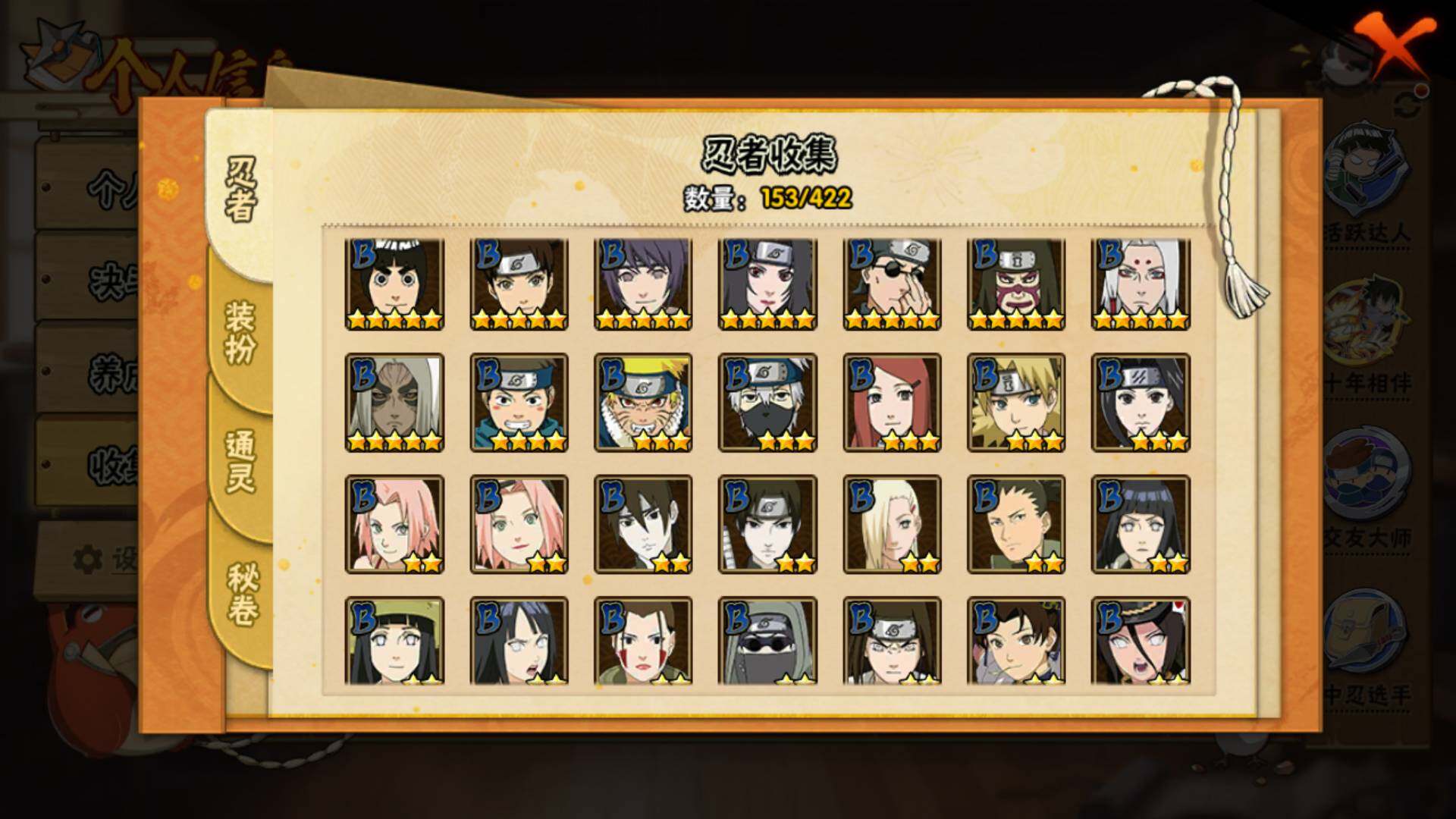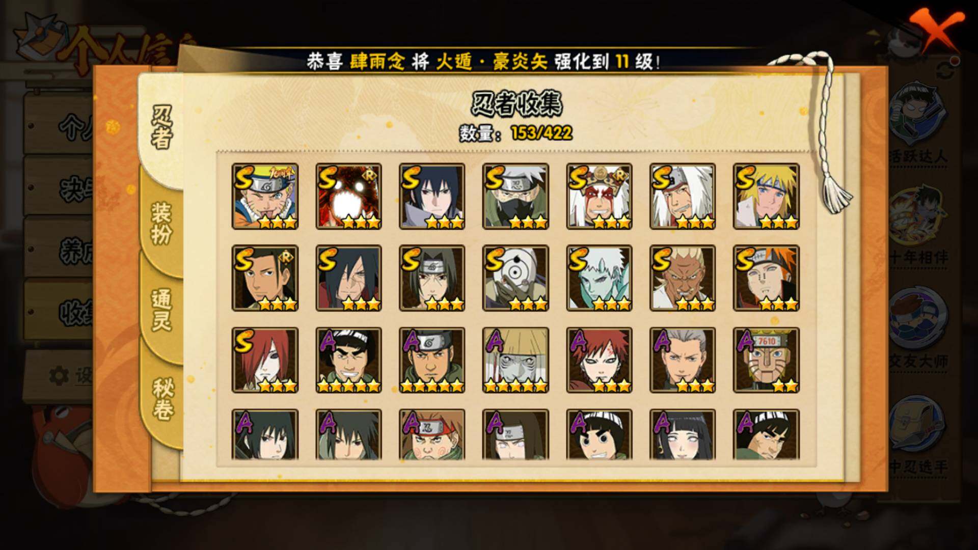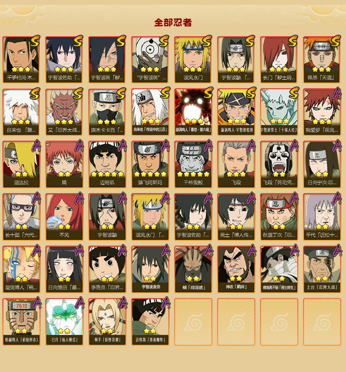 【S级忍者】:长门「秽土转生」(3星),宇智波斑「秽土转生·解」(3星),艾「忍界大战」(3星),宇智波鼬「须佐能乎」(3星),旗木卡卡西「须佐能乎」(3星),千手柱间「木叶创立」(3星),自来也「舞之豪杰」(3星),自来也「传说中的三忍」(3星),波风水门(3星),佩恩「天道