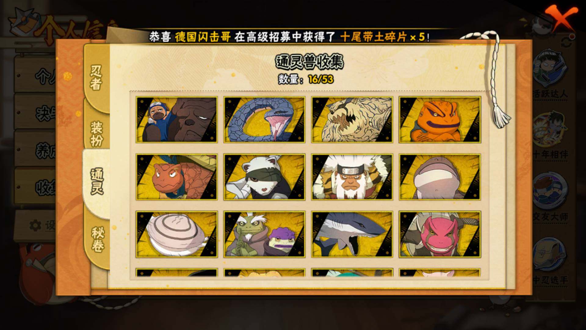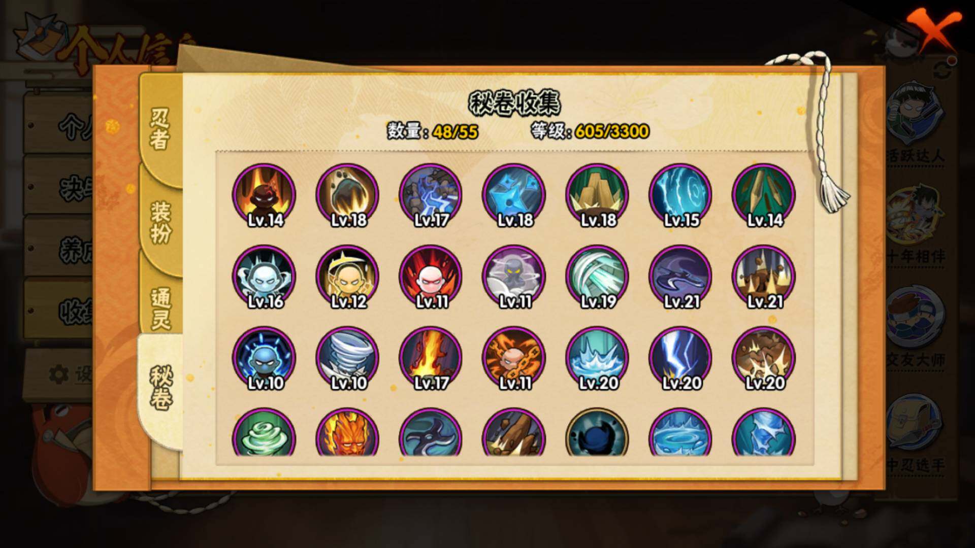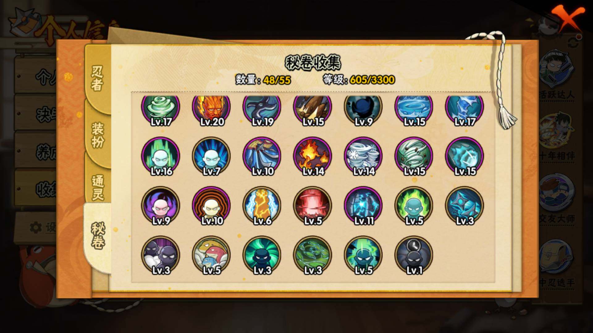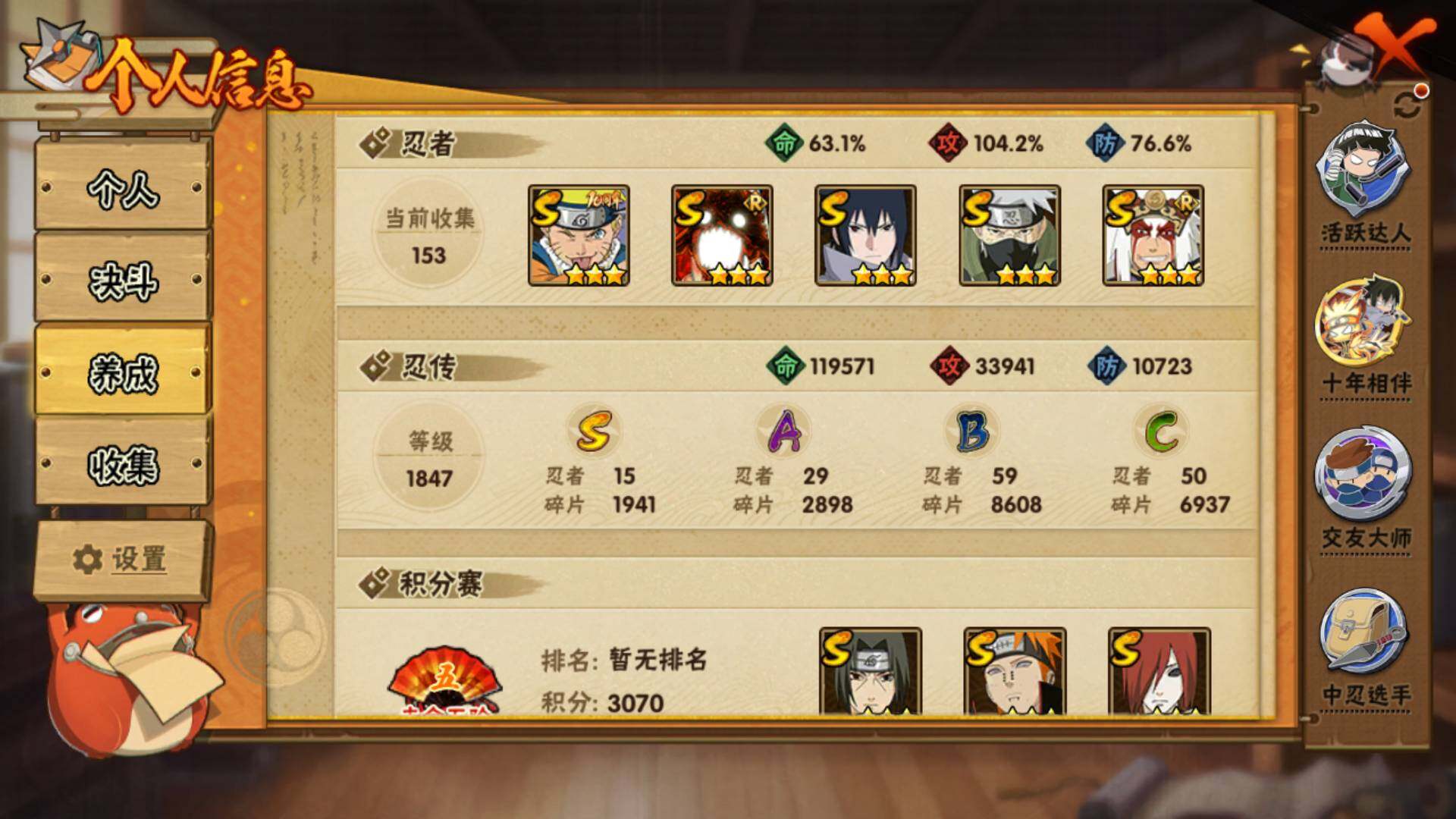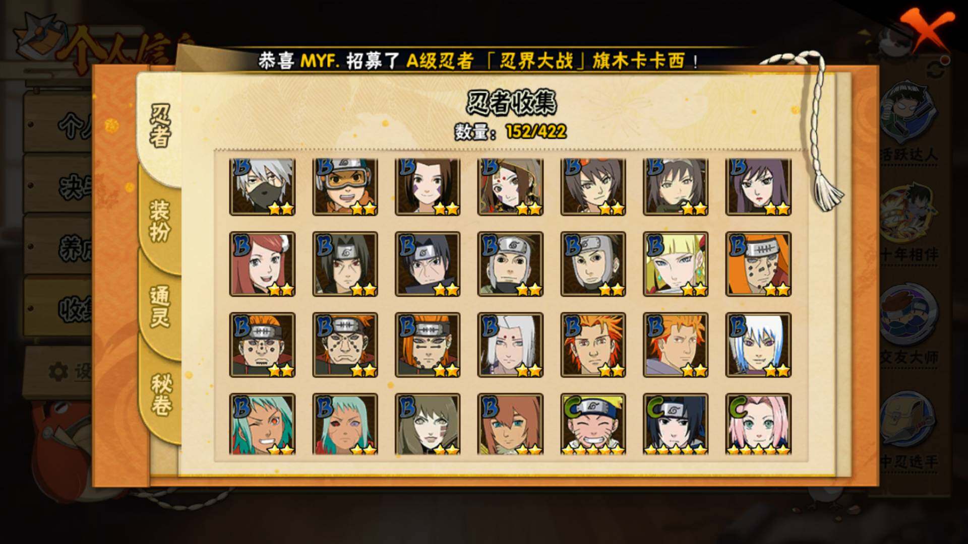【S级忍者】:长门「秽土转生」(3星),宇智波斑「秽土转生·解」(3星),艾「忍界大战」(3星),宇智波鼬「须佐能乎」(3星),旗木卡卡西「须佐能乎」(3星),千手柱间「木叶创立」(3星),自来也「舞之豪杰」(3星),自来也「传说中的三忍」(3星),波风水门(3星),佩恩「天道