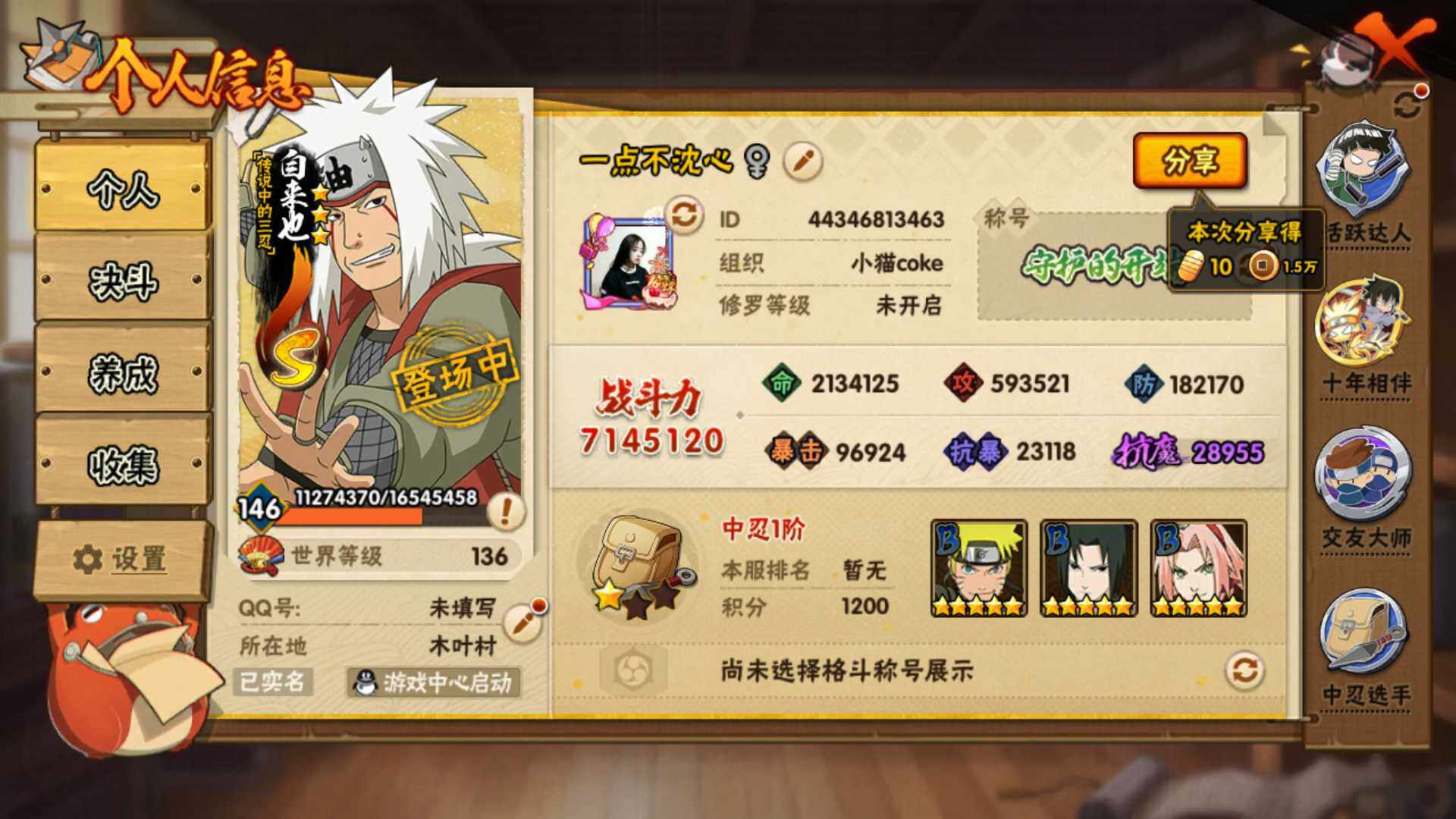 (可免费转苹果)V7 15S 29A 714万战力 2.4万金币 大蛇丸40片