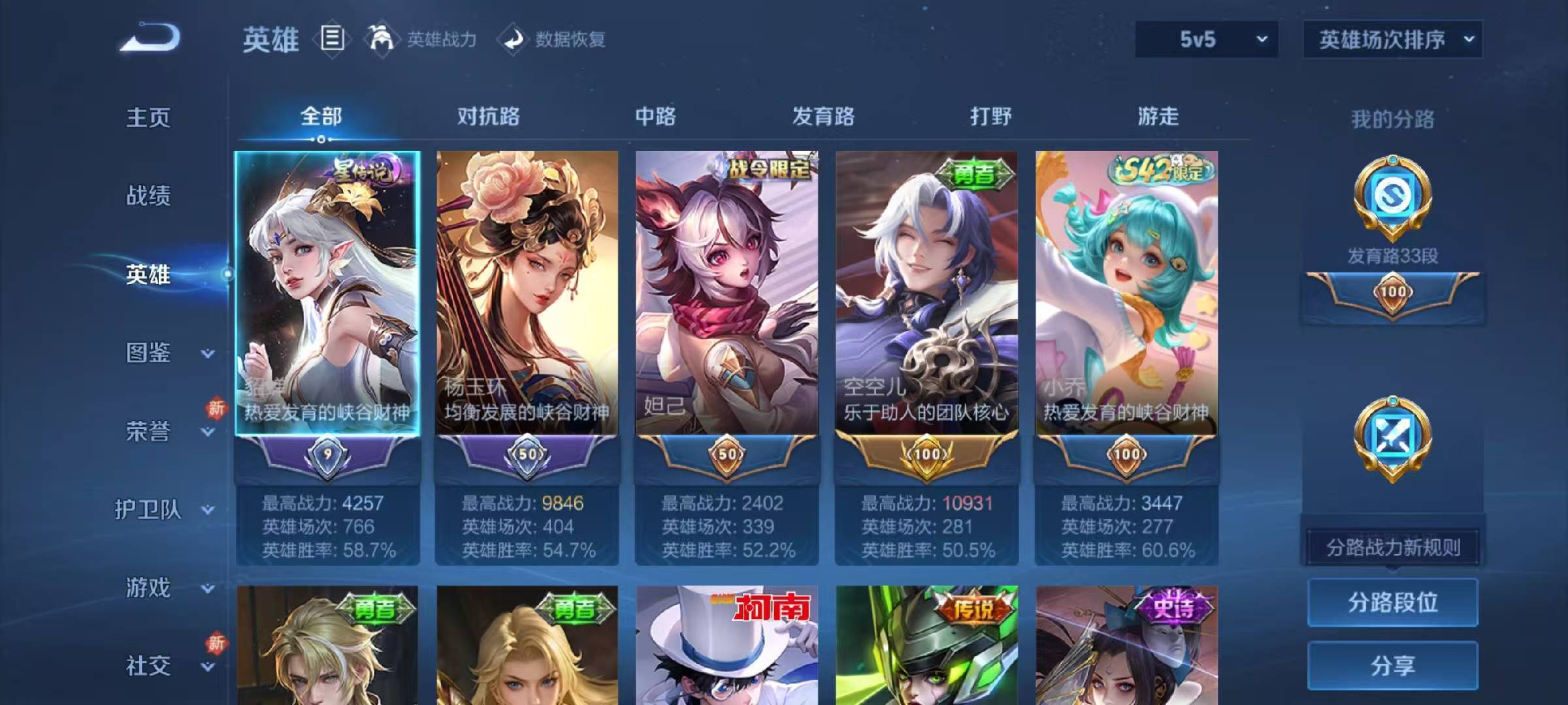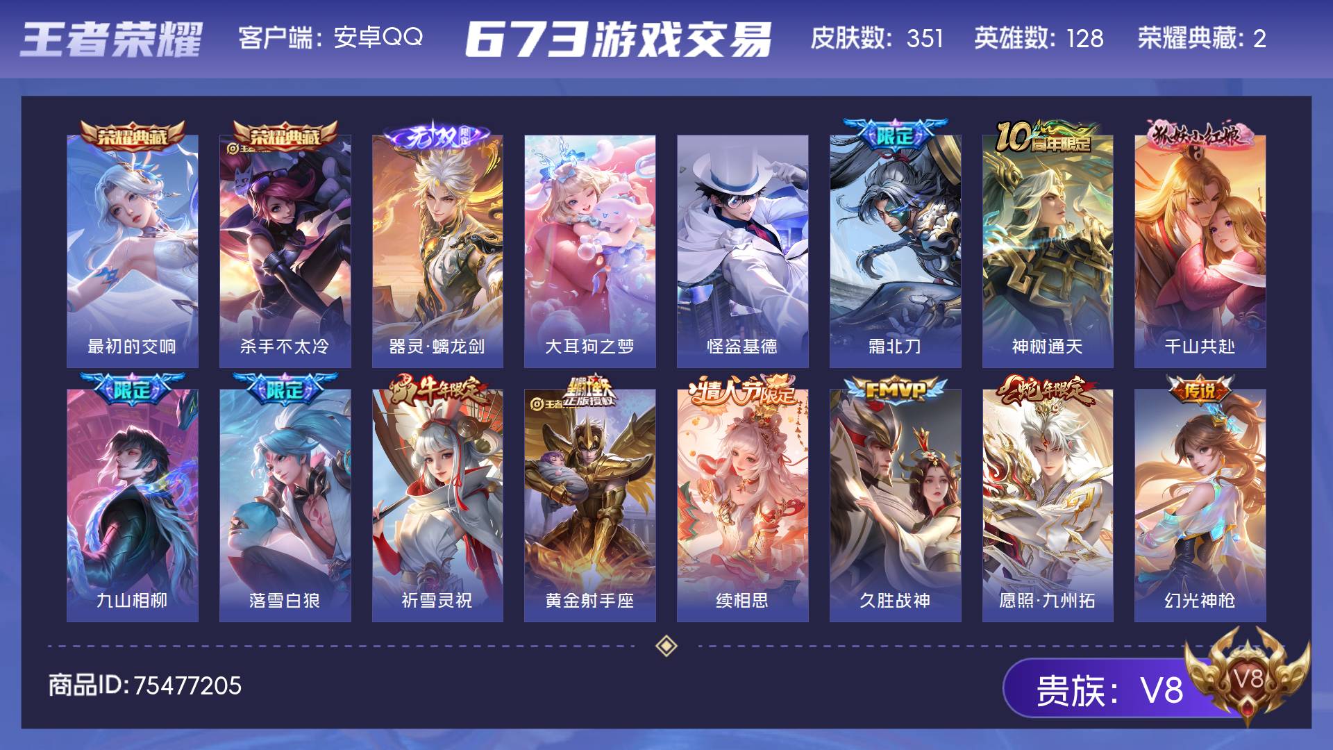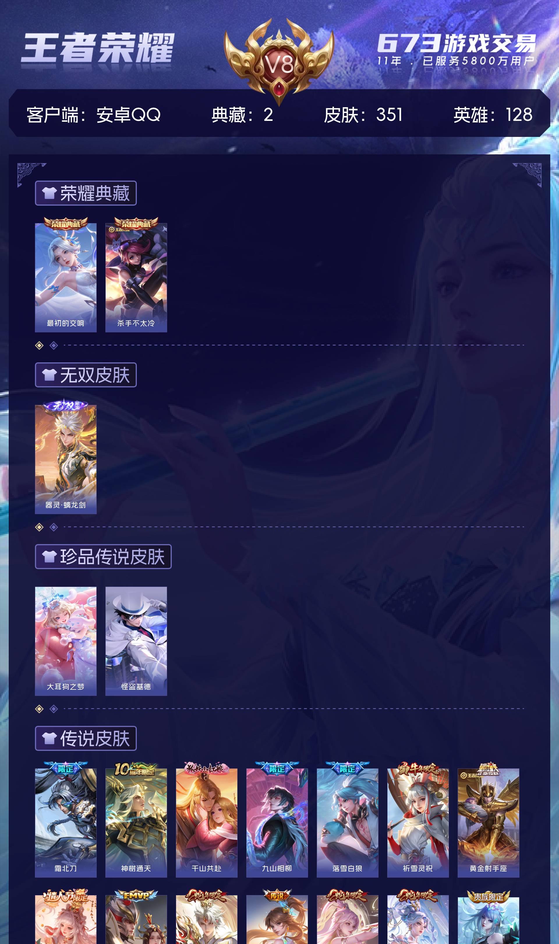 安卓QQ/至尊星耀/351皮肤/128英雄/2典藏/0珍品无双/1无双/2珍品传说/22传说/108