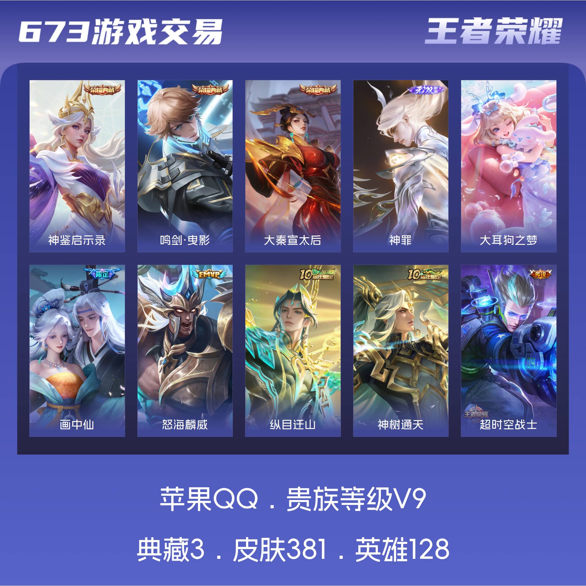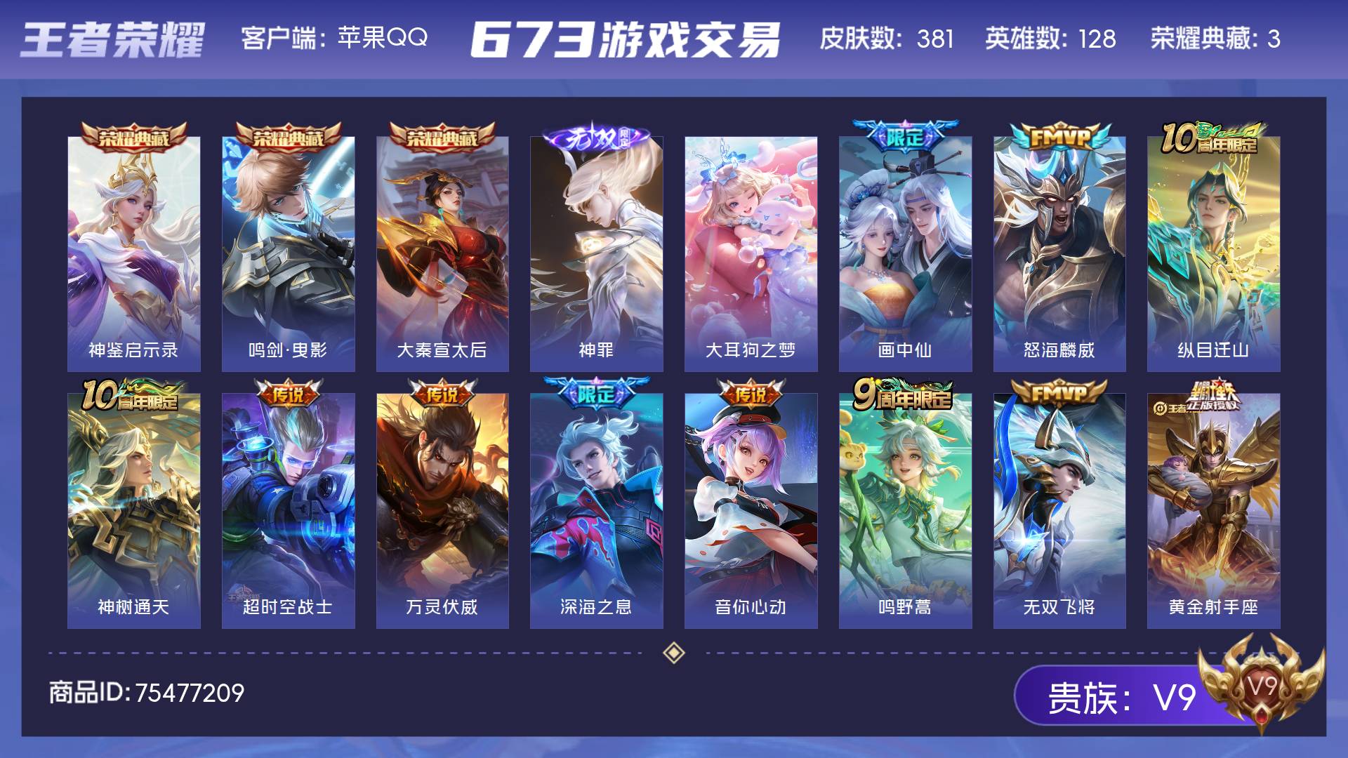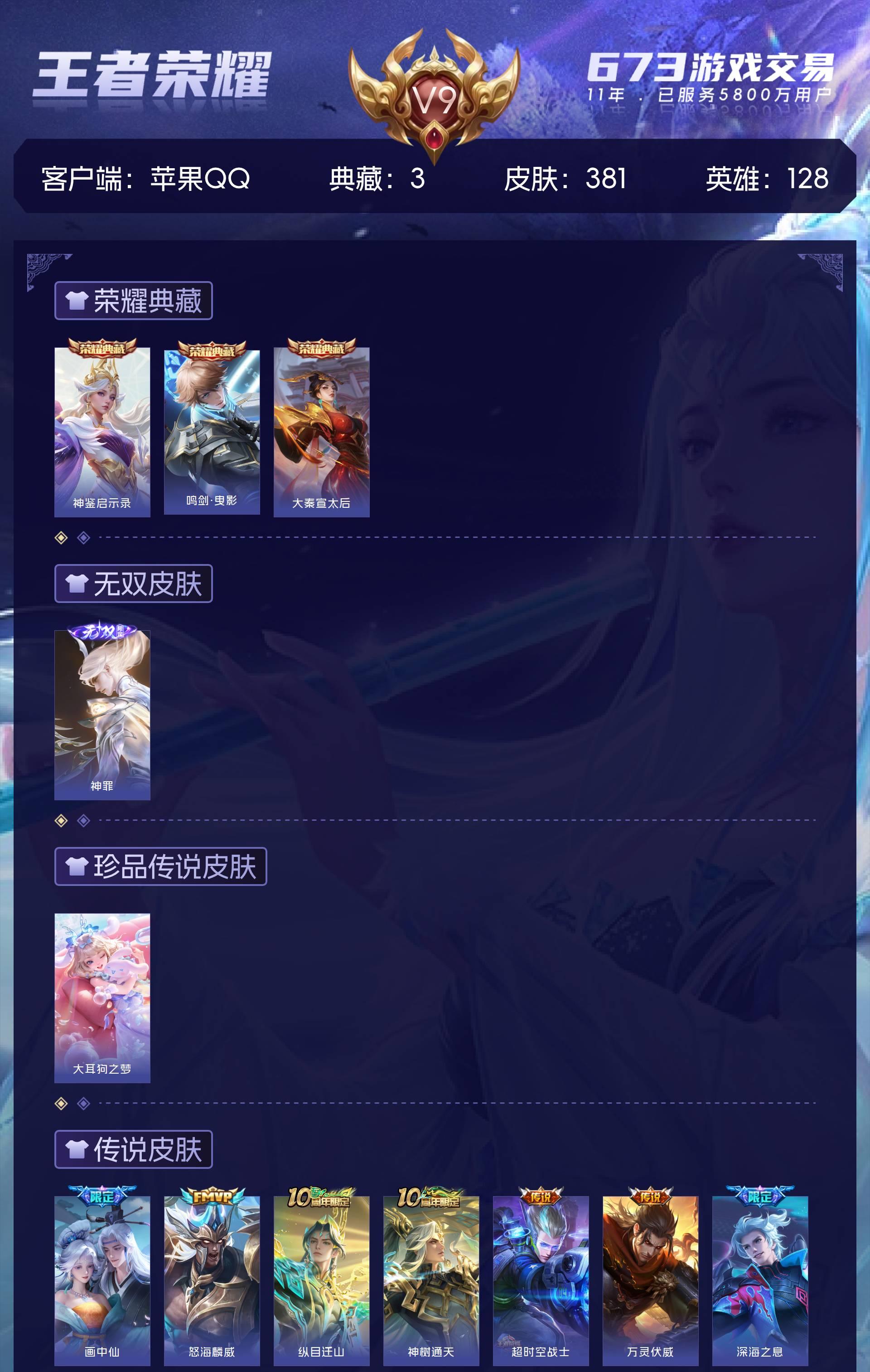 苹果QQ/至尊星耀/381皮肤/128英雄/3典藏/0珍品无双/1无双/1珍品传说/19传说/127