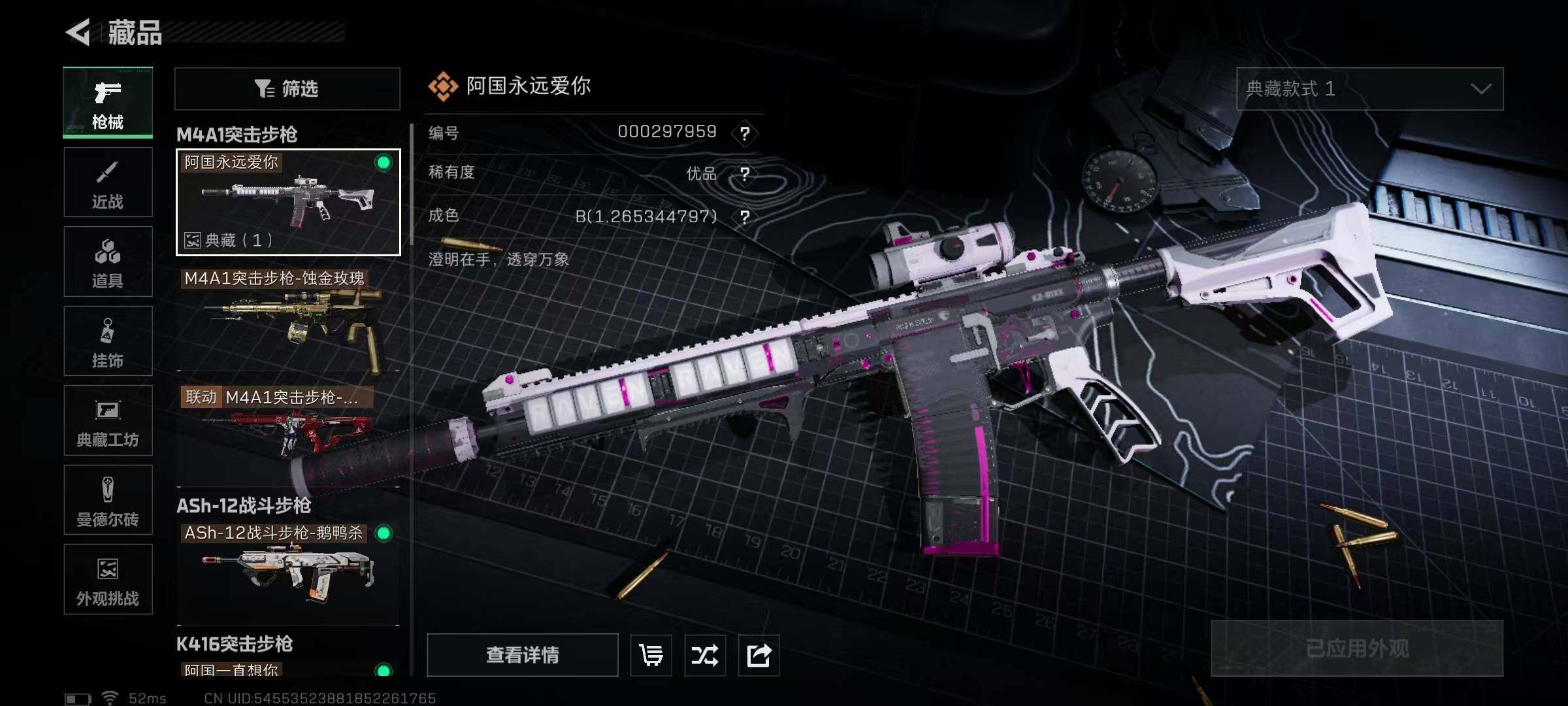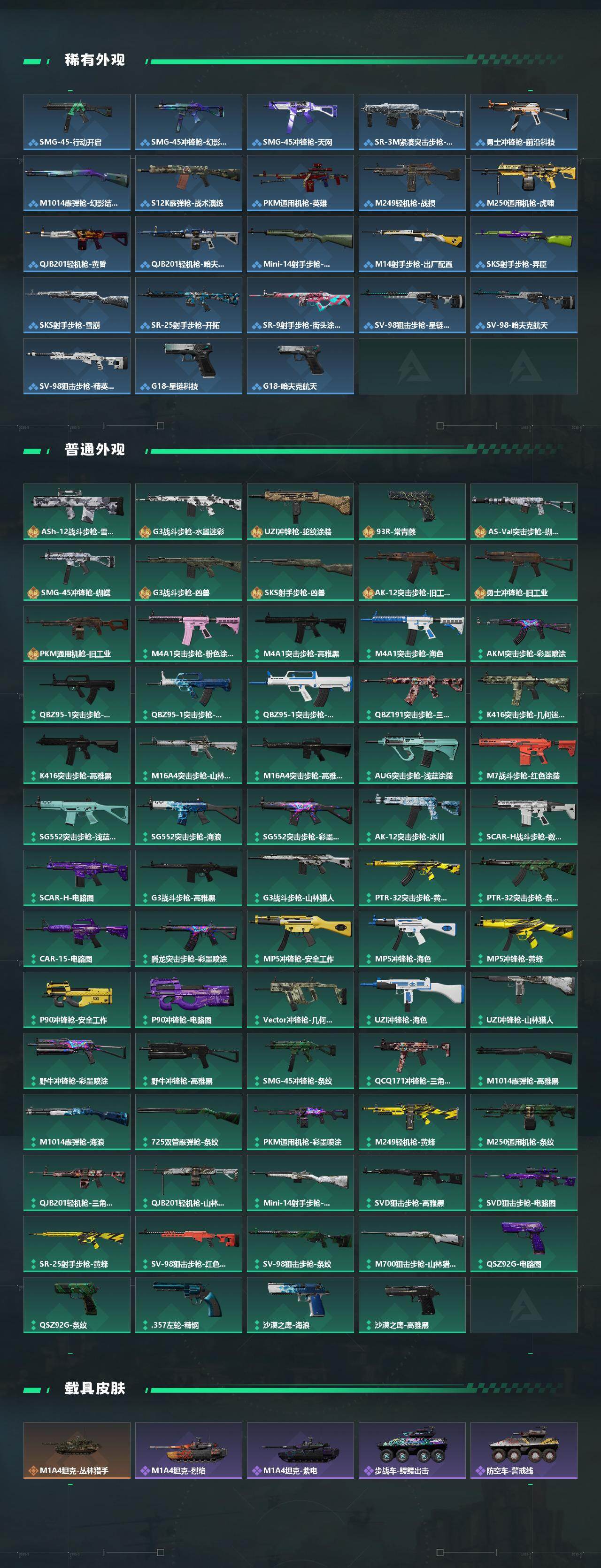 【传说外观】:M4A1突击步枪-蚀金玫瑰,M4A1突击步枪-阿米娅,ASh-12战斗步枪-鹅鸭杀,AK-12突击步枪-特斯拉线
