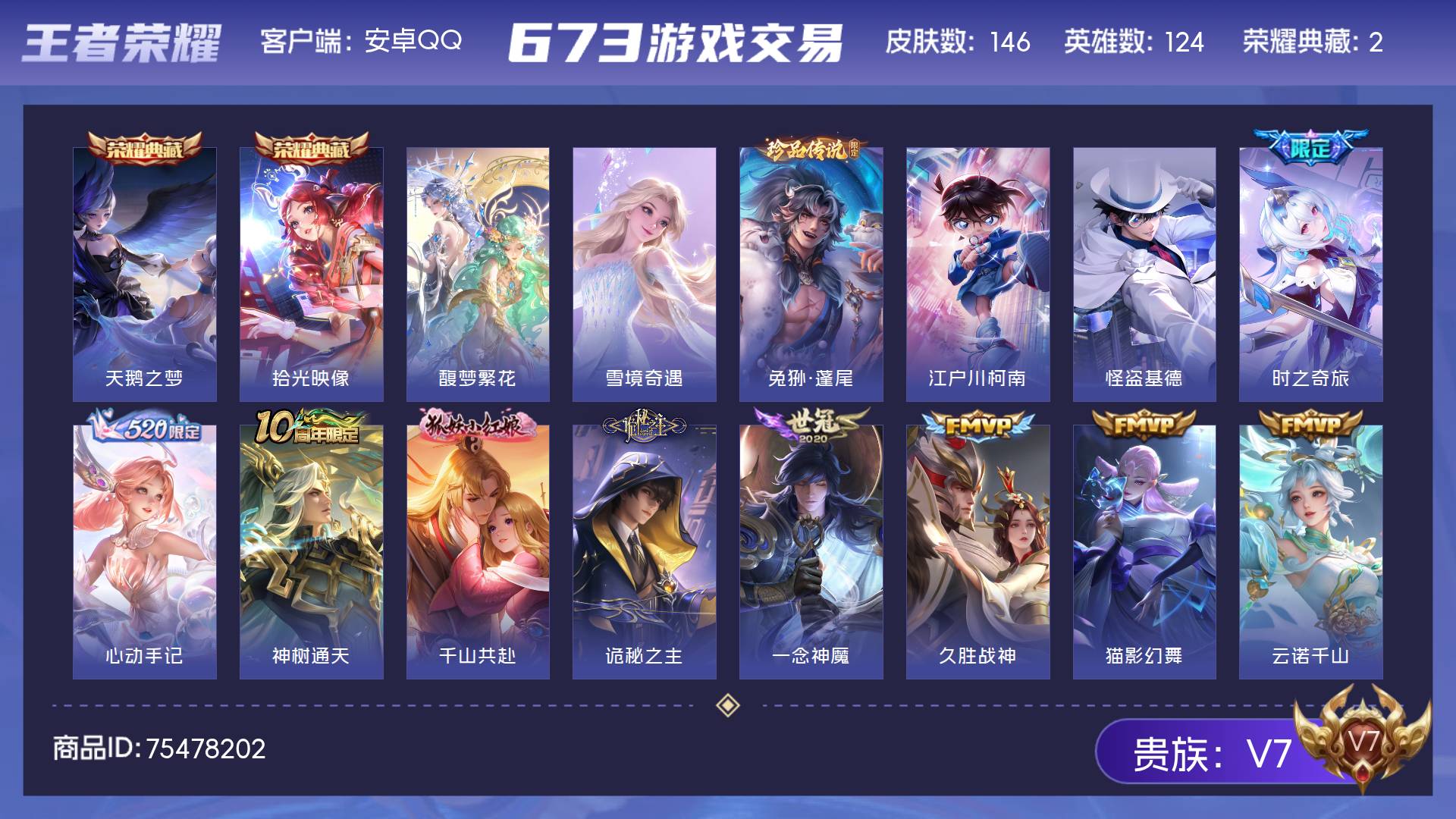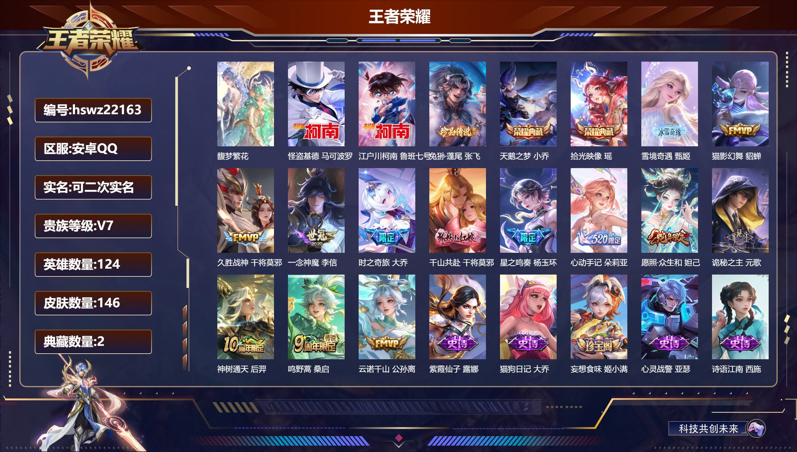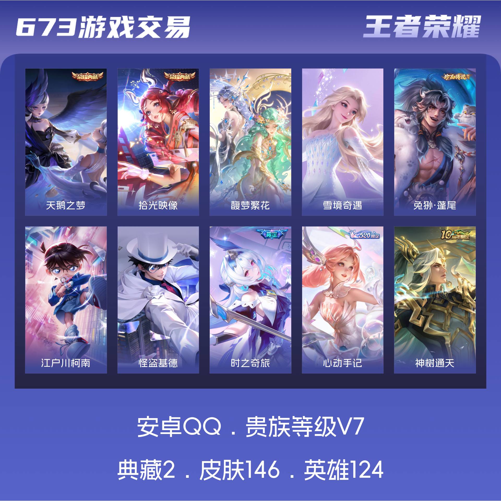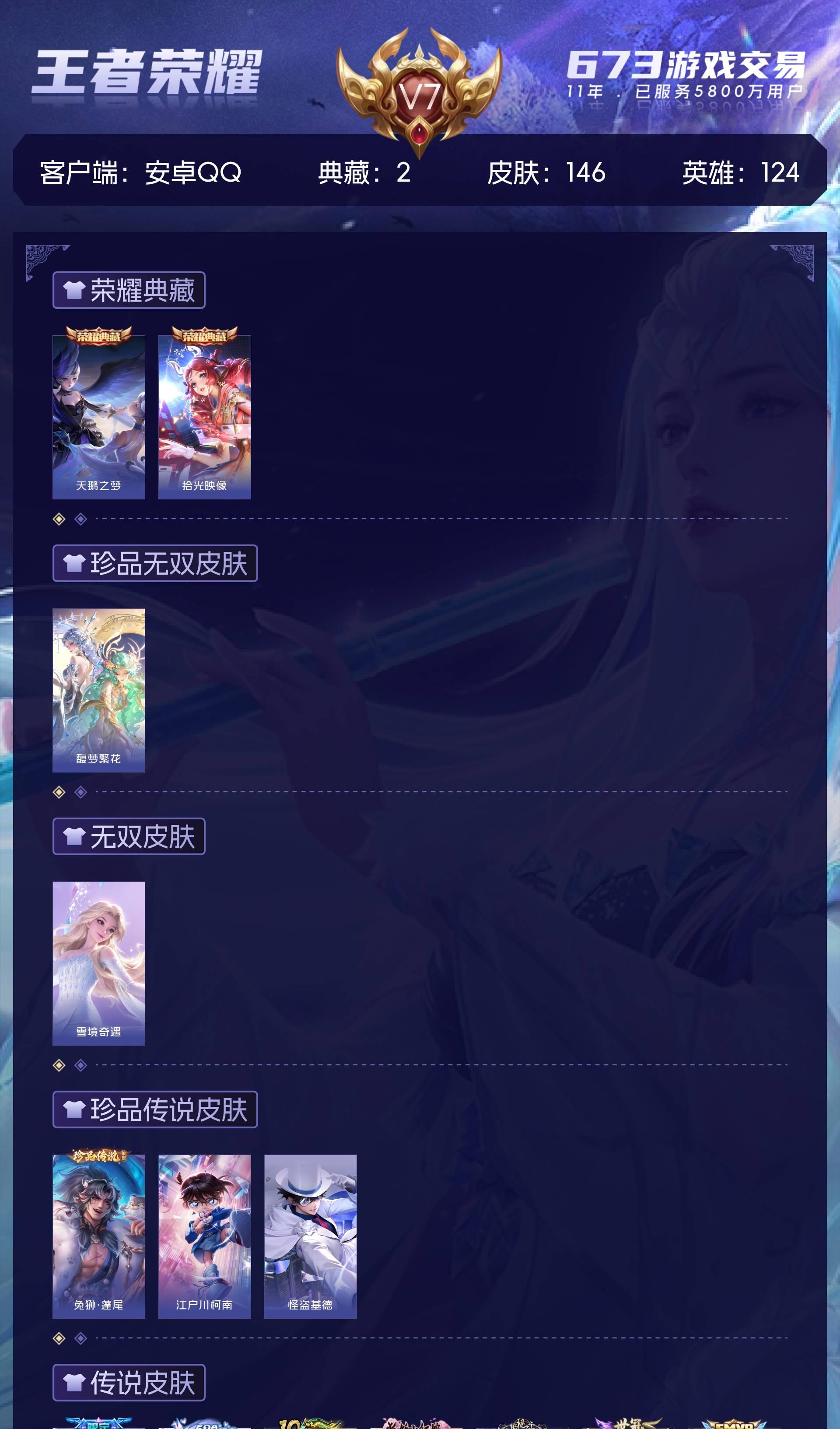 安卓QQ/至尊星耀/146皮肤/124英雄/2典藏/1珍品无双/1无双/3珍品传说/12传说/50史