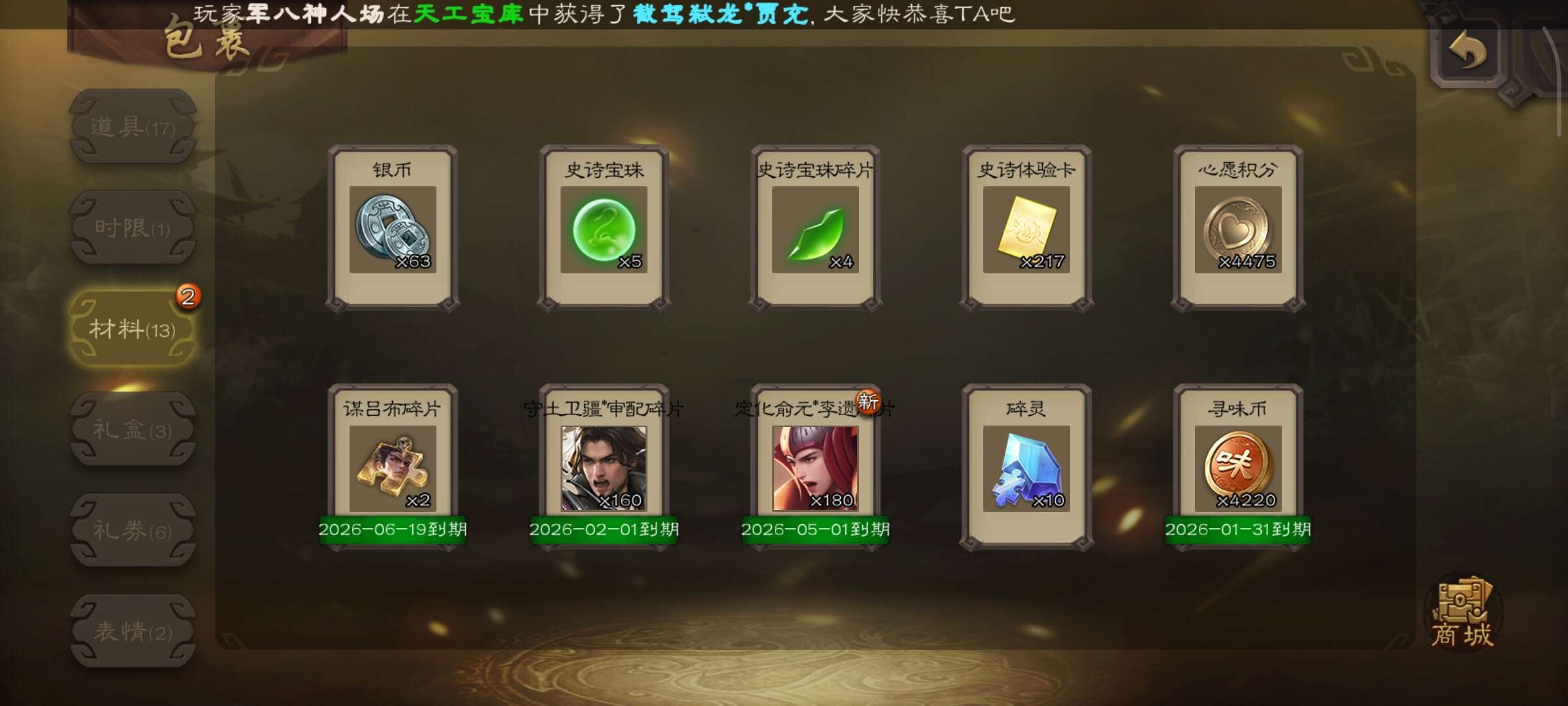 动老刘+新节钺令辛宪英已出,三卡充足,背包5个散珠