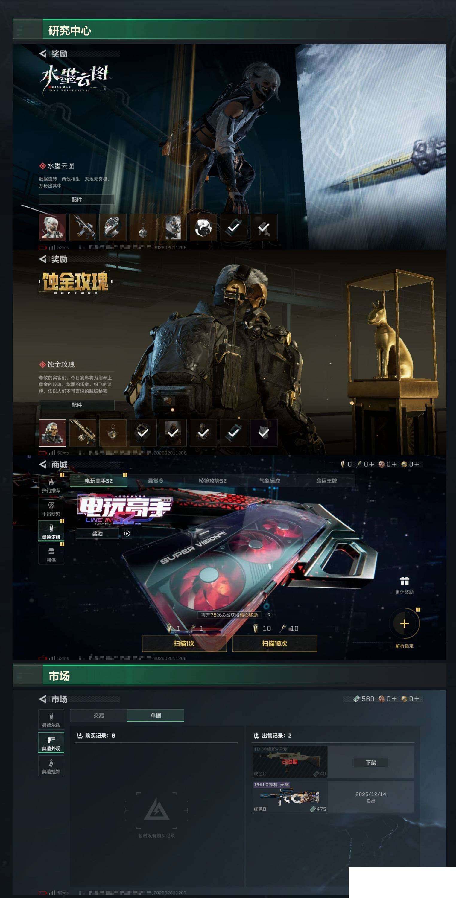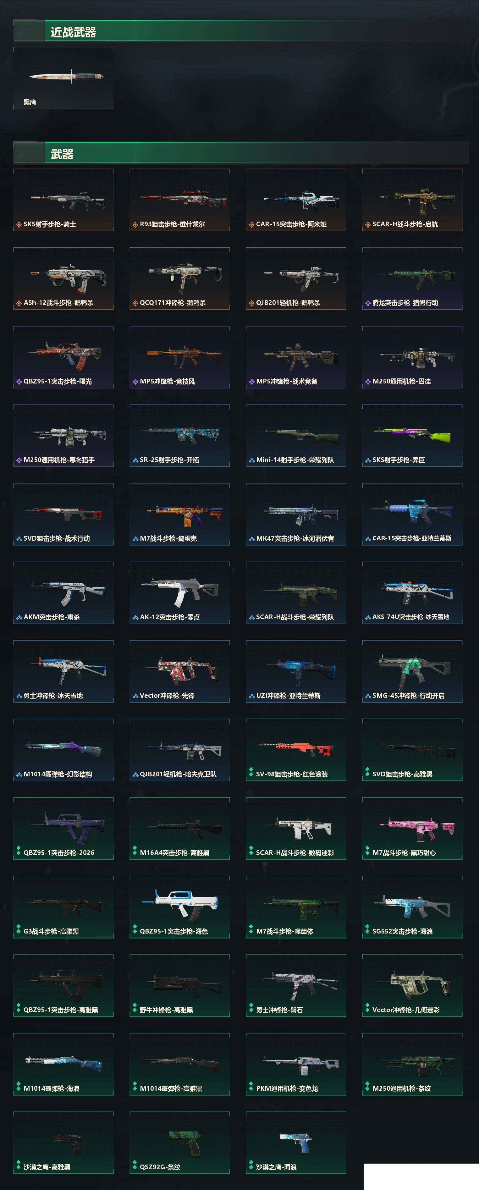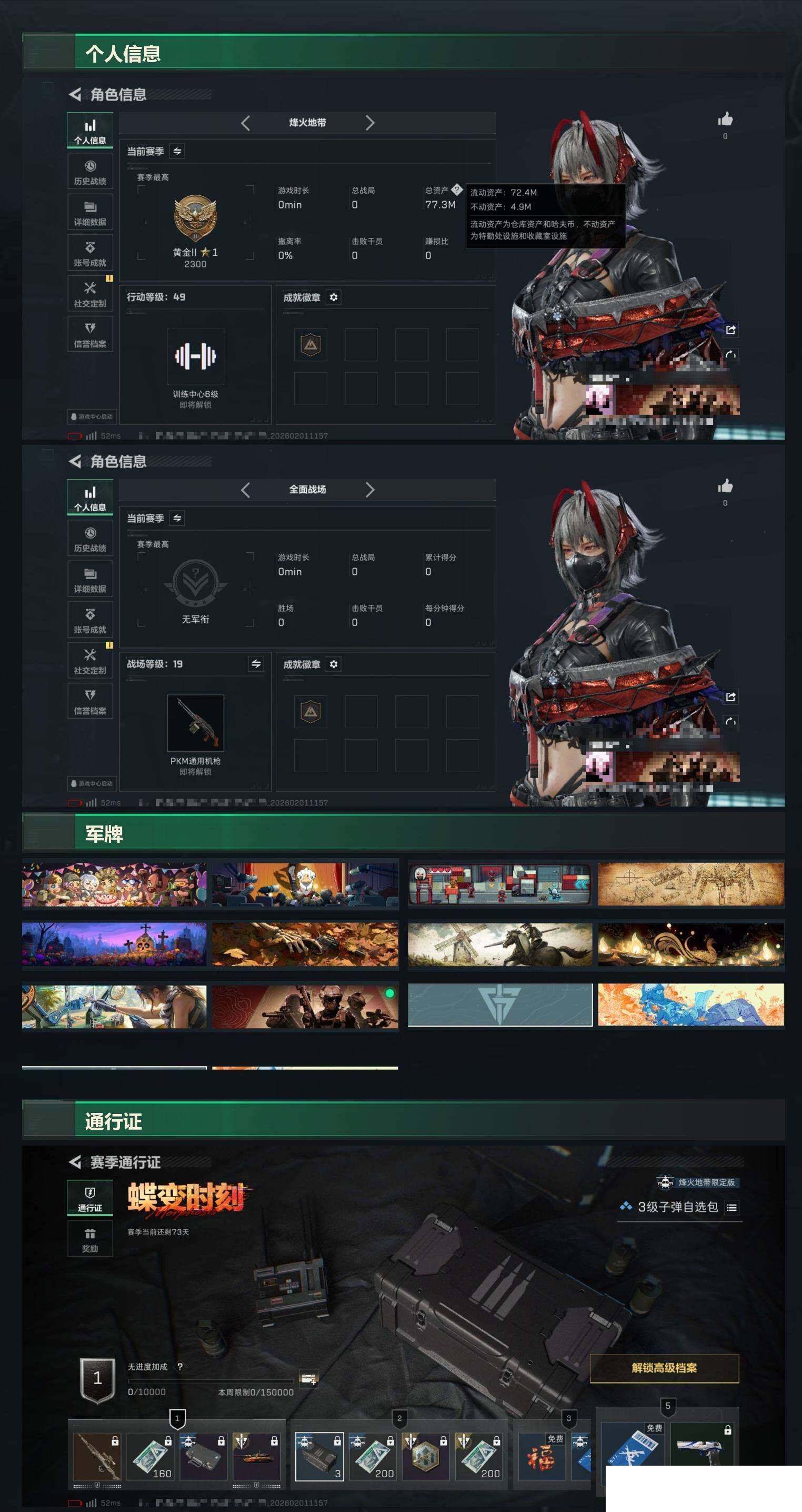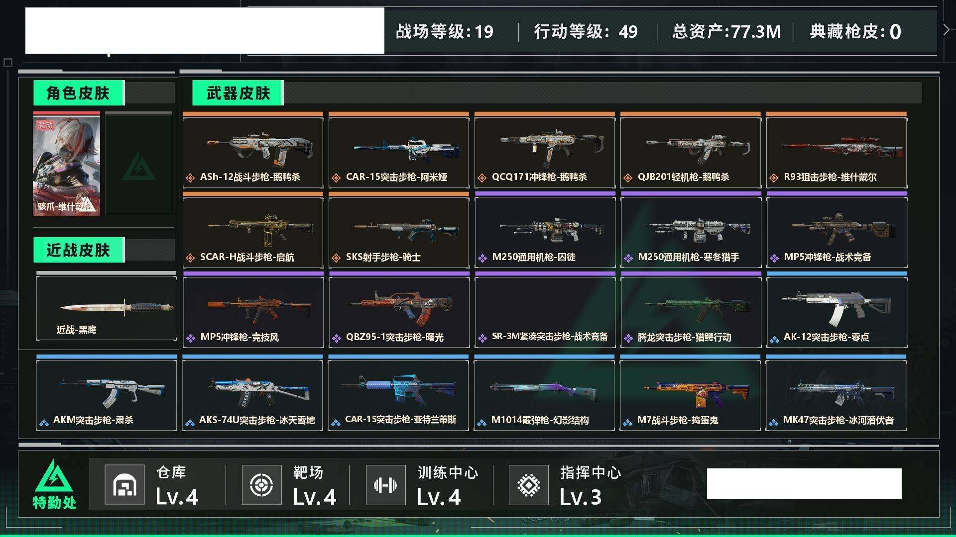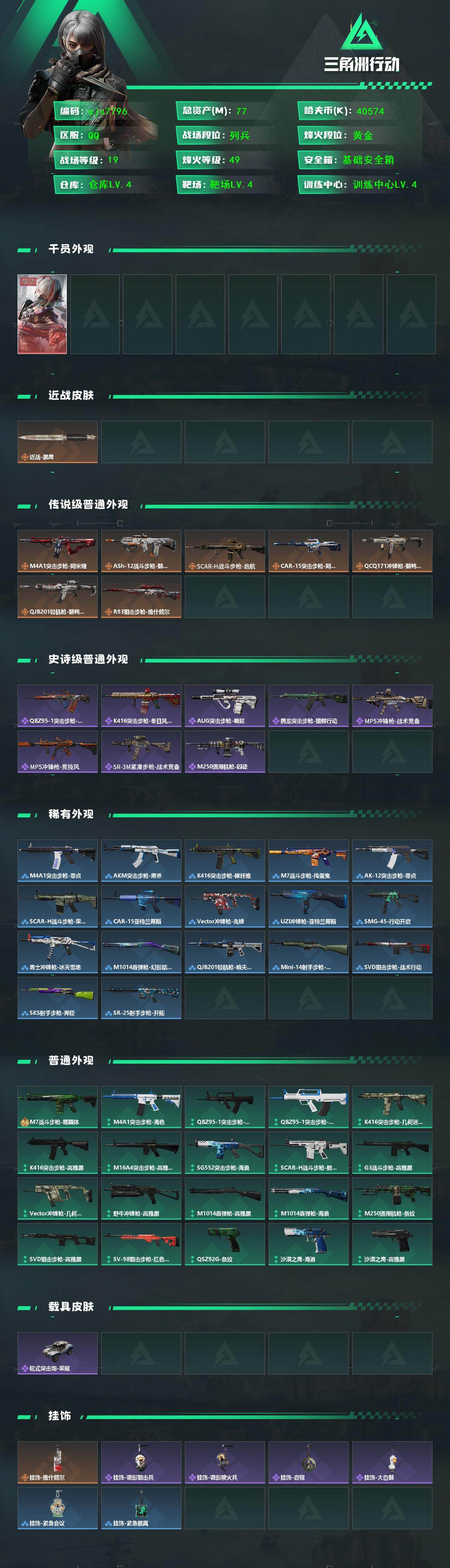 【sjs7796】小号 烽火地带段位: 黄金 全面战场段位: 列兵 总资产: 77000000 sjs7796 哈夫币: 40574000 干员外观: 骇爪-维什戴尔 传说武器皮肤: M4A1突击步枪-阿米娅,CAR-15突击步枪-阿米娅,R93狙击步枪-维什戴尔,SCAR-H战斗步枪-启航,ASh-12战斗步枪-鹅鸭杀,QCQ171冲锋枪-鹅鸭杀,QJB201轻机枪-鹅鸭杀 史诗武器皮肤: QBZ95-1突击步枪-曙光,AUG突击步枪-蝮蛇,M250通用机枪-囚徒,腾龙突击步枪-猎鳄行动,SR
