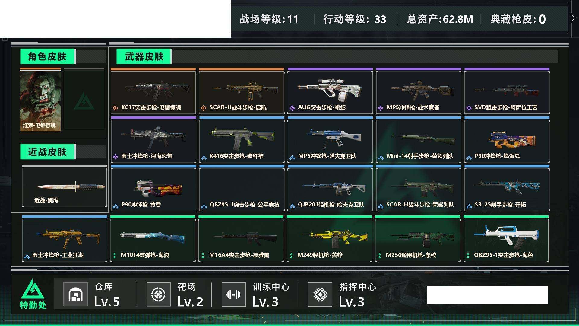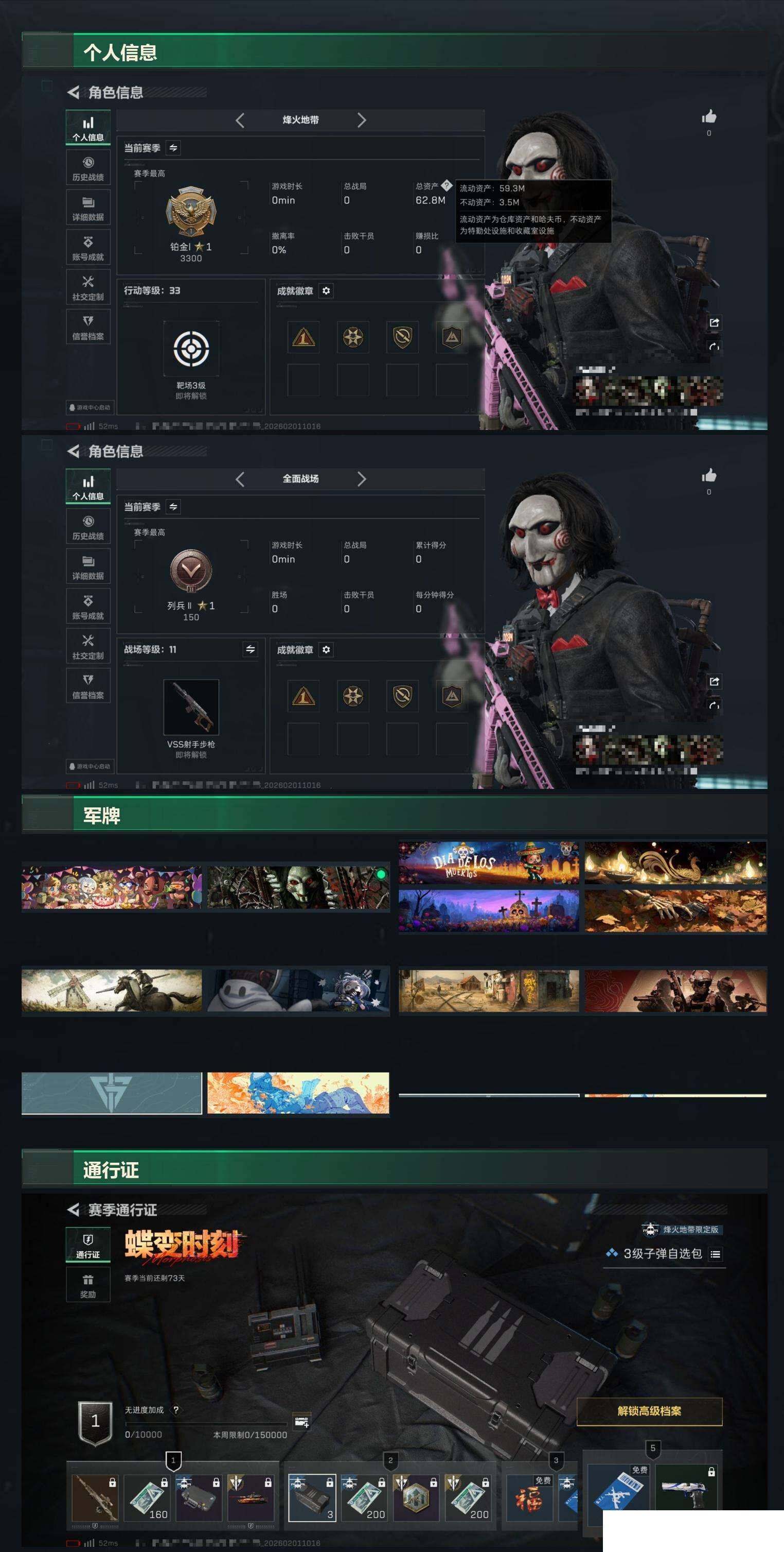 【sjs4633】62m资产17m现金 烽火地带段位: 铂金 全面战场段位: 列兵 总资产: 62000000 哈夫币: 17310000 sjs4633 干员外观: 红狼-电锯惊魂 传说武器皮肤: SCAR-H战斗步枪-启航,KC17突击步枪-电锯惊魂 史诗武器皮肤: SVD狙击步枪-阿萨拉工艺,AUG突击步枪-蝮蛇,SG552突击步枪-深海恐惧,勇士冲锋枪-深海恐惧,勇士冲锋枪-工业狂潮,MP5冲锋枪-战术竞备 载具皮肤: 轮式突击炮-荣耀 亮点: 62m总资产-17310k哈伏币-33烽火