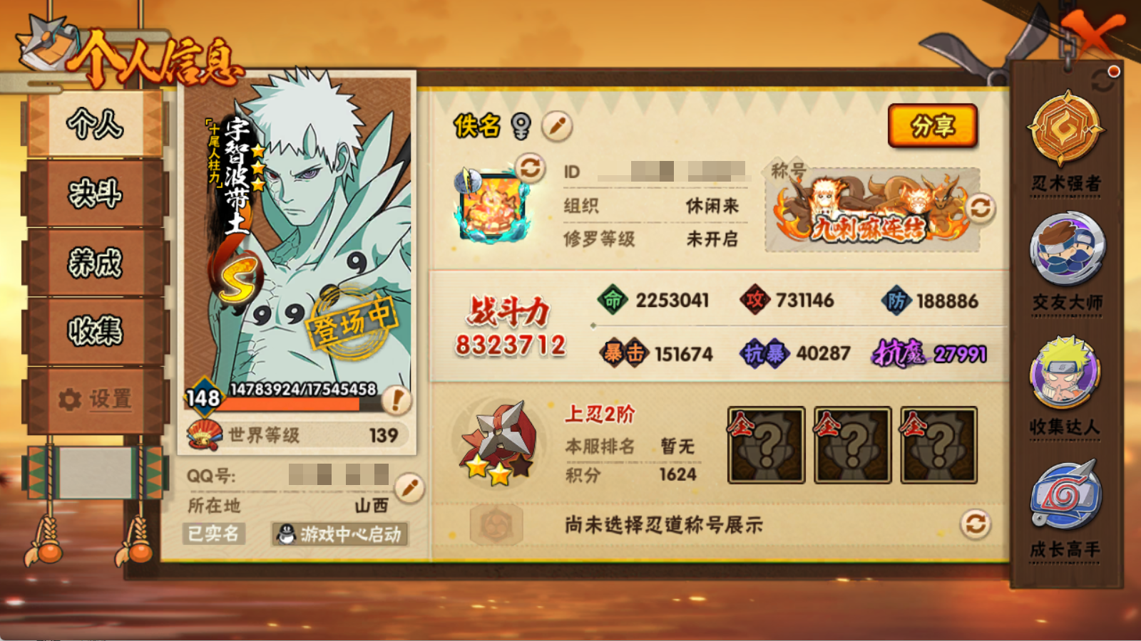 (可转苹果)832W战力 超哥 破面 五影斑 创柱28S+298点券小孩+扉武 妖怪纲手2个198直购38A+四百战