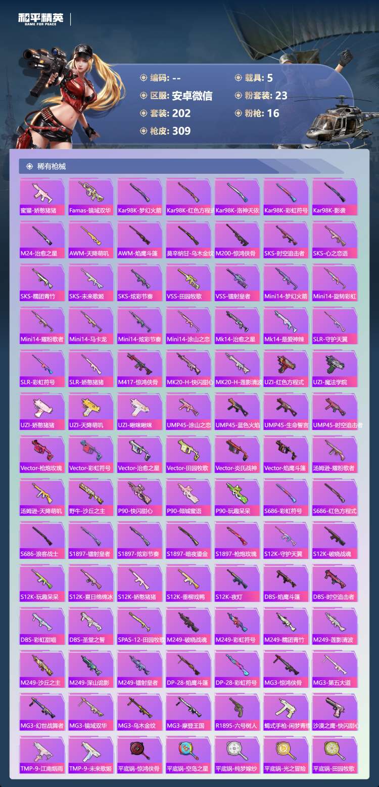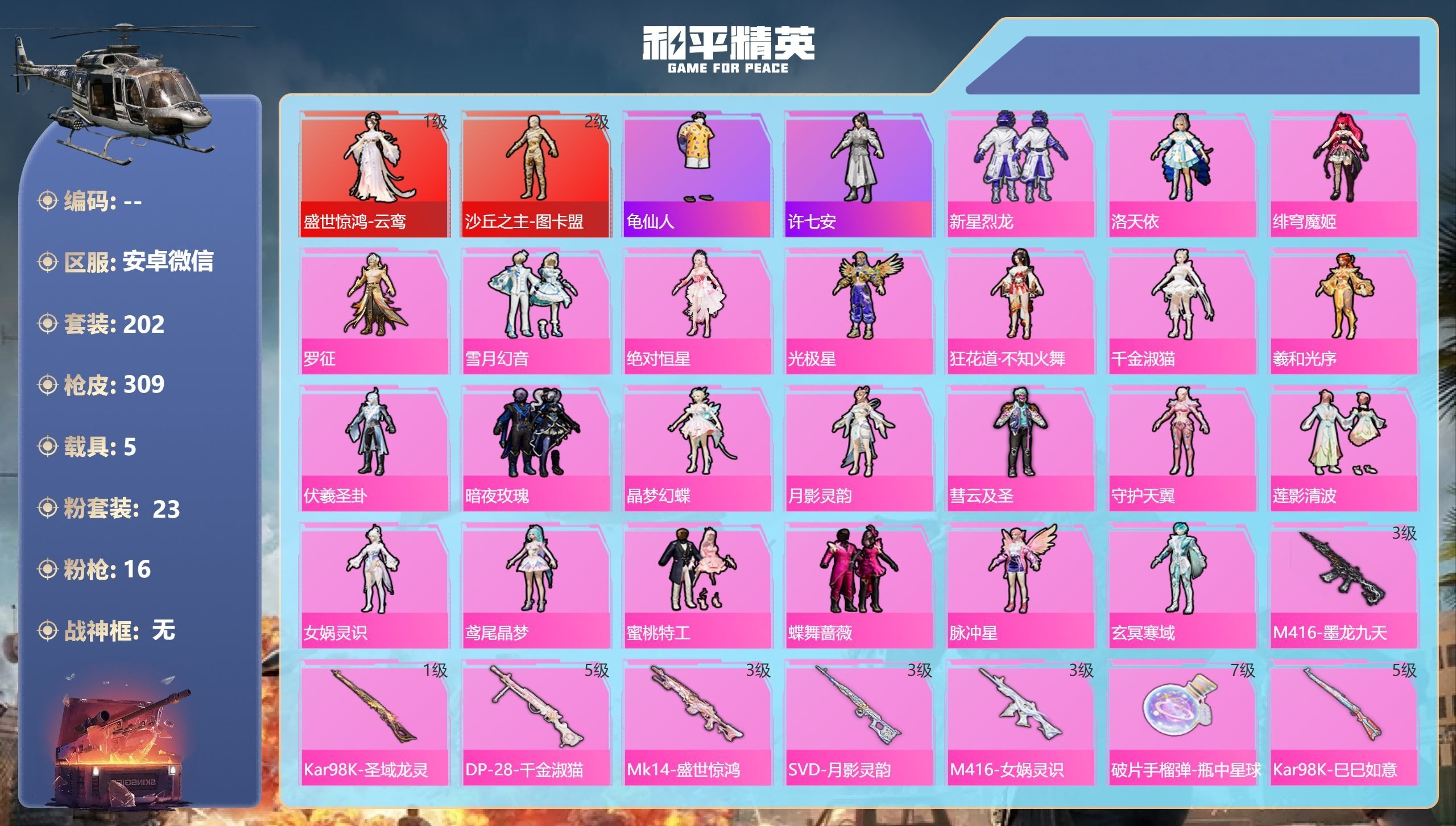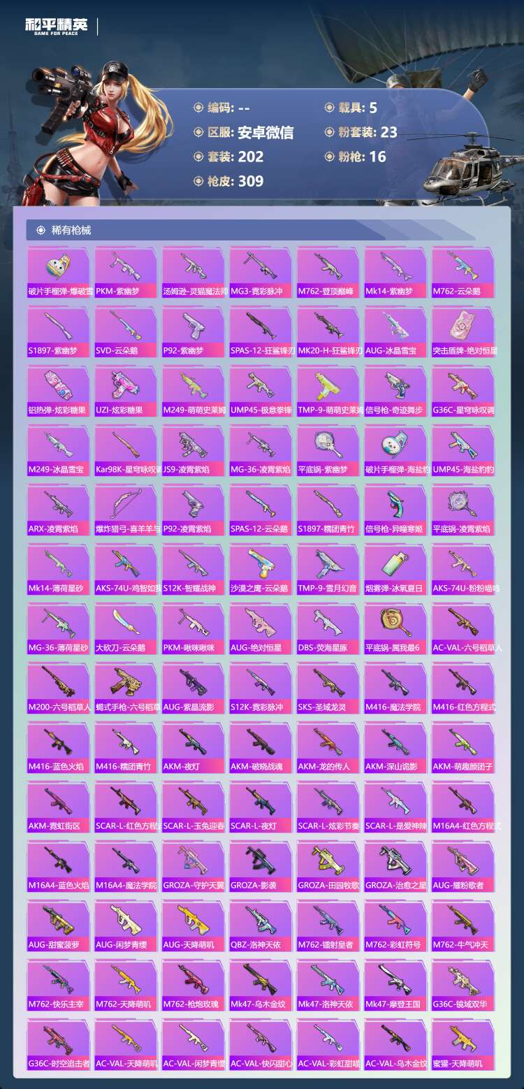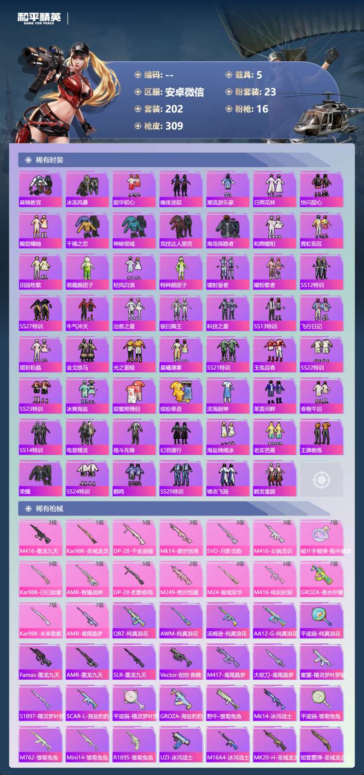 a4271/安卓微/16王牌印记-2红装-23粉装-16特效枪-5载具-113864热力值-202