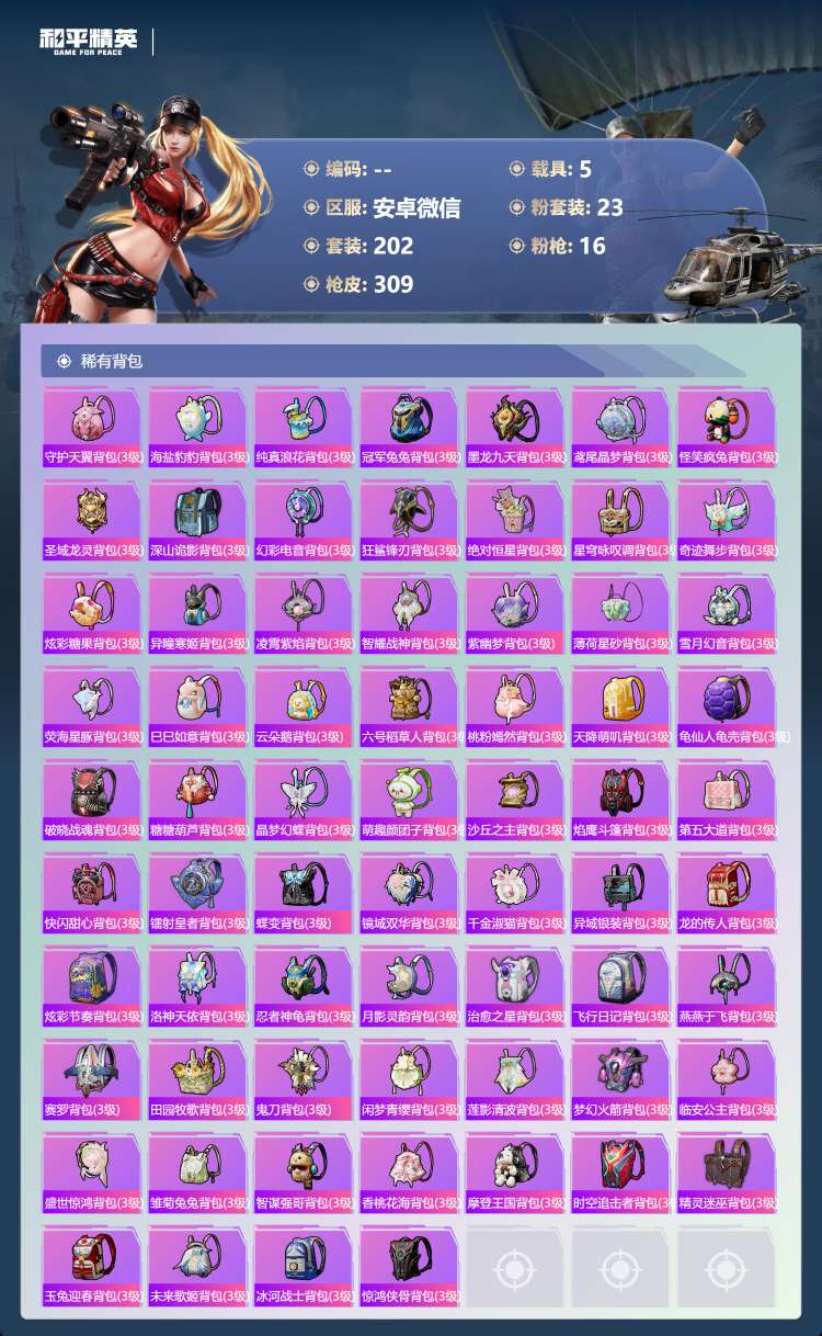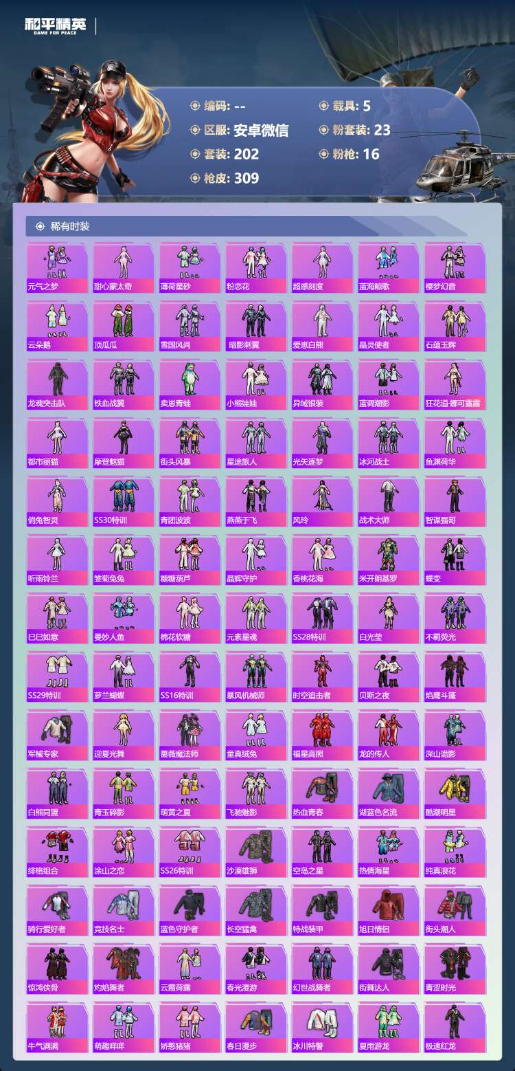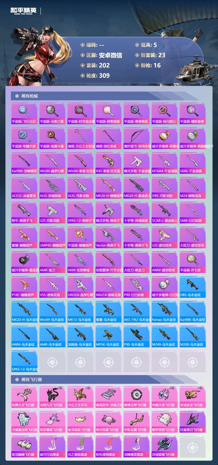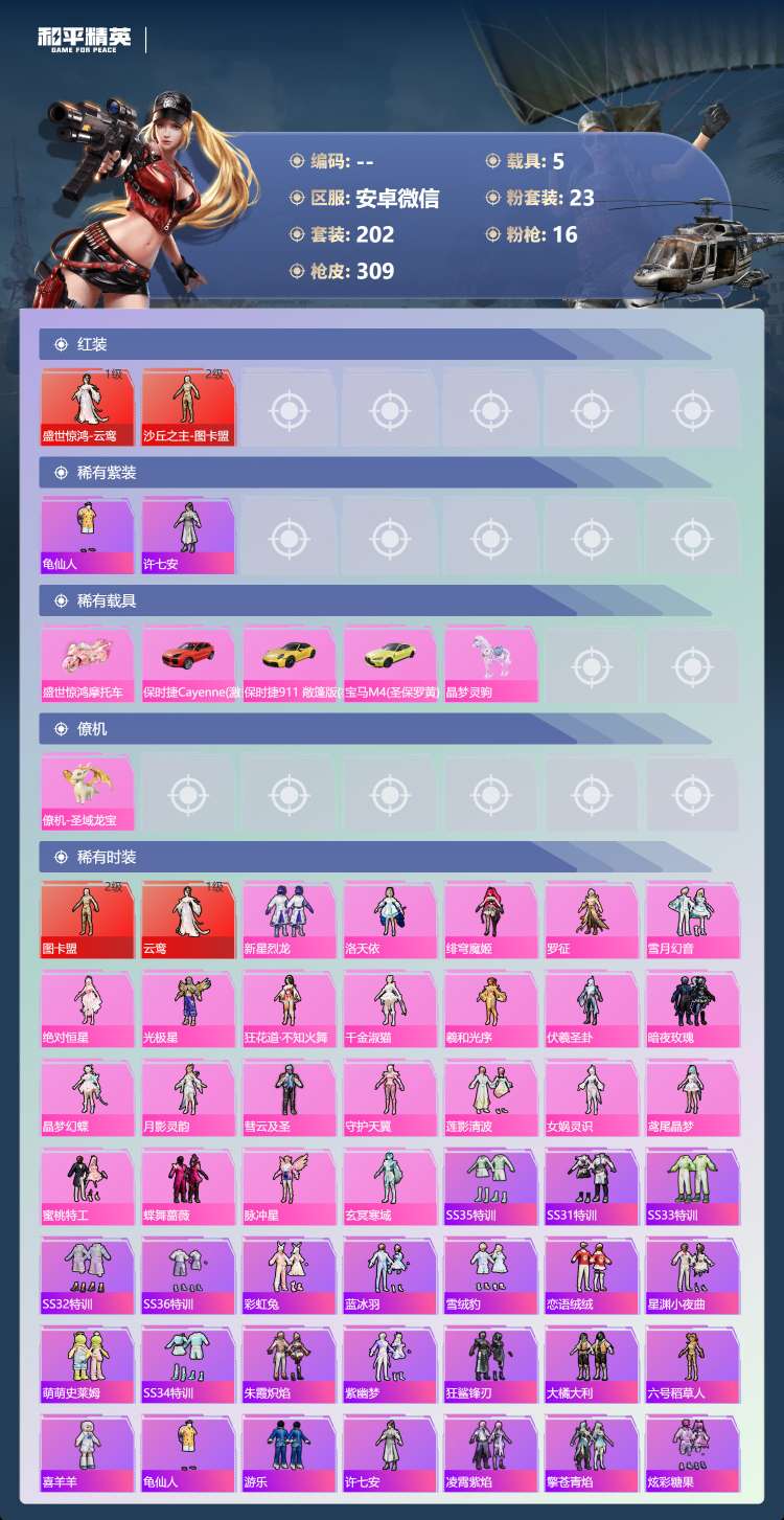 a4271/安卓微/16王牌印记-2红装-23粉装-16特效枪-5载具-113864热力值-202