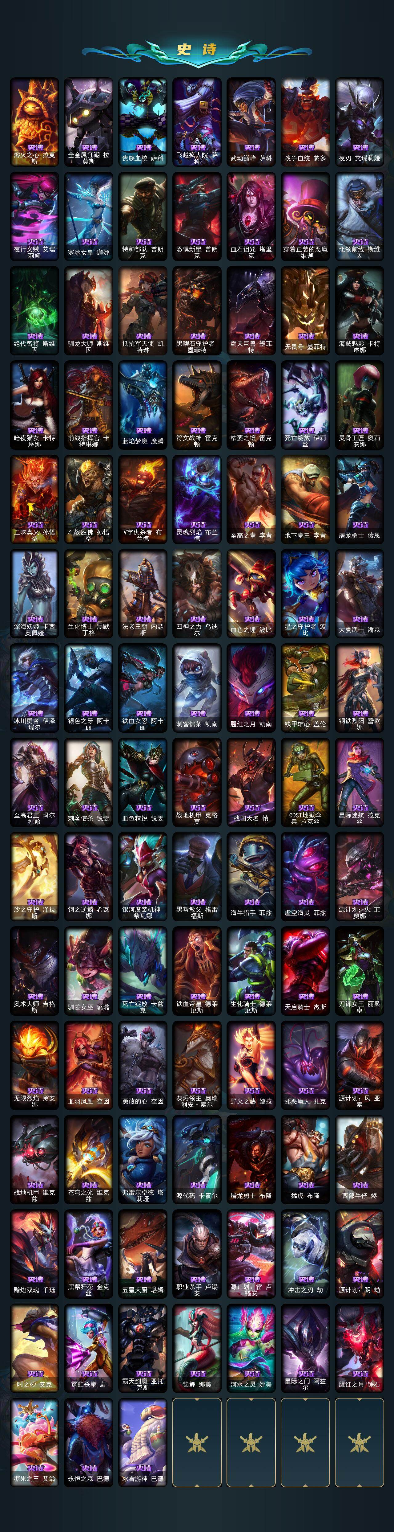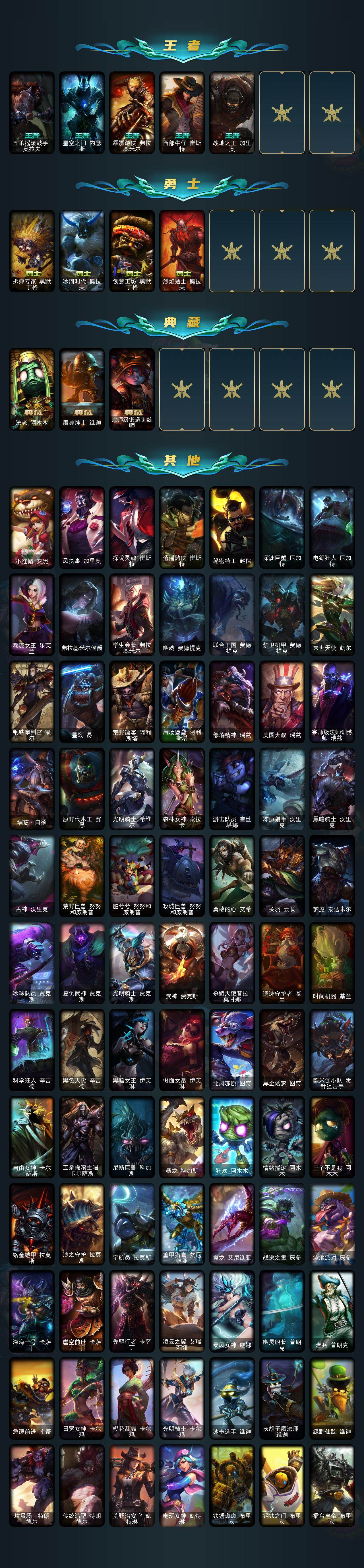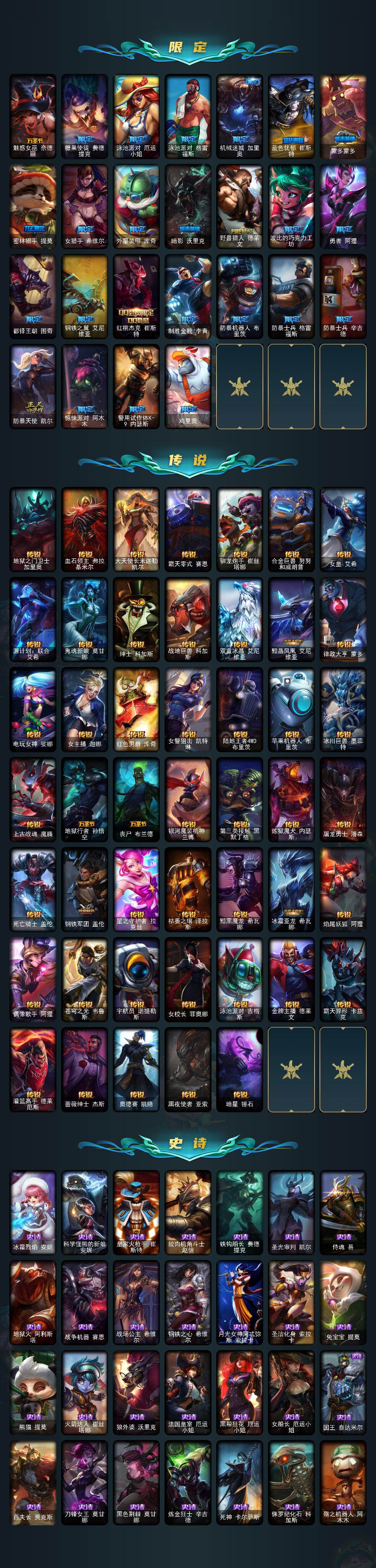172英雄/478皮肤/1终极/4神话/92限定/4臻彩/127炫彩/47传说/129史诗