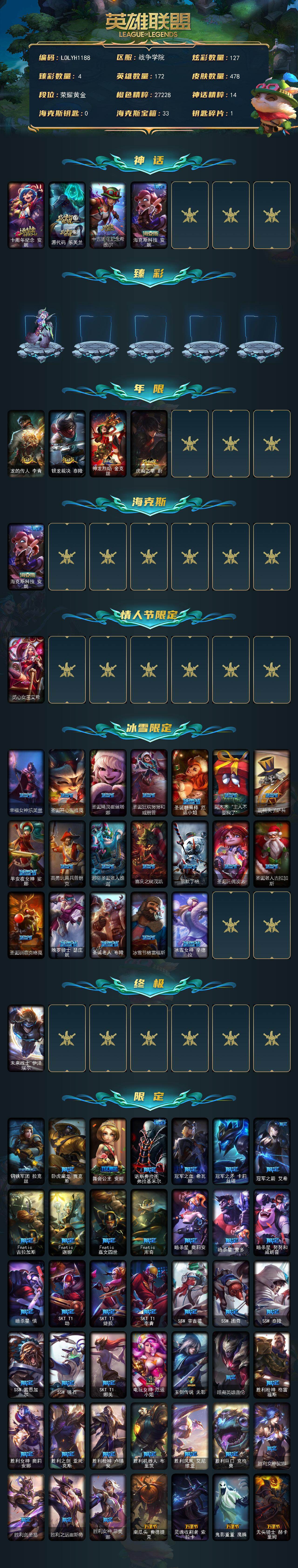 【LOLYH1188】172英雄/478皮肤/1终极/4神话/92限定/4臻彩/127炫彩/47传说/129史诗/黄金/十周年纪念安妮/源代码乐芙兰/十五周年纪念希维尔/海克斯科技安妮/天龙之子卡莎飞龙乘云/墨之影武者亚索金墨耀影/魔女阿卡丽虚荣/净雪之月莫甘娜冬虹/龙的传人李青/银龙裁决泰隆/神龙烈焰金克丝/虎痴之拳蔚/觅心女王艾希/幸福女神乐芙兰/圣诞开心鬼提莫/圣诞精灵崔丝塔娜/圣诞狂欢努努和威朗普/圣诞糖果棒厄运小姐/阿木木“主人不要我了”/胡桃夹子萨科/平安夜女神娑娜/英勇玩具兵普朗克