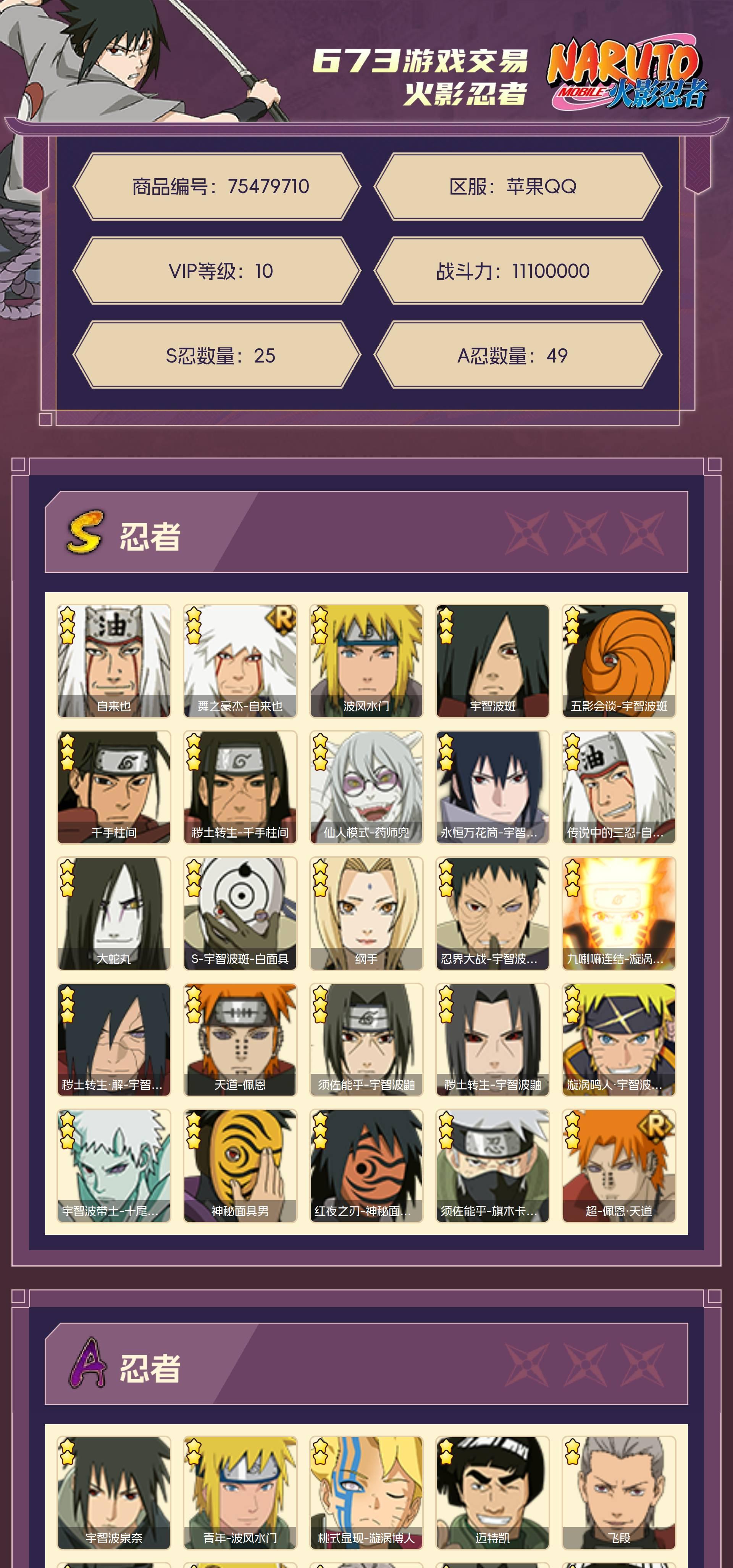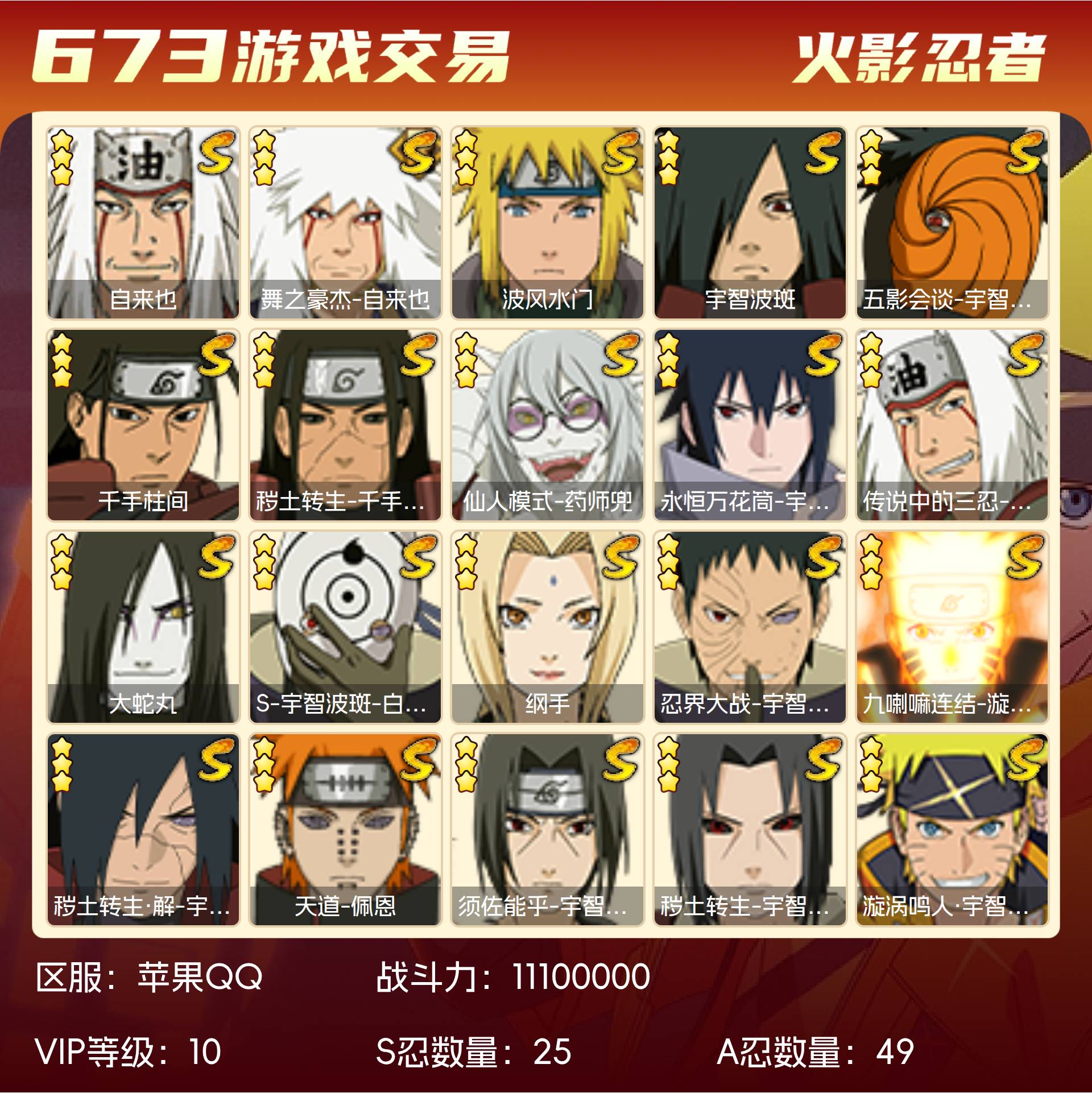 角色等级148 金币500 战斗力11100000 S忍25 A忍49 10