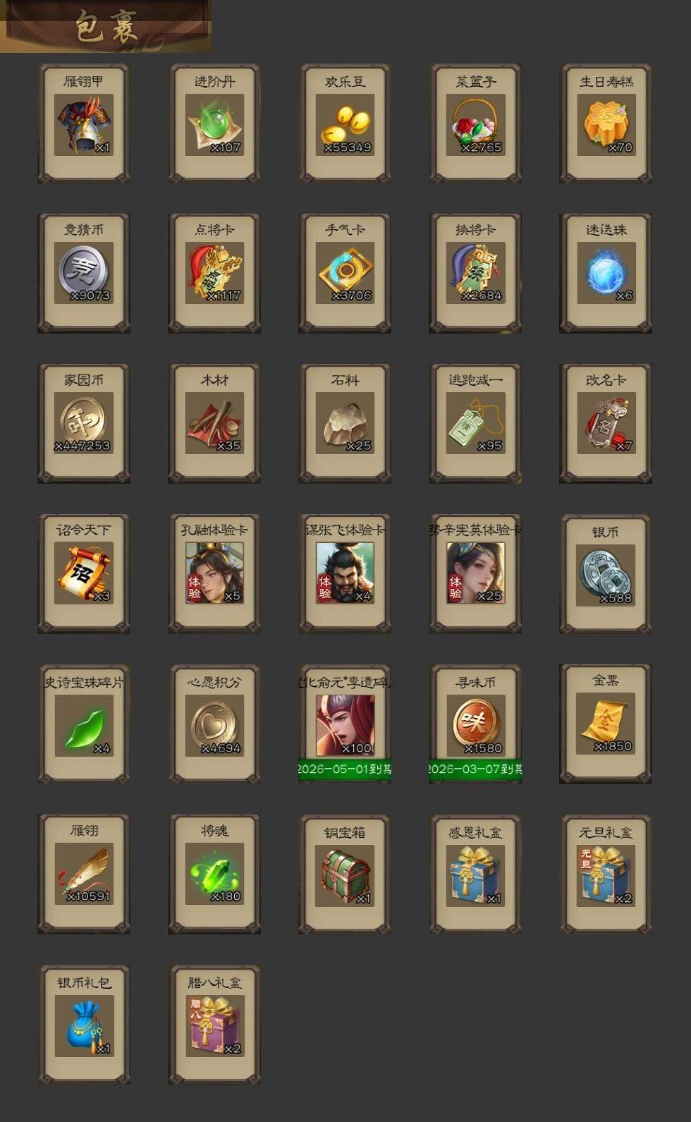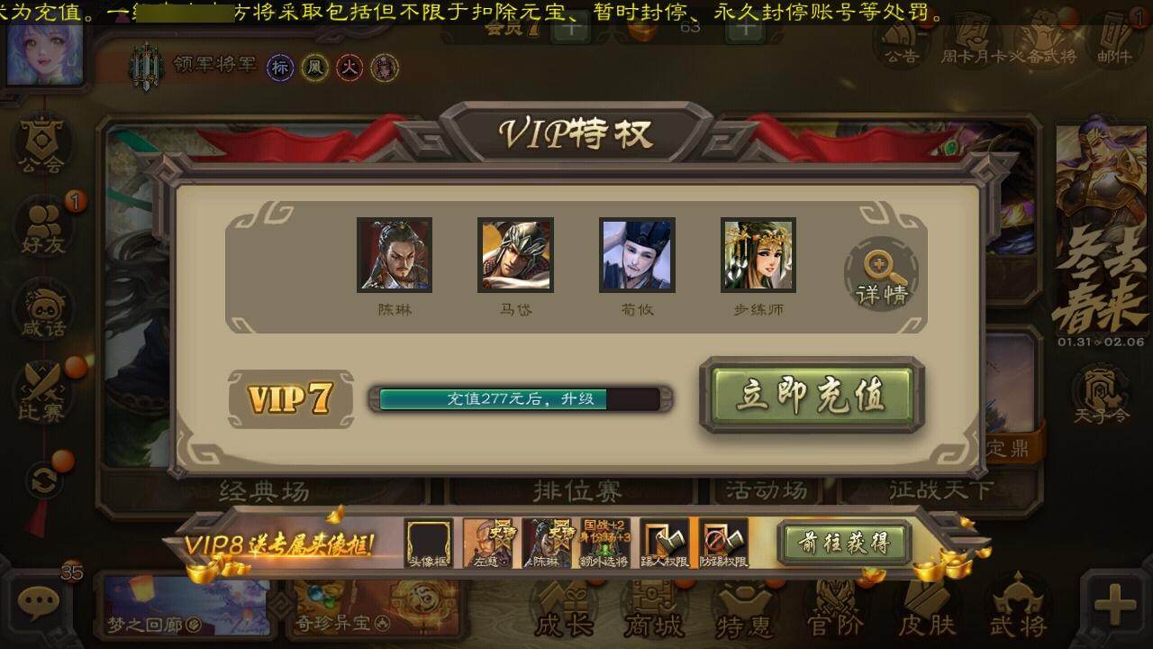 官阶:领军将军;VIP等级:VIP7;史诗武将数量:15;动态皮肤数量:8;武