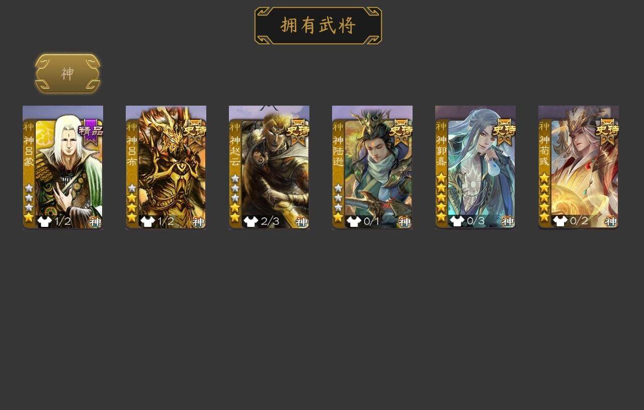 神吕布,神赵云,神陆逊,神郭嘉,神荀彧,星周不疑,王元姬,界钟会,界曹真,曹婴,曹纯,戏志才,蒋干,谋郭淮,程昱,谋赵云,谋马超,诸葛瞻,张星彩,沙摩柯,谯周,界黄忠,花鬘,董允,