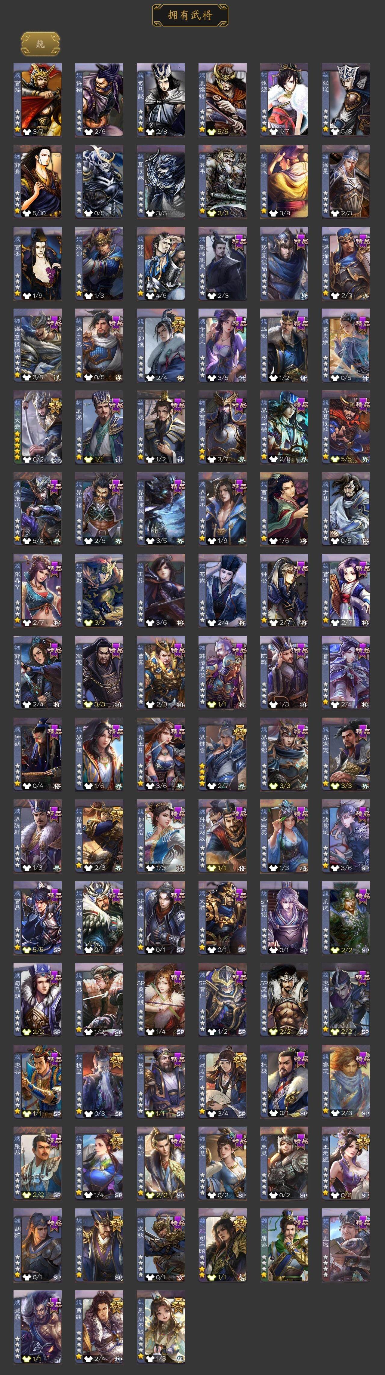 官阶:大将军;VIP等级:VIP9;史诗武将数量:41;动态皮肤数量:31;武将总数:337;史诗宝珠数量:57;将魂数量:4205;神将:5;魏国史诗武将:17;蜀国史诗武将:9;吴国史诗武将:7;群史诗武将:12