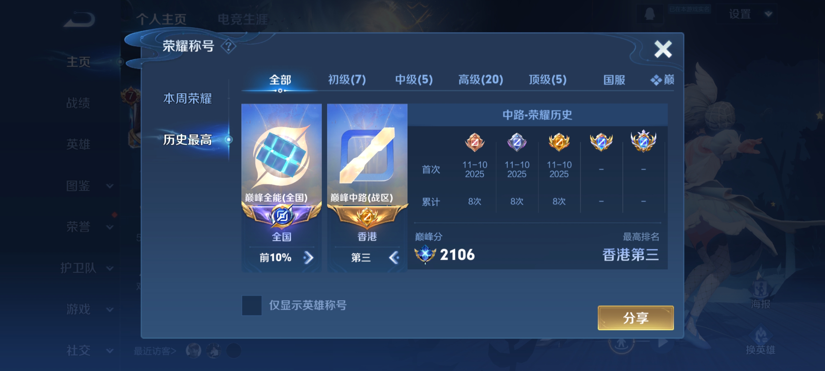 2100巅峰头像框,5小国公主号,外加吃鸡2车1飞机,王者还差800就贵族8