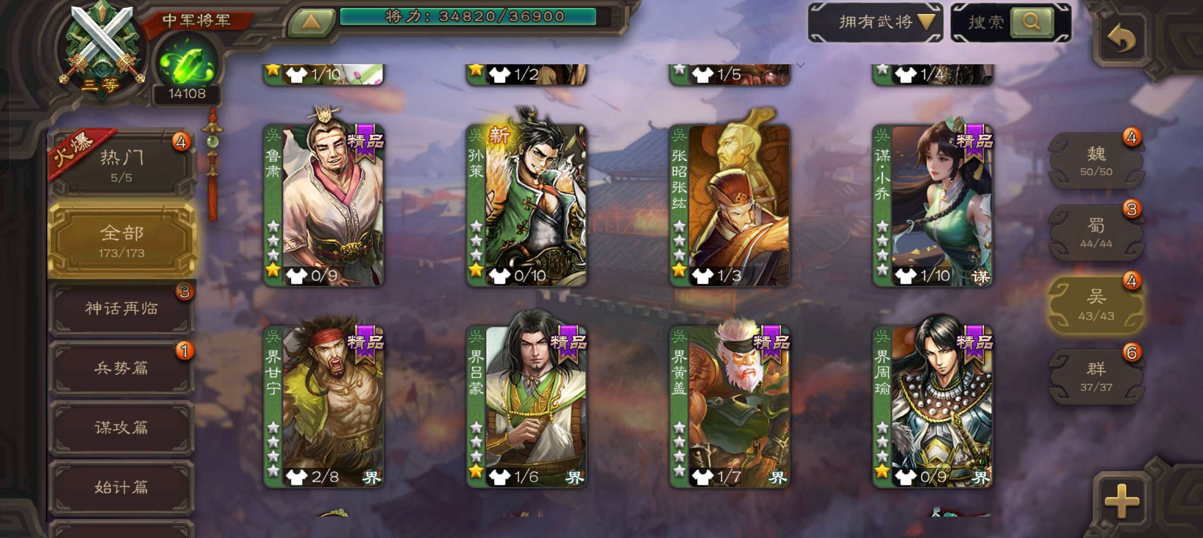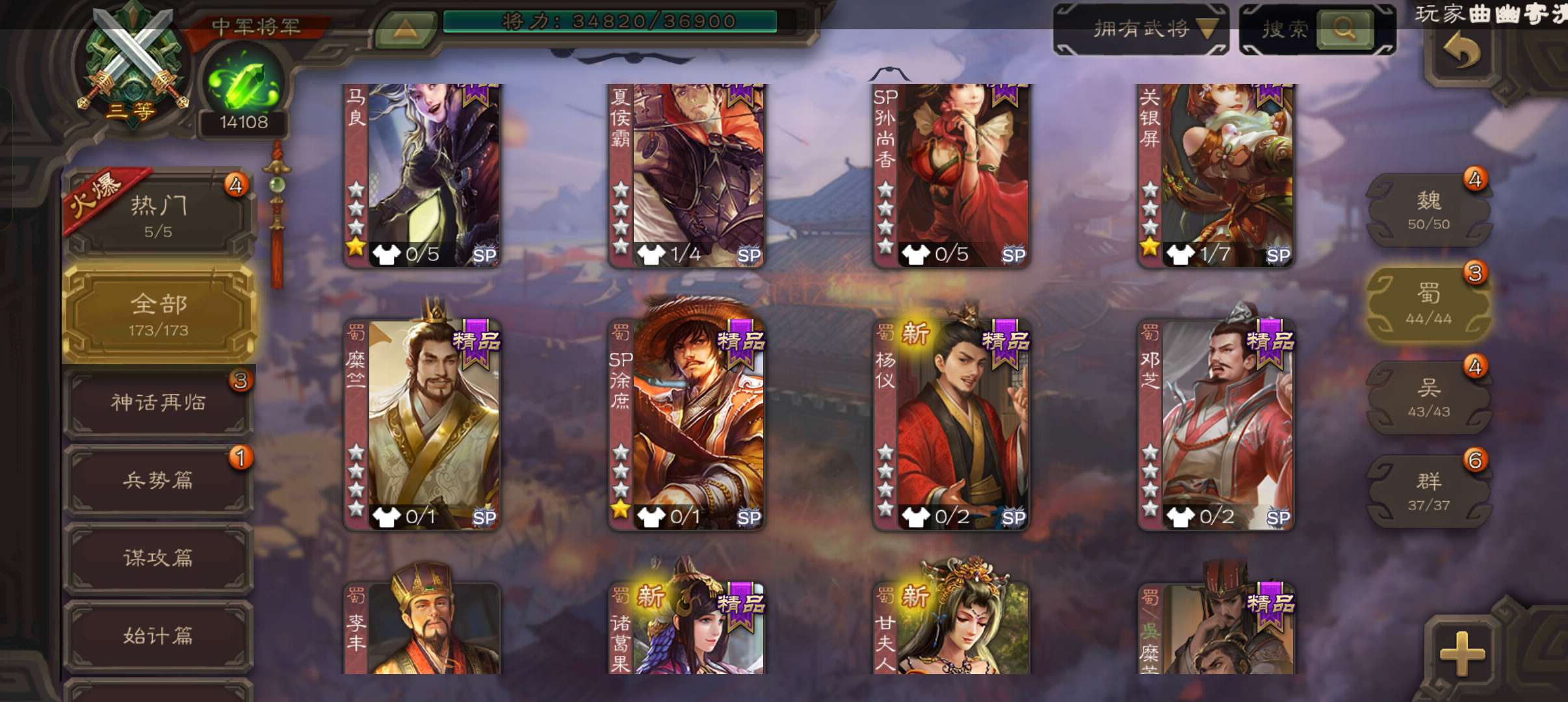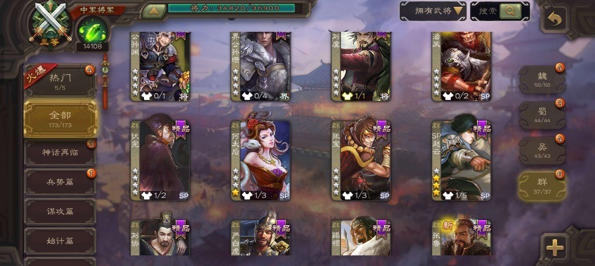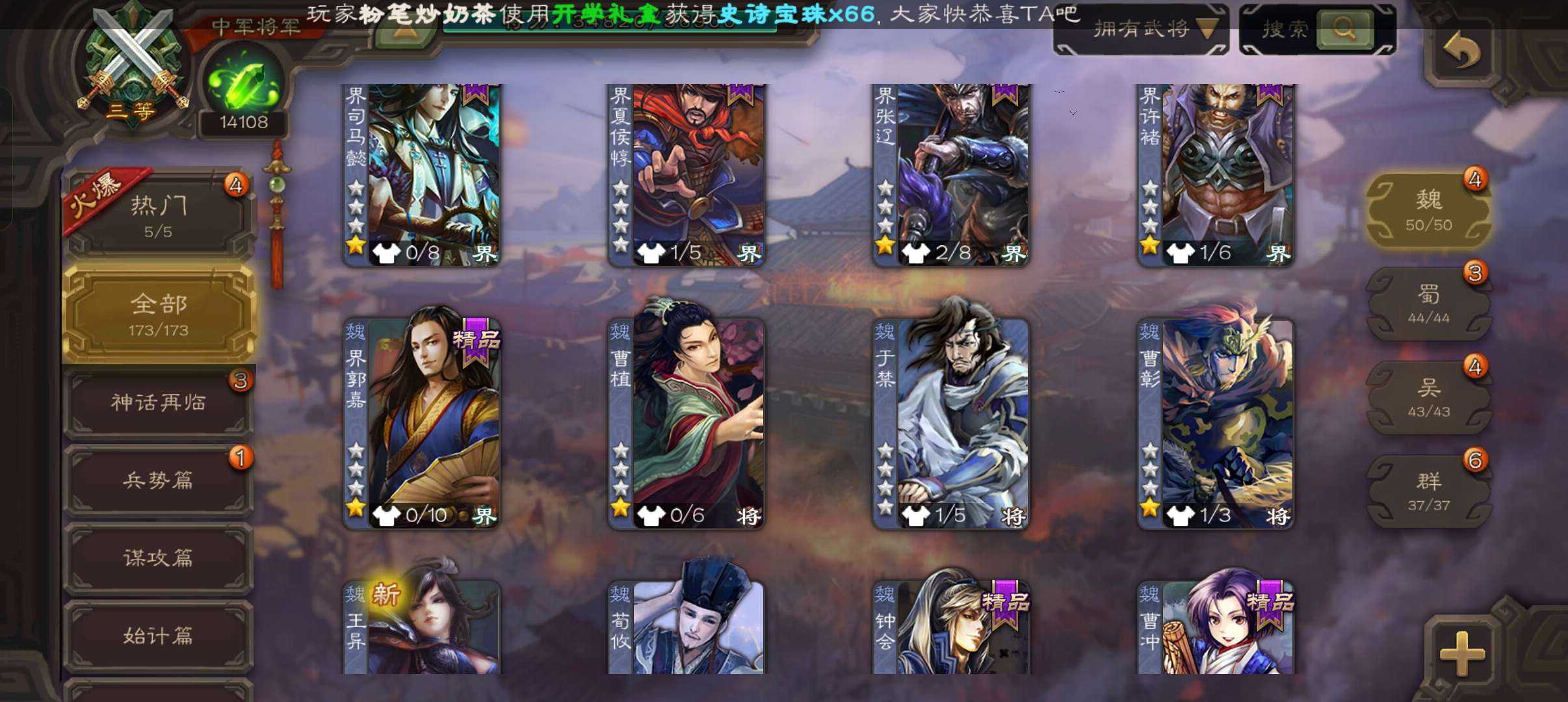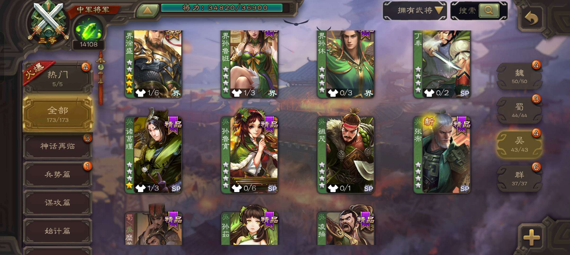 中军将军,8万羽毛1.4万将魂,大宝界徐盛沮授花鬘程昱4史诗,sp赵云谋卢植关银屏谋高顺鲁肃173将