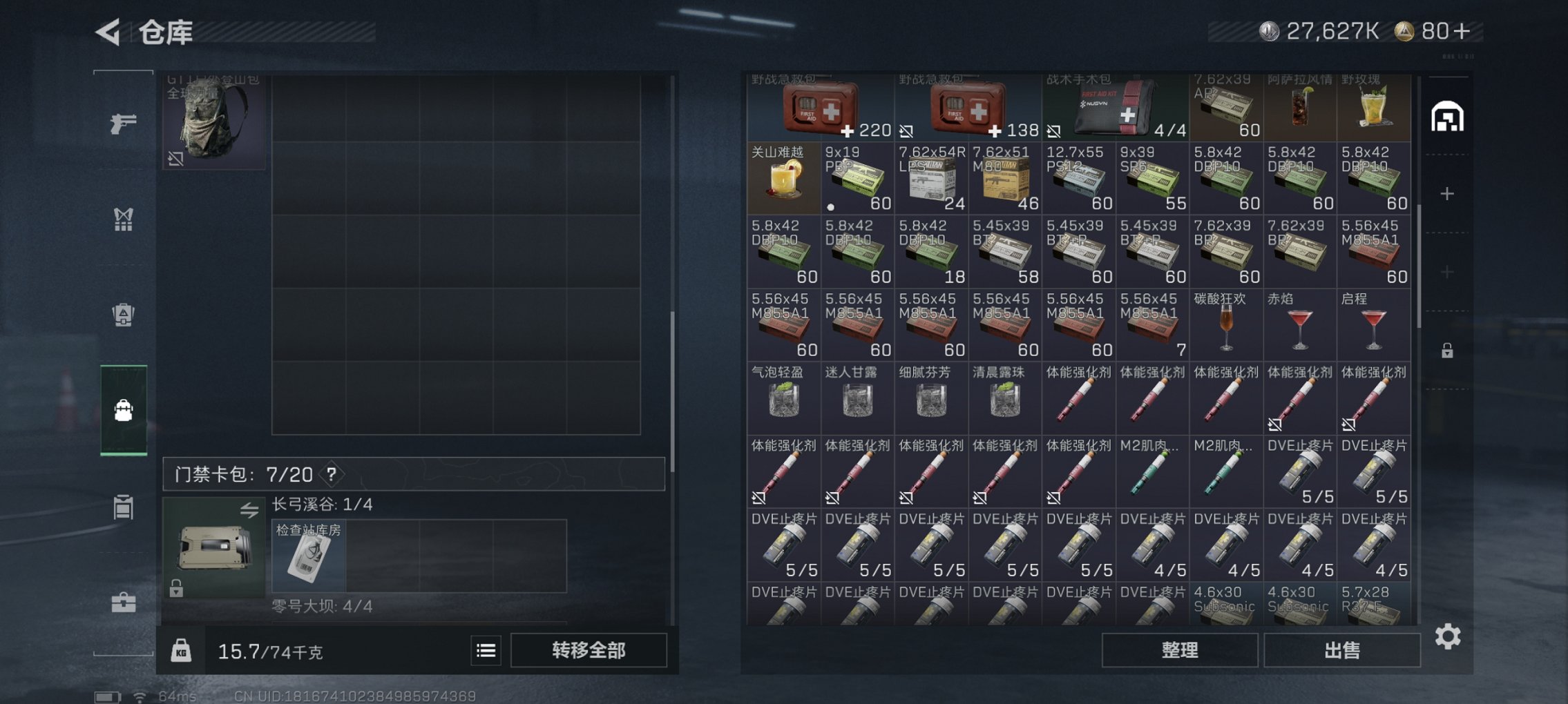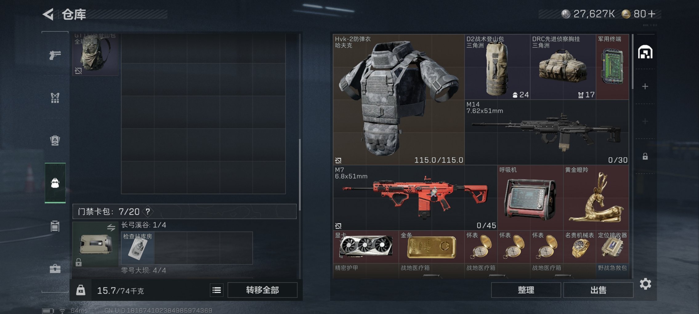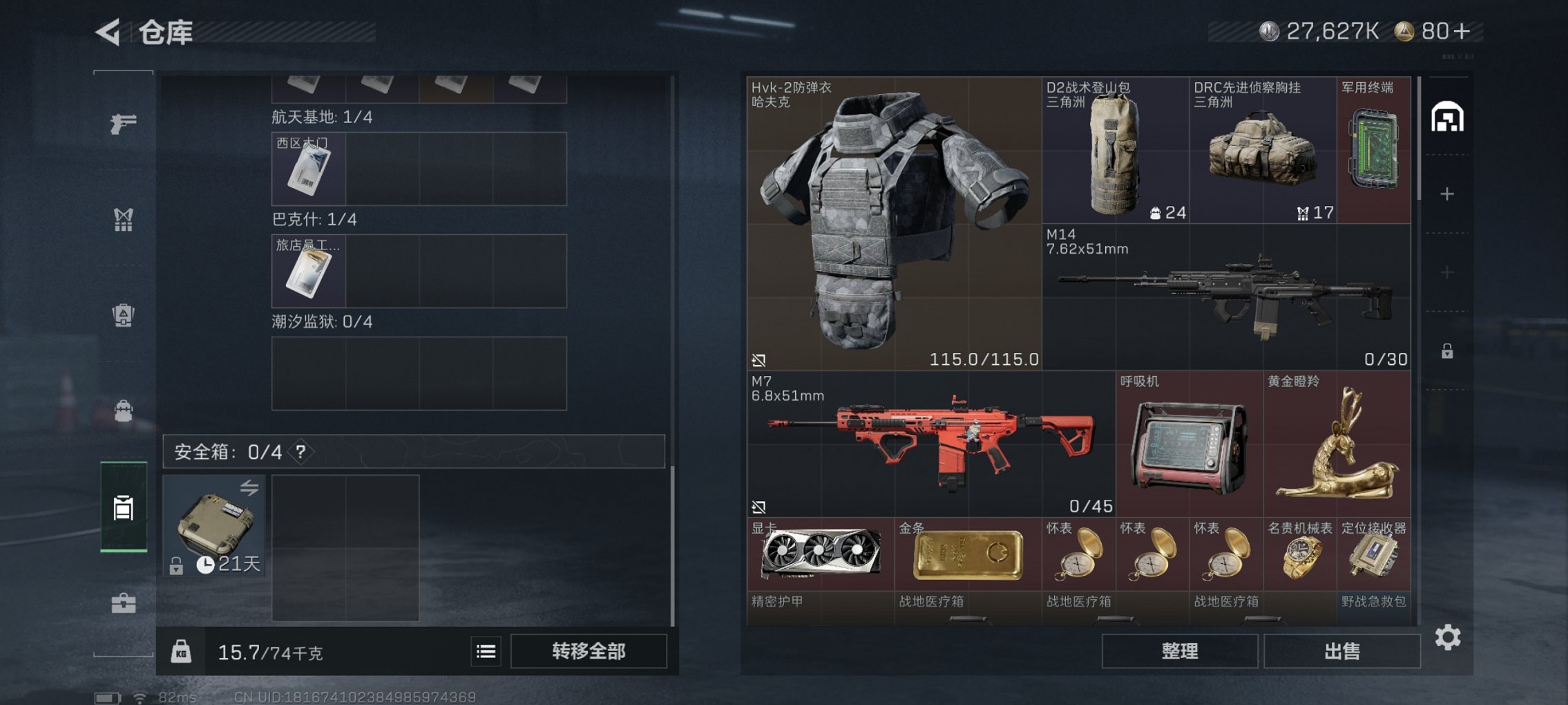 总资产44M,哈夫币27,627K,行动等级:38,仓库等级:3,训练中心等级:3,靶场等级:2,枪皮:22