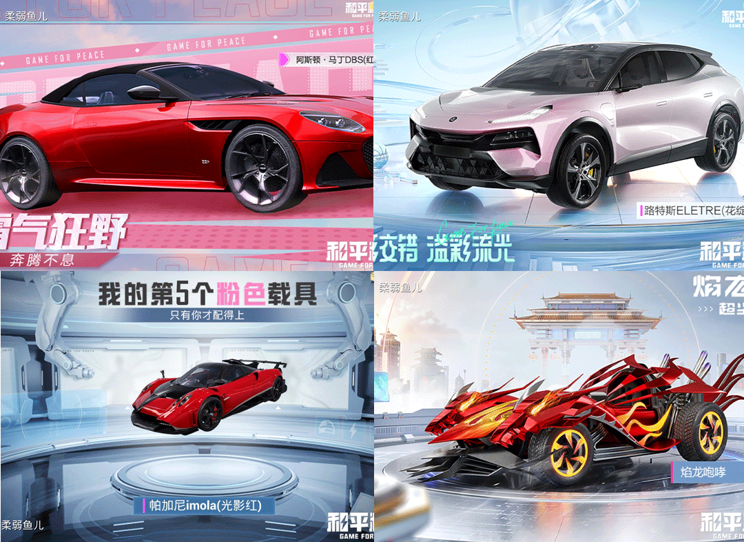 载具5:玛莎拉蒂Quattroporte(夜幕蓝),,,阿斯顿·马丁DBS(红),,路特斯ELETRE(花绽灰),,帕加尼imola(光影红),,焰龙咆哮,