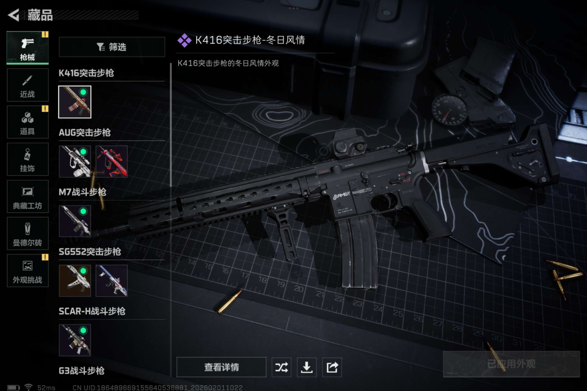 【步枪】SG552突击步枪-运动员,SCAR-H战斗步枪-囚徒,AUG突击步枪-蝮蛇,SCAR-H战斗步枪-荣耀列队,CAR-15突击步枪-前沿科技,M4A1突击步枪-海色,PTR-32突击步枪
