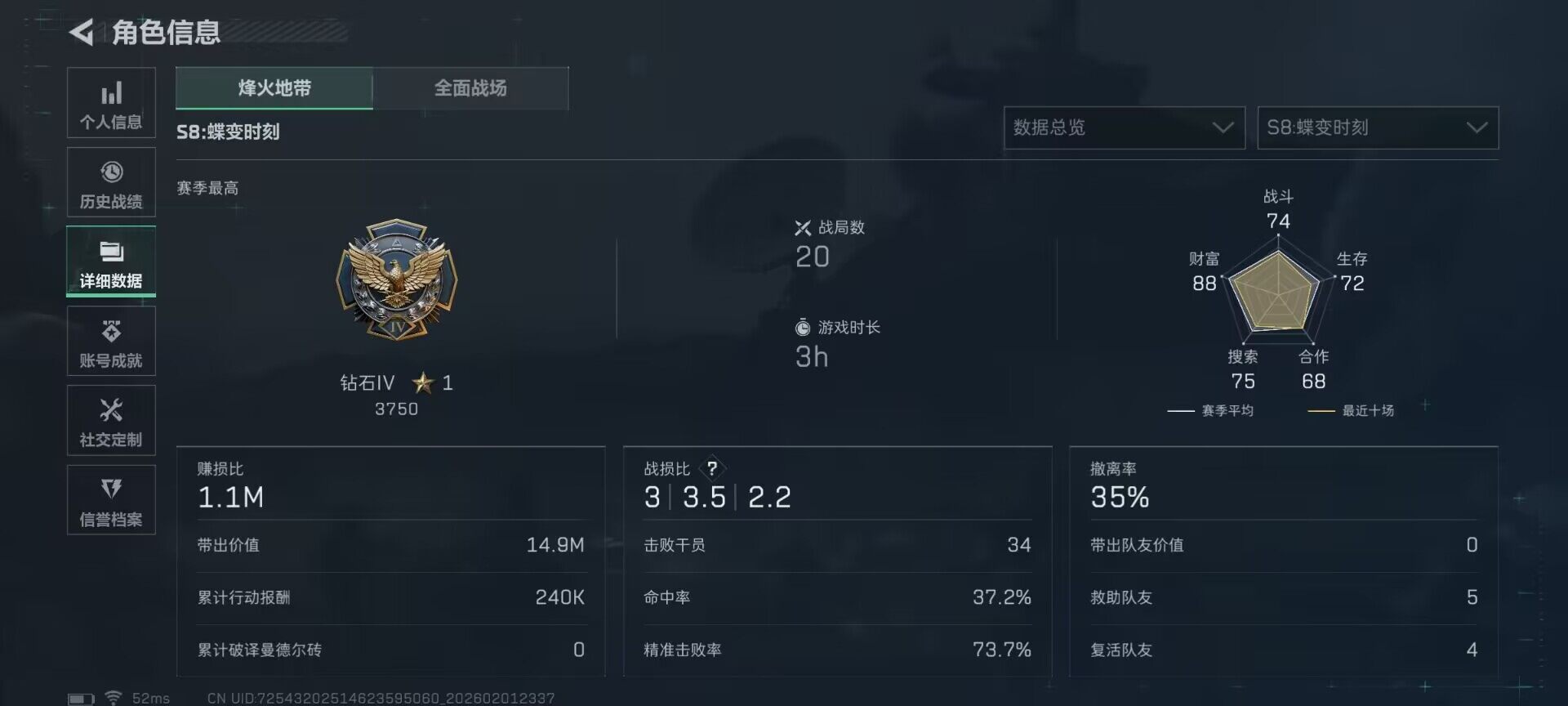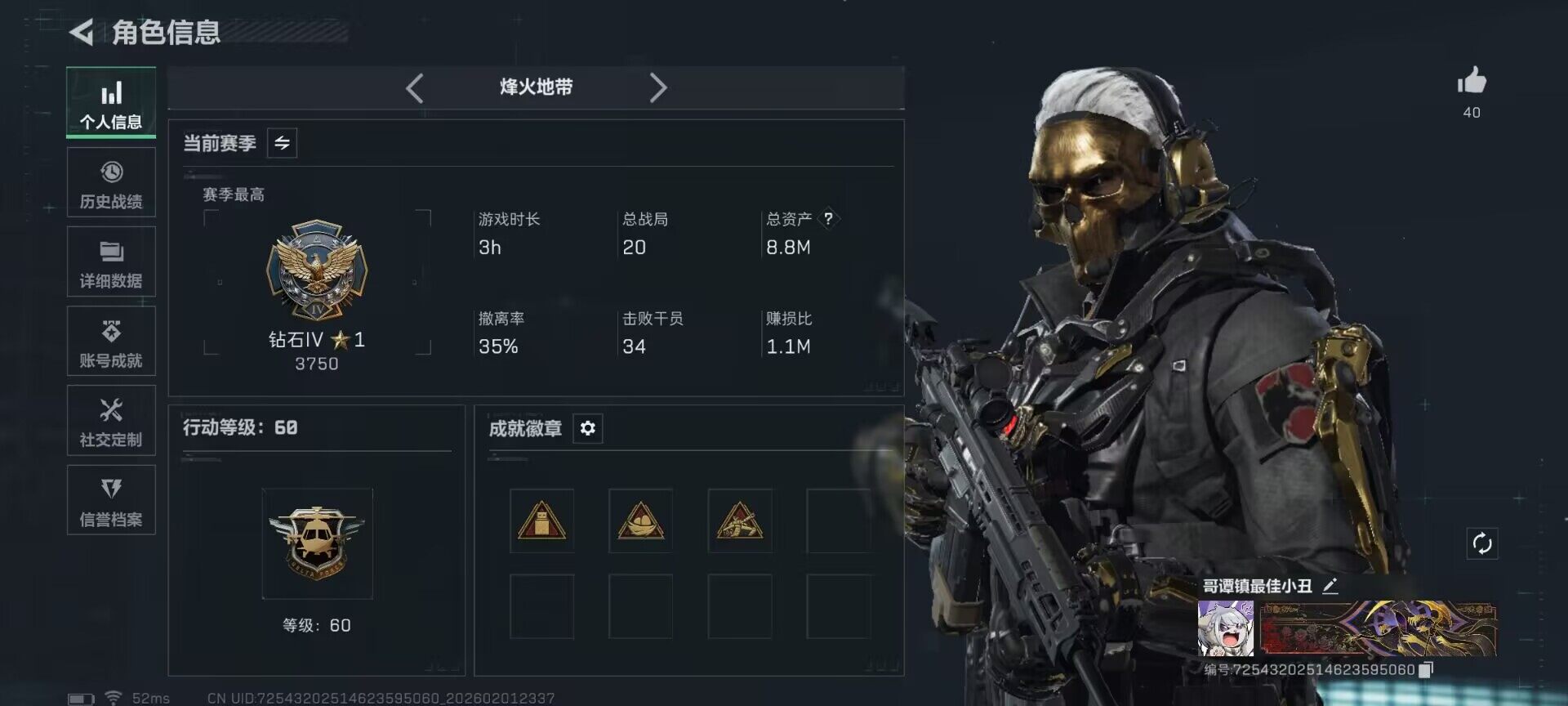 总资产(M):8M/哈夫币(K):583K/传说枪皮数:35/全面战场等级:50_段位:尉官/烽火地带等级:60_段位:钻石/