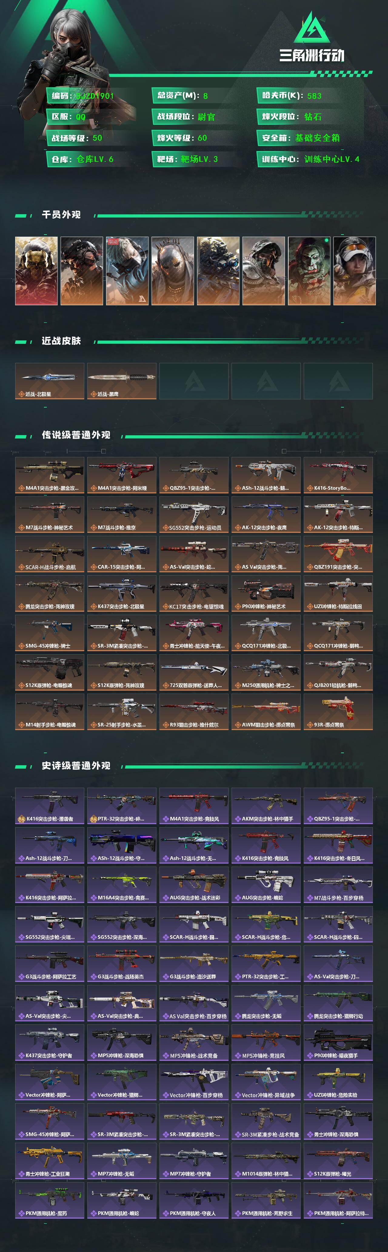 【SJZD1901】总资产(M):8M/哈夫币(K):583K/哈夫币(K):583K/传说枪皮数:35/全面战场等级:50_段位:尉官/烽火地带等级:60_段位:钻石/红狼-蚀金玫瑰/威龙-铁面判官/蜂医-送葬人·无题密令/牧羊人-街头之王/无名-夜鹰/深蓝-不破誓约/红狼-电锯惊魂/露娜-金牌射手/近战-北极星/近战-黑鹰/M4A1突击步枪-蚀金玫瑰/M4A1突击步枪-阿米娅/QBZ95-1突击步枪-破军/ASh-12战斗步枪-鹅鸭杀/K416突击步枪-StoryBoard/M7战斗步枪-神