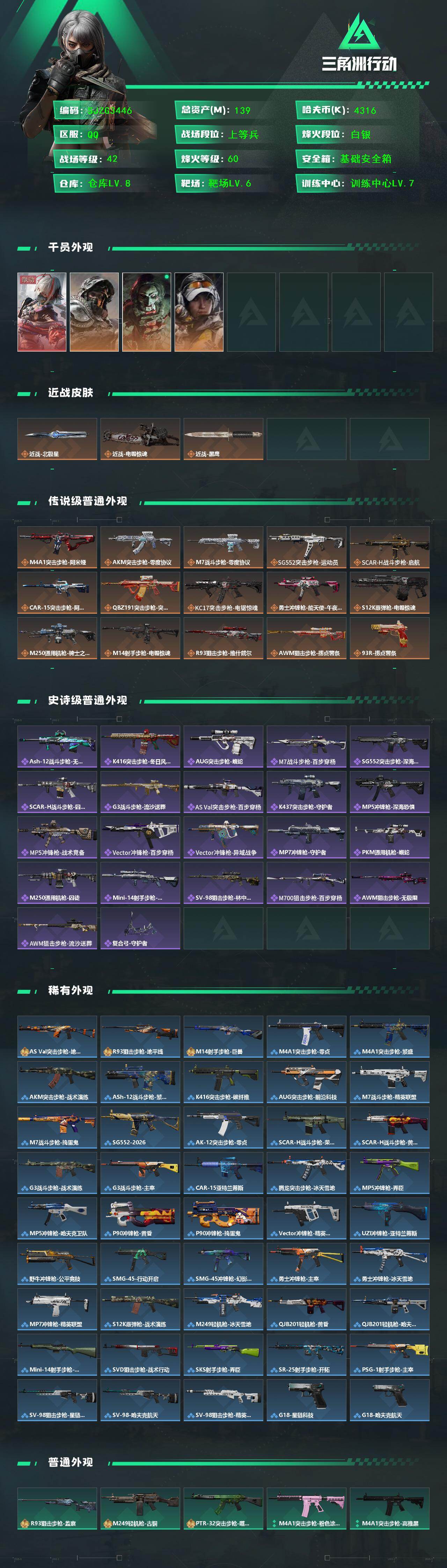 总资产(M):139M/哈夫币(K):4316K/传说枪皮数:15/全面战场等级:42_段位:上等兵/烽火地带等级:60_段位:白银