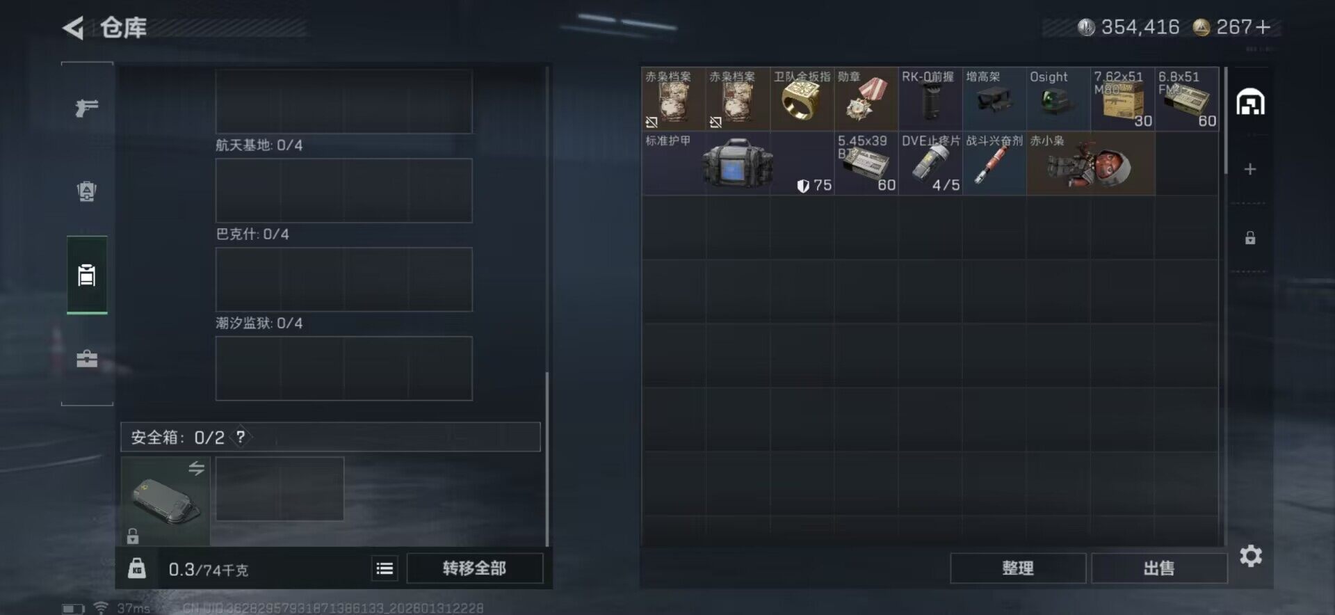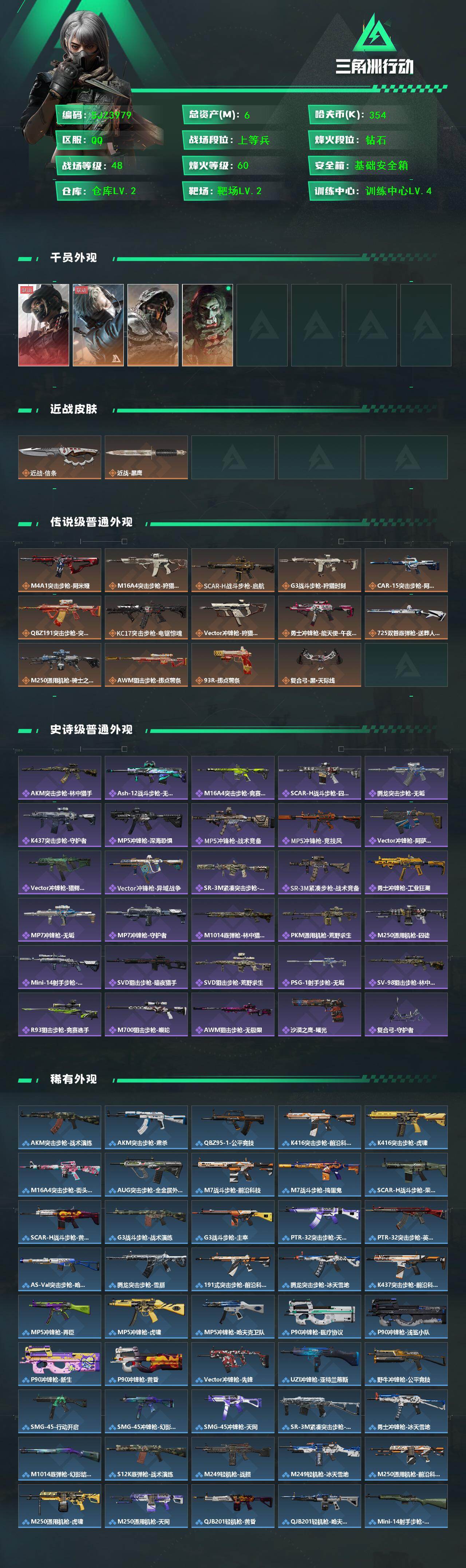 总资产(M):6M/哈夫币(K):354K/传说枪皮数:14/全面战场等级:48_段位:上等兵/烽火地带等级:60_段位:钻石