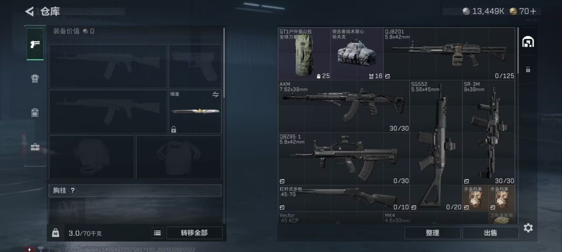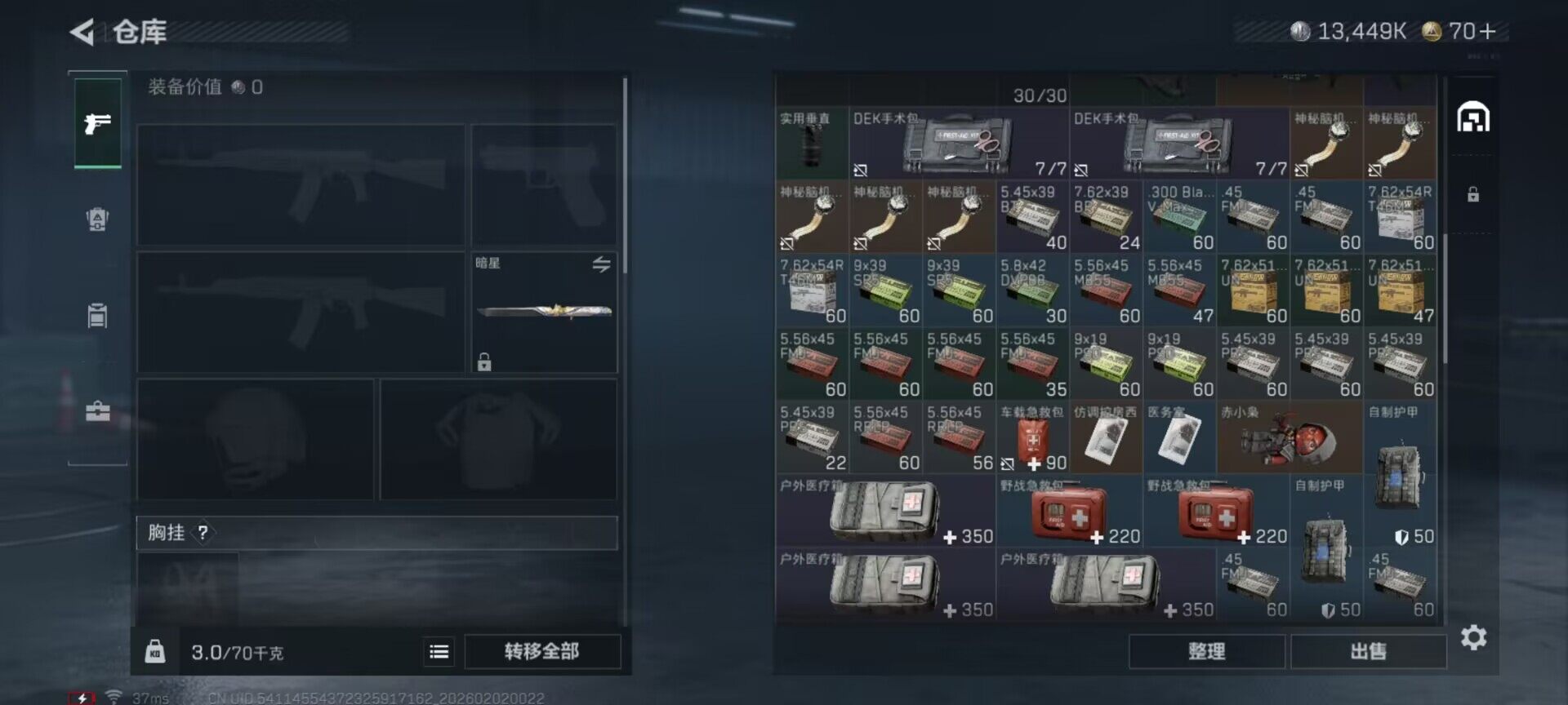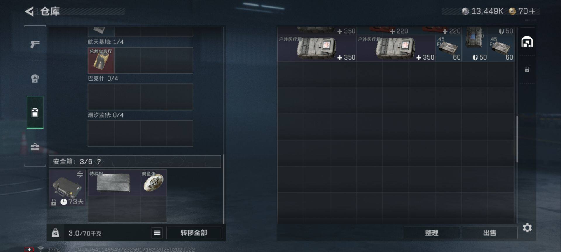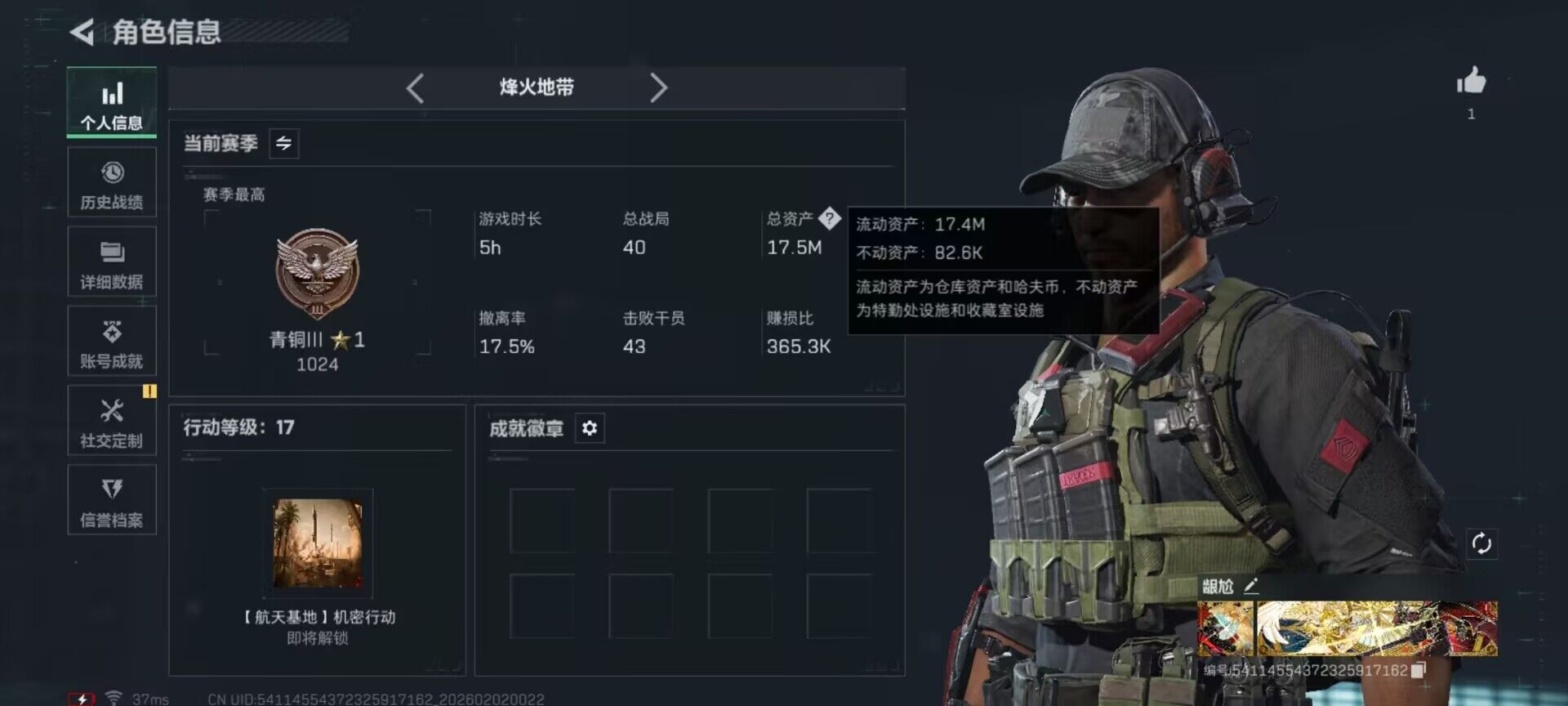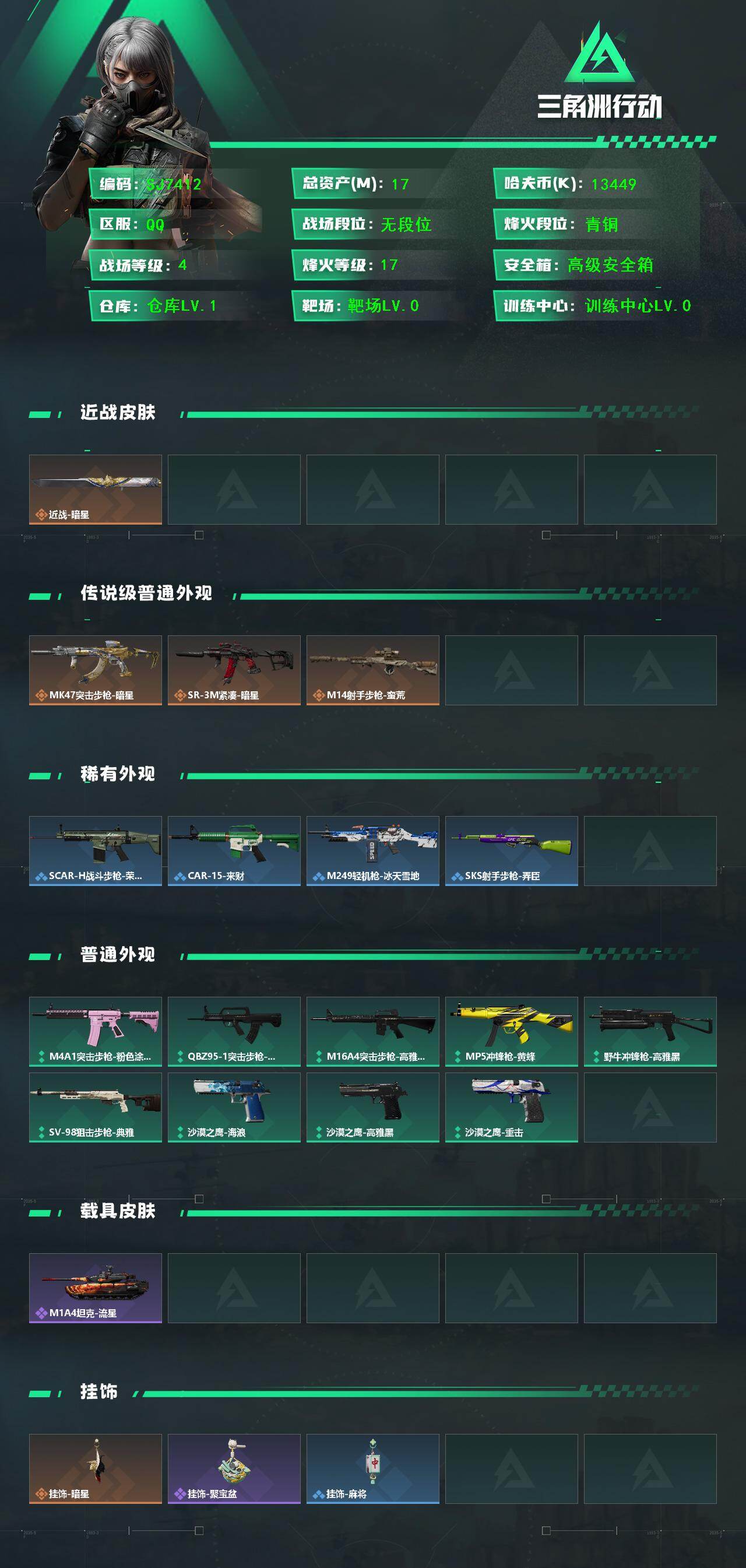总资产(M):17M/哈夫币(K):13449K/传说枪皮数:3/全面战场等级:4_段位:无段位/烽火地带等级:17_段位:青铜/