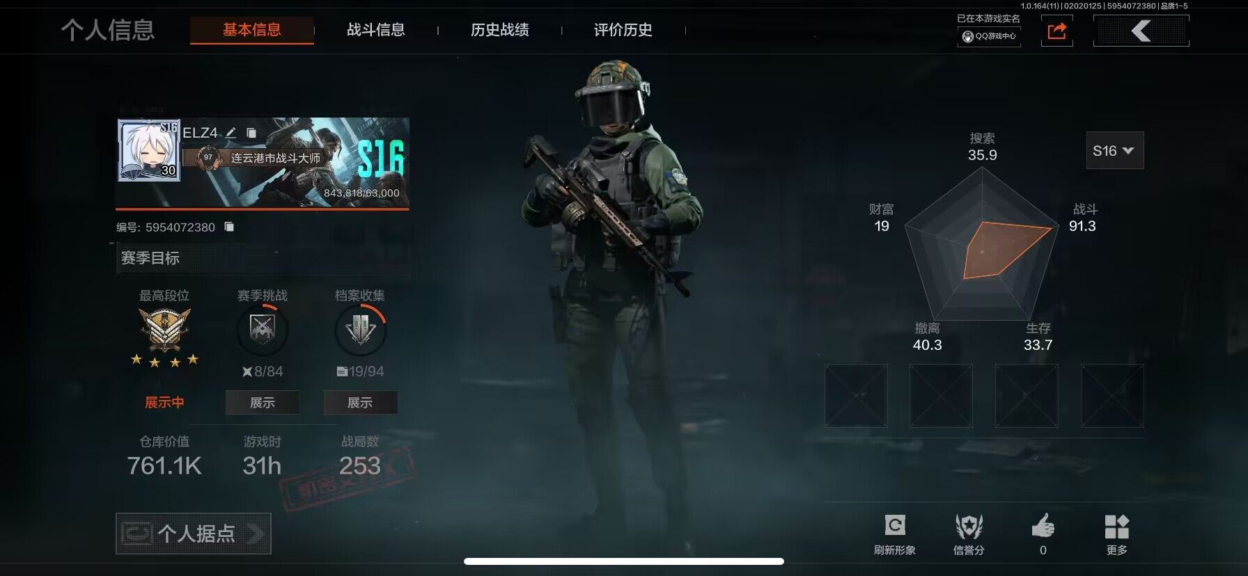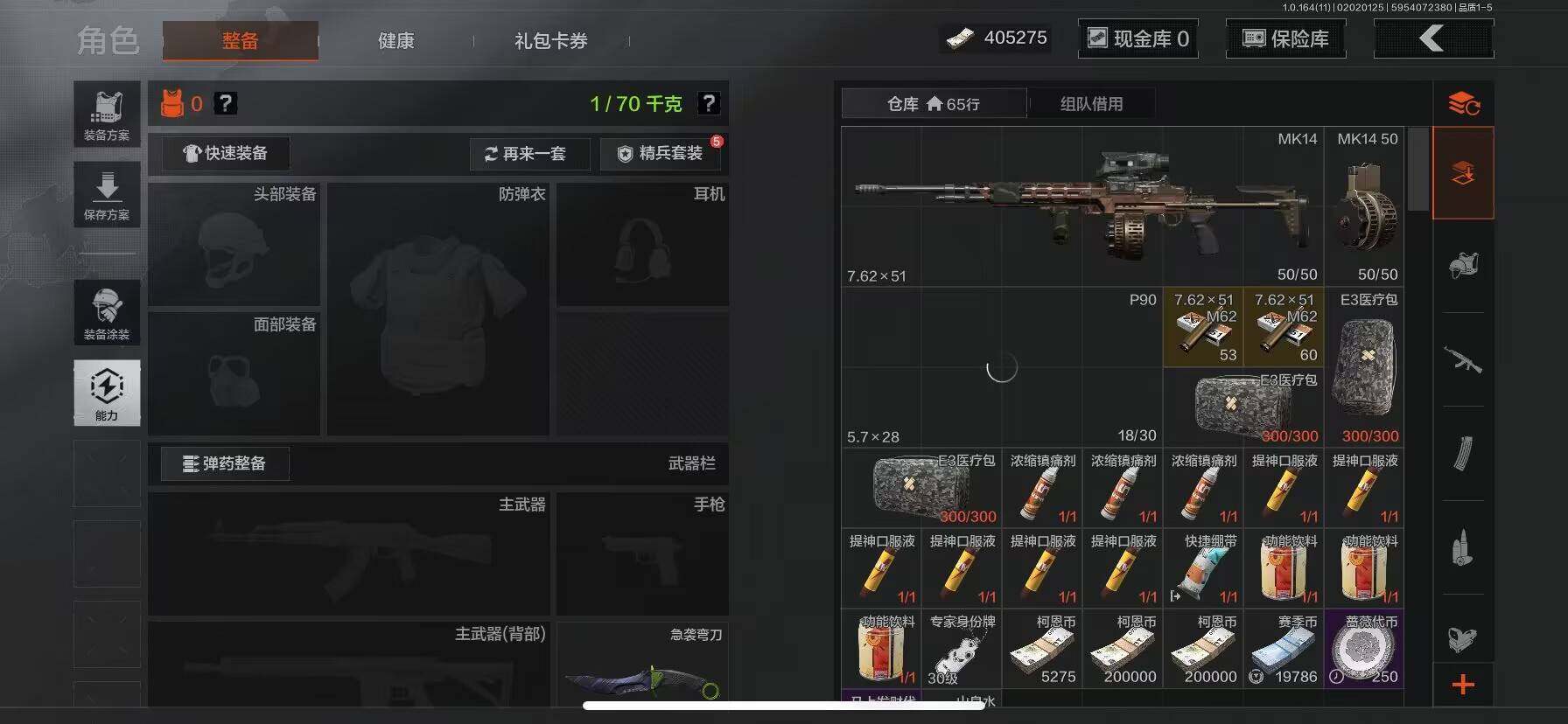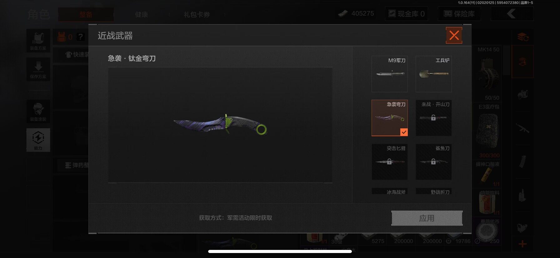 【AQZG1142】等级:30/段位:暗区传说/柯恩币:405275/急袭弯刀/林中人FAL