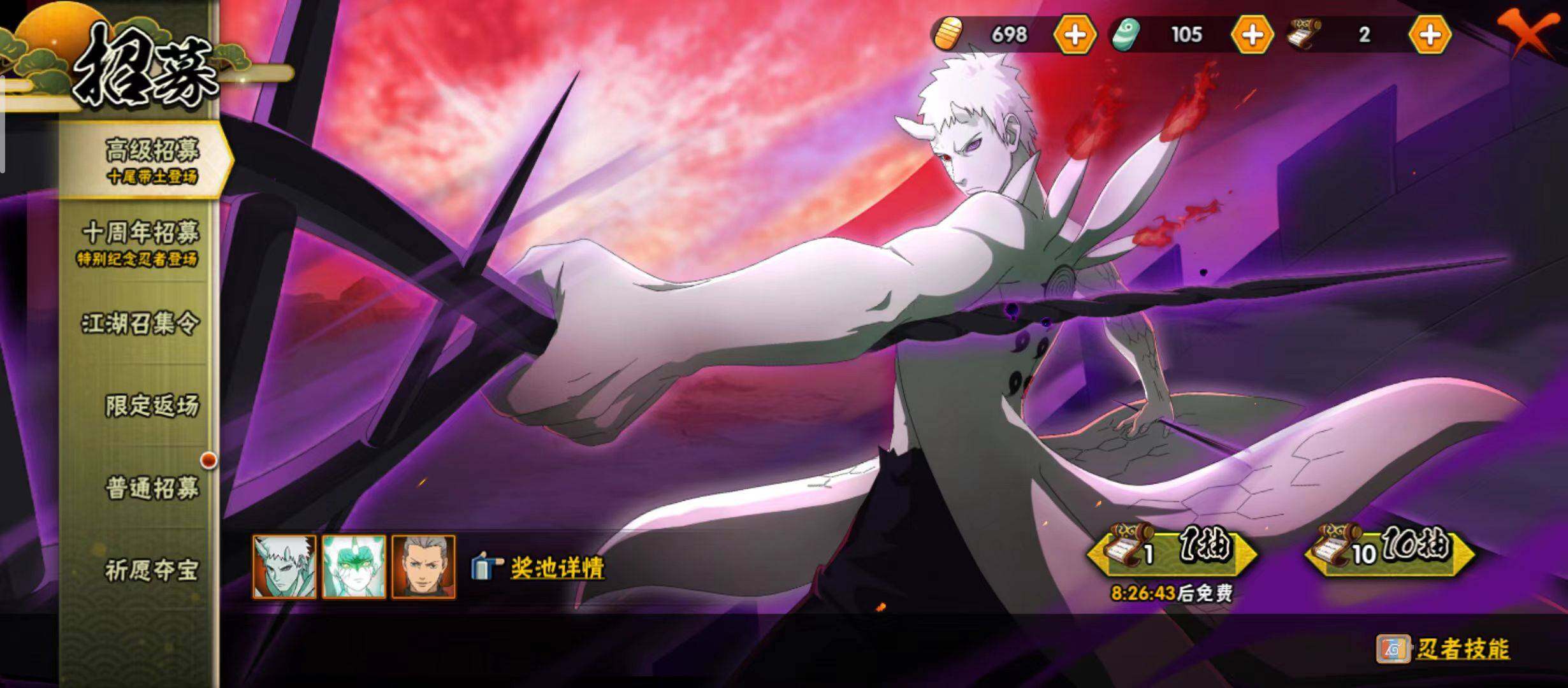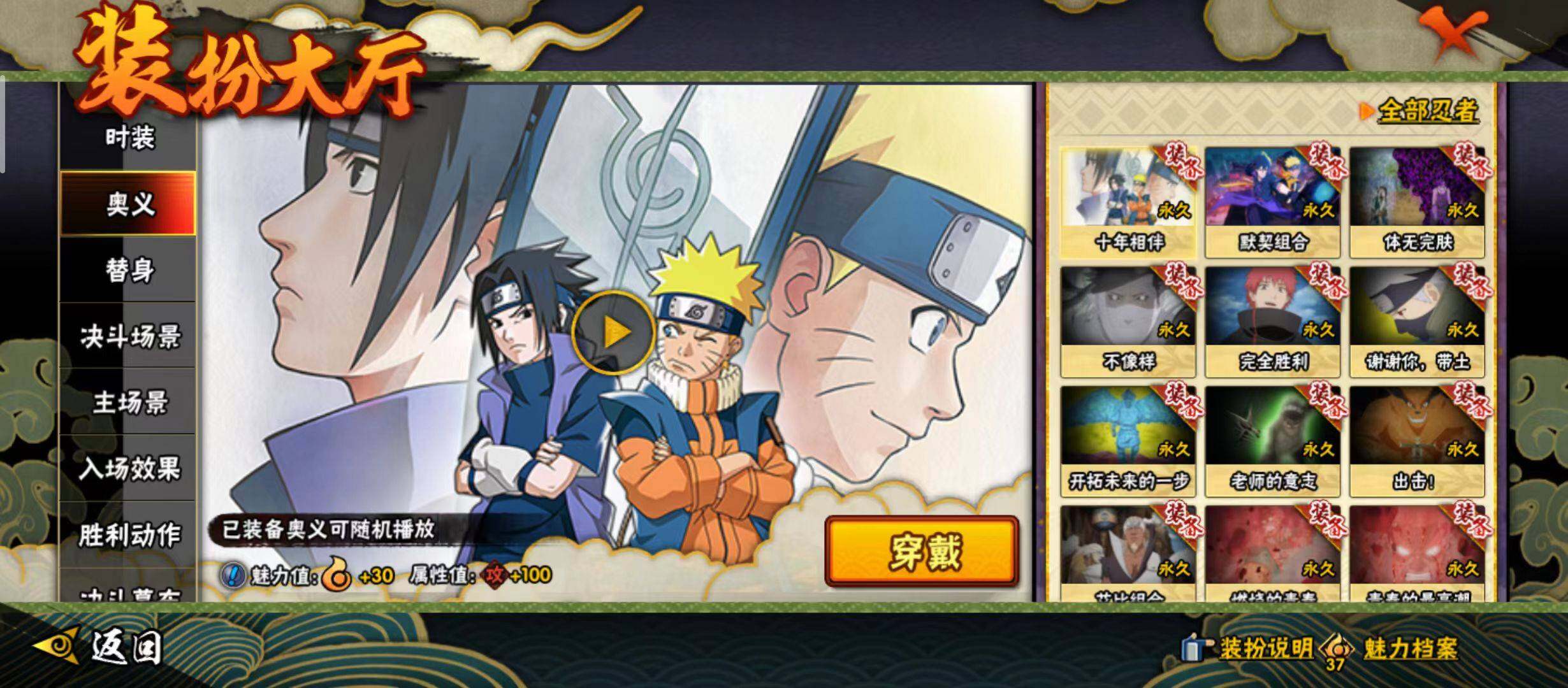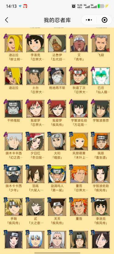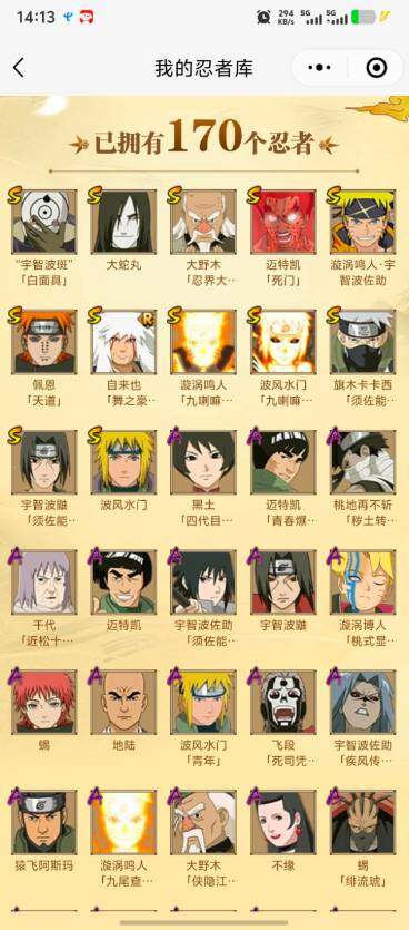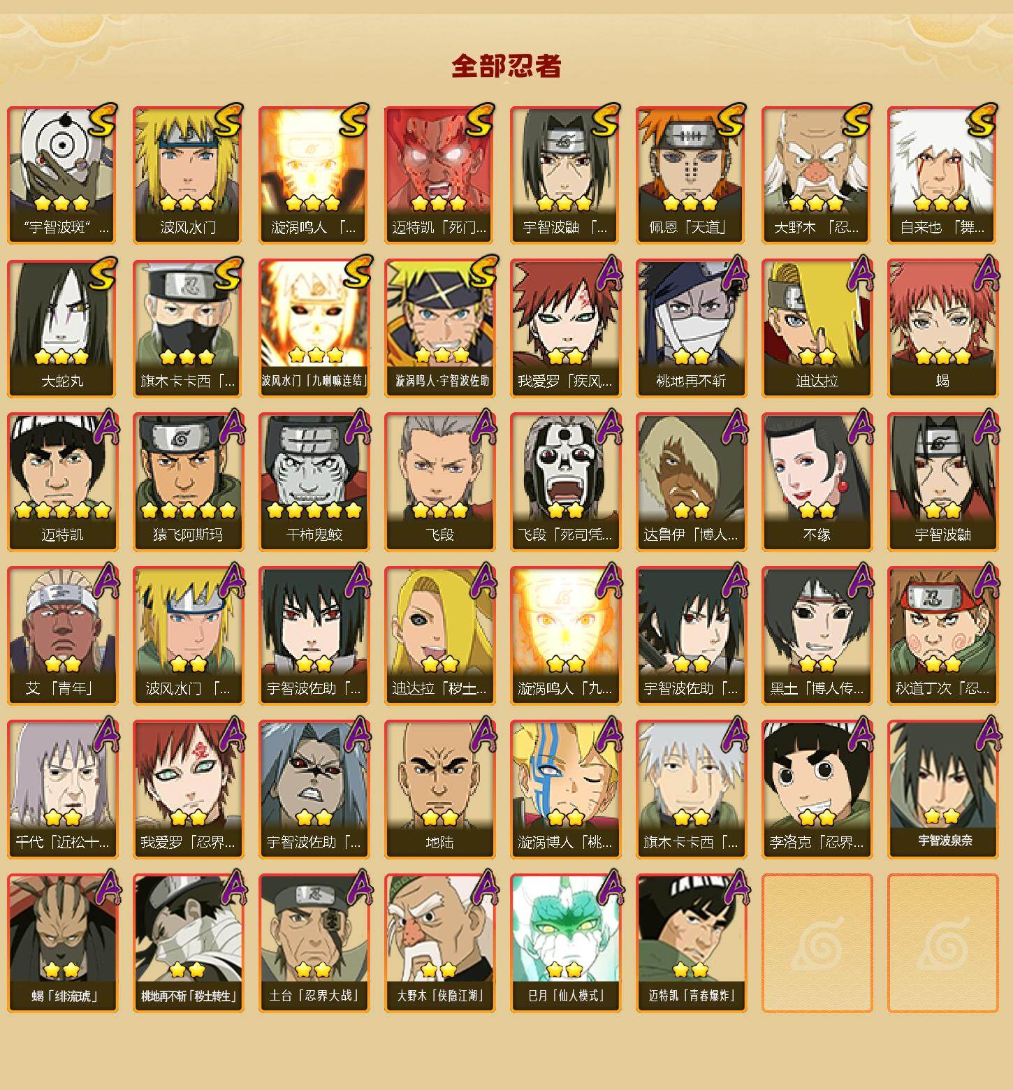 【S级忍者】:大野木「忍界大战」(3星),宇智波鼬「须佐能乎」(3星),旗木卡卡西「须佐能乎」(3星),自来也「舞之豪杰」(3星),大蛇丸(3星),波风水门(3星),漩涡鸣人「九喇嘛连结」(3星),迈特凯「死门」(3星),佩恩「天道」(3星),宇智波斑 「白面具」(3星宇智波斑「白面具」),波风水门「九喇嘛连结」(3星),漩涡鸣人·宇智波佐助(3星)