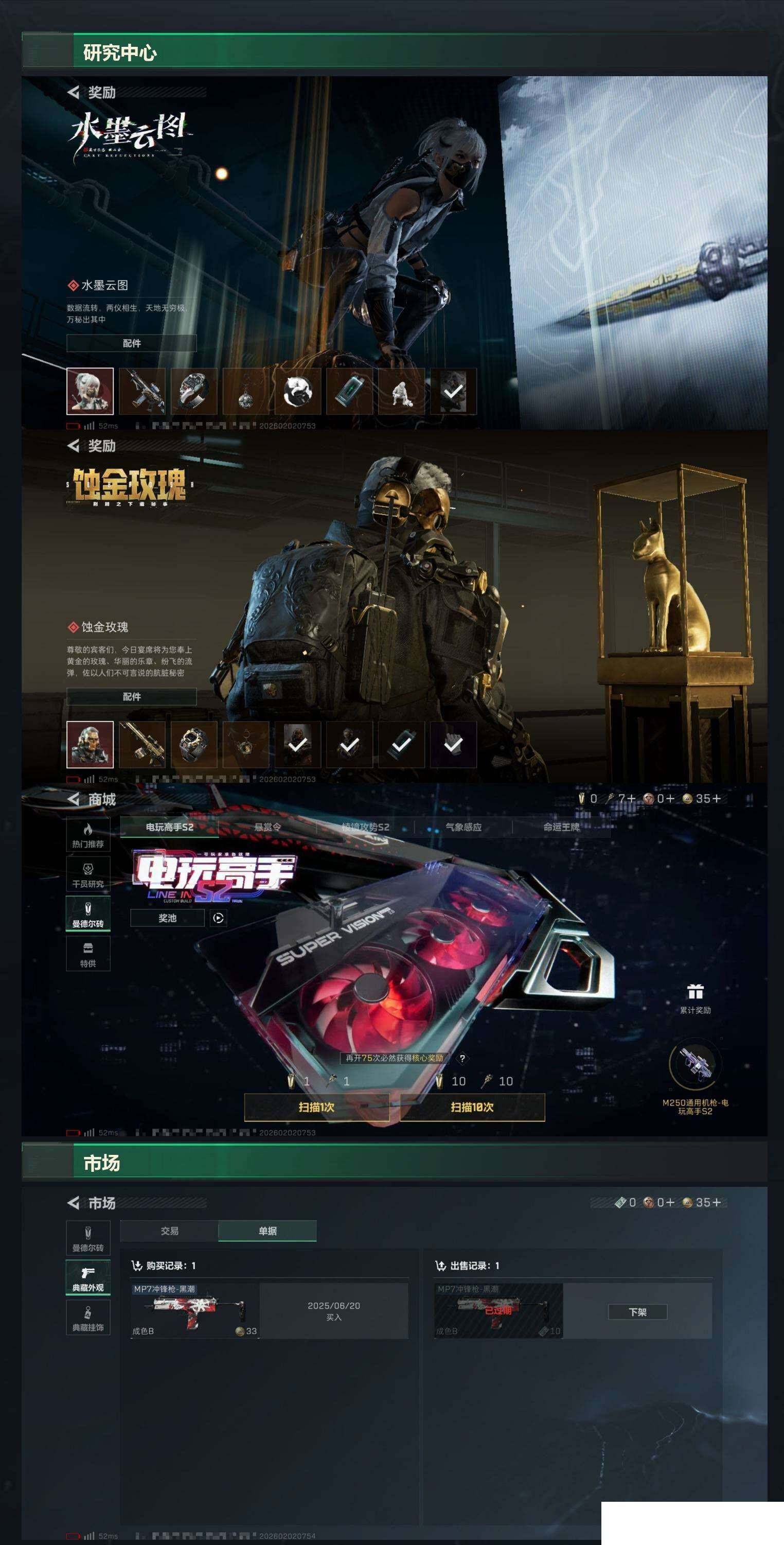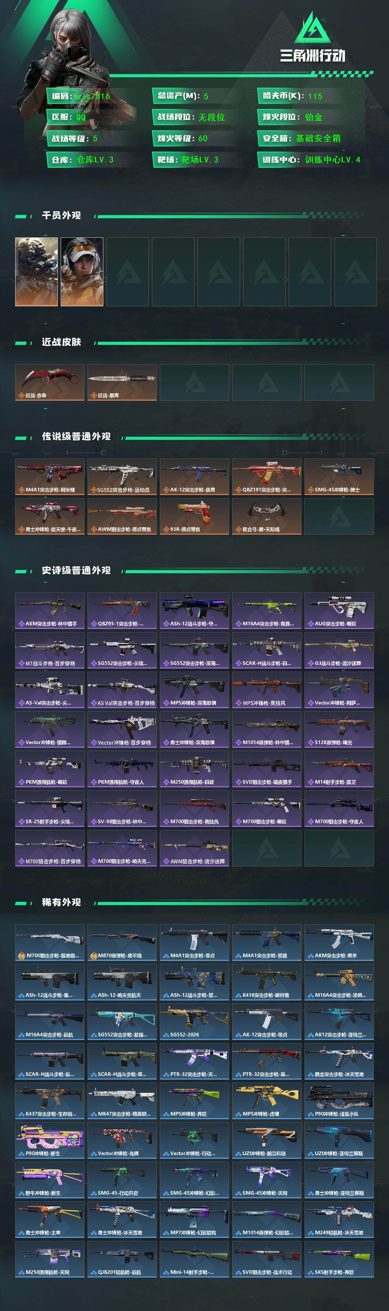 【sjs7816】0处罚纯绿单赤霄可二次金皮账号+露娜金皮 精品成品刀皮号 烽火地带段位: 铂金 全面战场段位: 无段位 总资产: 5000000 哈夫币: 115000 sjs7816 干员外观: 无名-夜鹰(S4),露娜-金牌射手(S7) 传说武器皮肤: 近战-赤枭,AK-12突击步枪-夜鹰,SMG45冲锋枪-骑士,M4A1突击步枪-阿米娅,复合弓-黑-天际线,AWM狙击步枪-捞点薯条,腾龙突击步枪-捞点薯条,93R-捞点薯条,勇士冲锋枪-能天使-午夜邮差,SG552突击步枪-运动员 史诗武