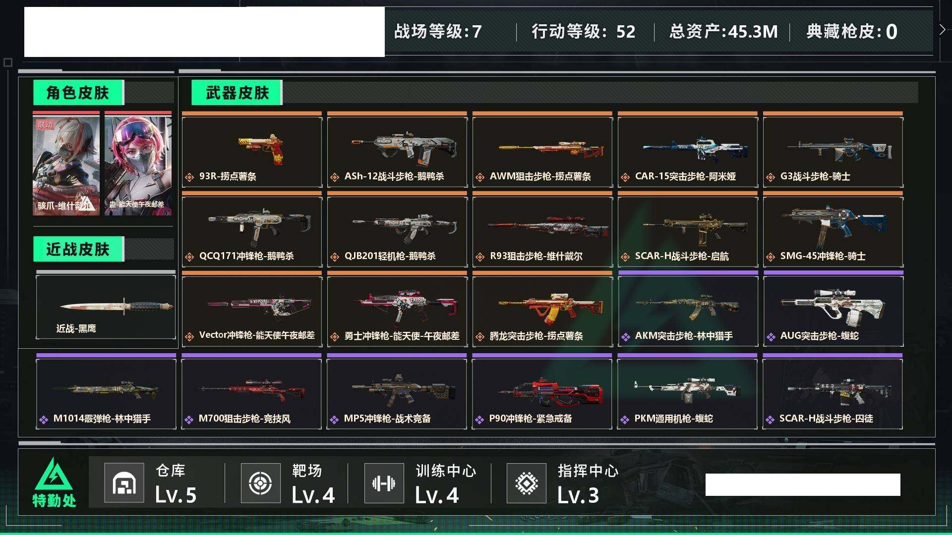 【sjs7817】总资产 40m 维什戴尔 午夜邮差 烽火地带段位: 铂金 全面战场段位: 列兵 总资产: 45000000 哈夫币: 22470000 sjs7817 干员外观: 蛊-能天使·午夜邮差,骇爪-维什戴尔 传说武器皮肤: SMG45冲锋枪-骑士,M4A1突击步枪-阿米娅,CAR-15突击步枪-阿米娅,AWM狙击步枪-捞点薯条,腾龙突击步枪-捞点薯条,93R-捞点薯条,勇士冲锋枪-能天使-午夜邮差,Vector冲锋枪-能天使-午夜邮差,R93狙击步枪-维什戴尔,SCAR-H战斗步枪