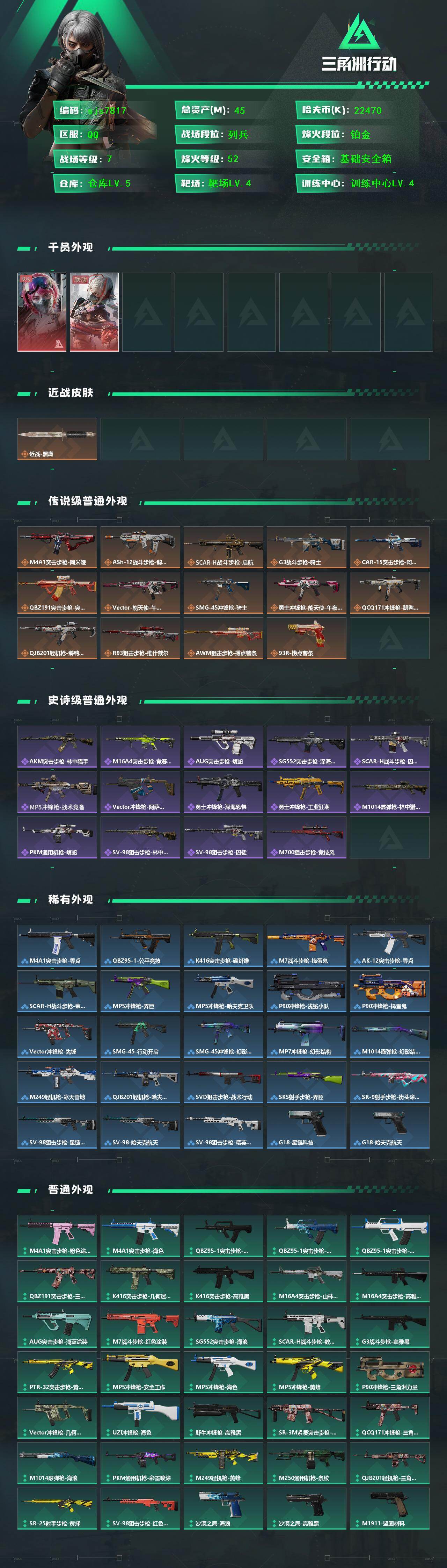 总资产 40m 维什戴尔 午夜邮差 烽火地带段位: 铂金 全面战场段位: 列兵 总资产: 45000000 哈夫币: 22470000