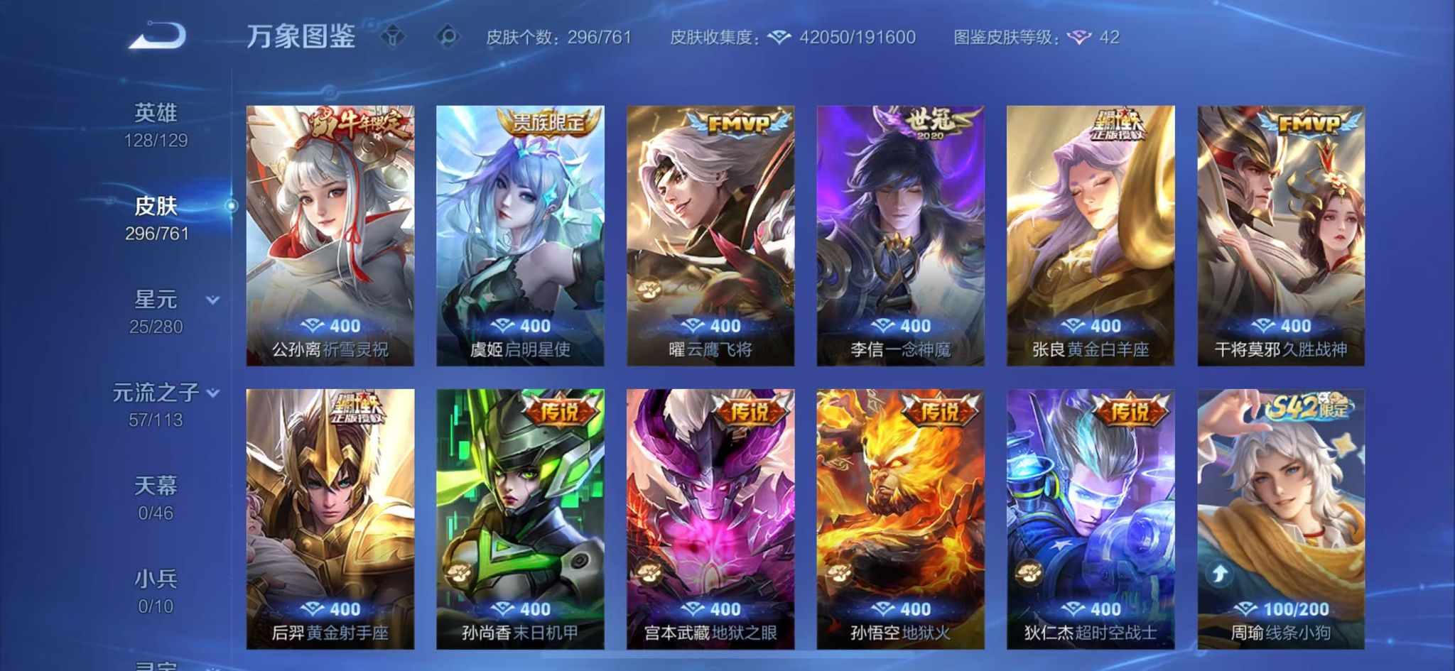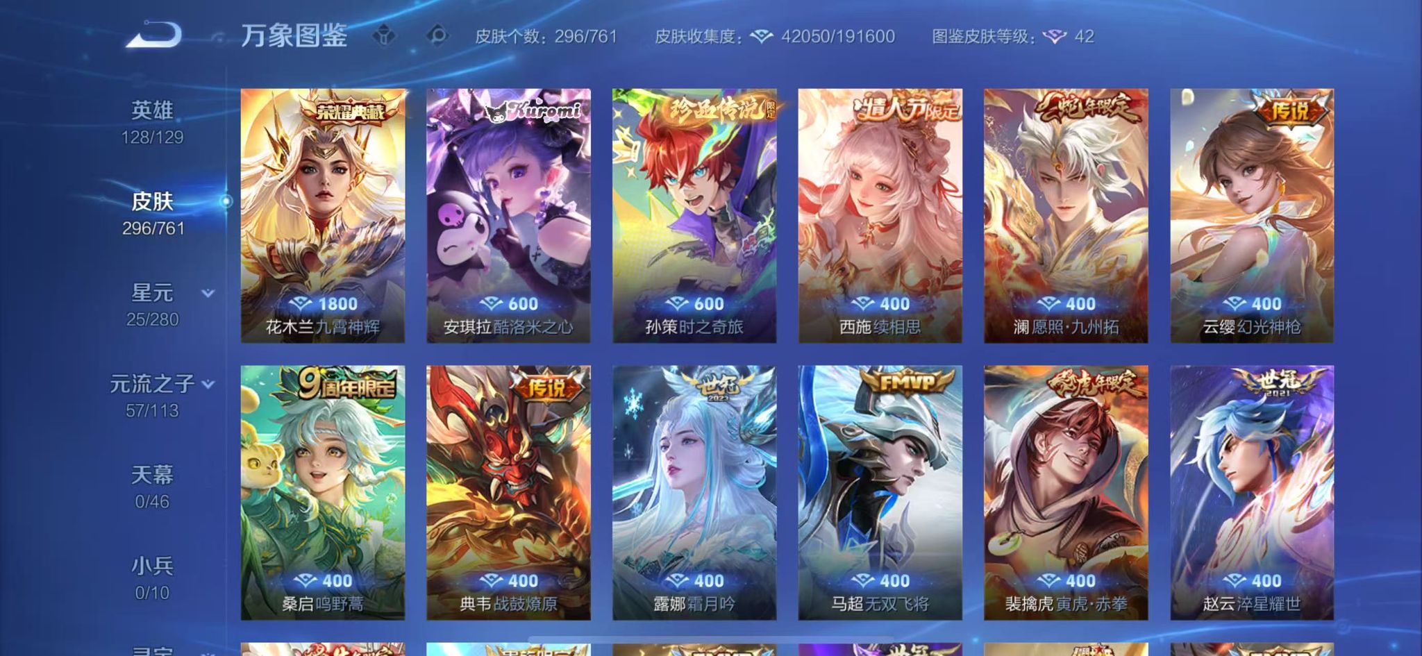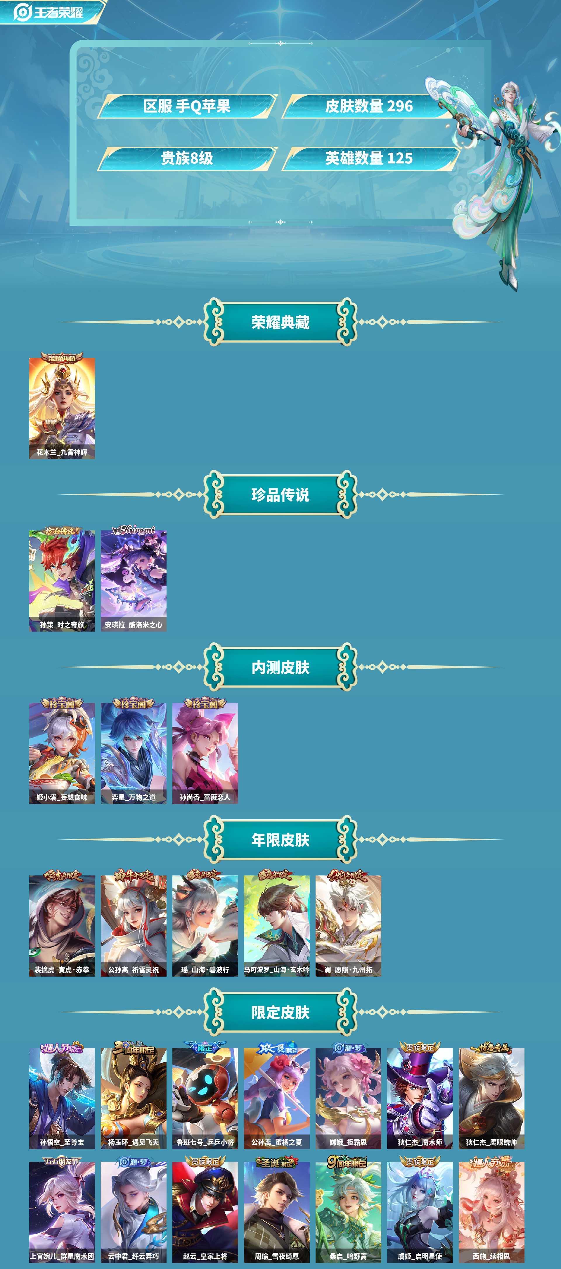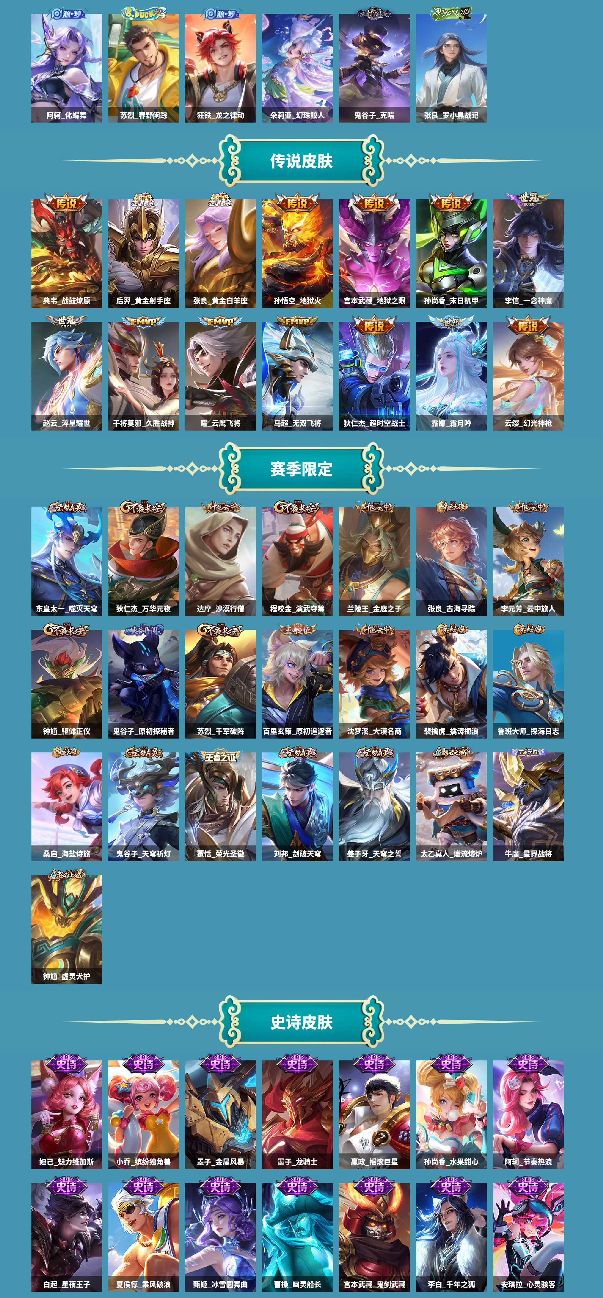 V8-发育路47段2珍品限定-花木兰九霄神辉-安琪拉酷洛米之心,孙策时之奇旅-至尊宝-宫本武藏地狱之眼,孙尚香末日机甲,西施续相思,干将莫邪久胜战神,张良黄金白羊座,公孙离祈雪灵祝,赵云淬星耀世,云缨幻光神枪,澜愿照九州拓,李信一念神魔,露娜霜月吟,典韦战鼓燎原,狄仁杰超时空战士,曜云鹰飞将,孙悟空地狱火,马超无双飞将,后羿黄金射手座,虞姬启明星使,裴擒虎寅虎赤拳