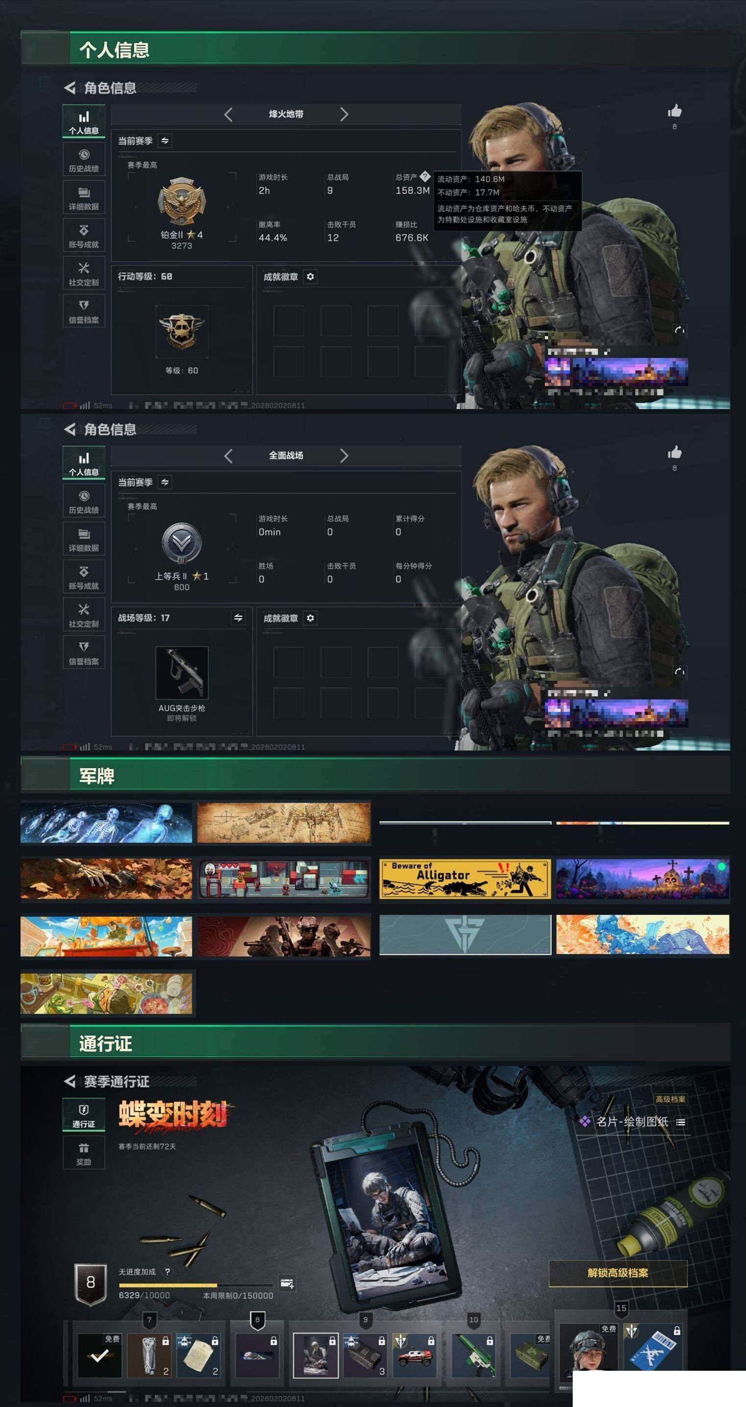 总资产158m 现金 102m 烽火地带段位: 铂金 全面战场段位: 上等兵 总资产: 158000000 哈夫币: 102097000