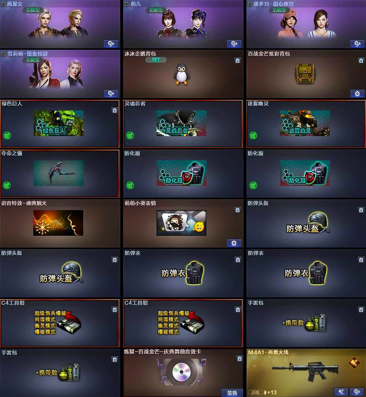【道具】:冰冰企鹅背包,百战金芒炫彩背包,绿色巨人,灵魂忍者,迷雾幽灵,夺命之镰,防化服*2,语音特效-盛典烟火,萌萌小葵表情,防弹头盔*2,防弹衣*2,C4工具钳*2