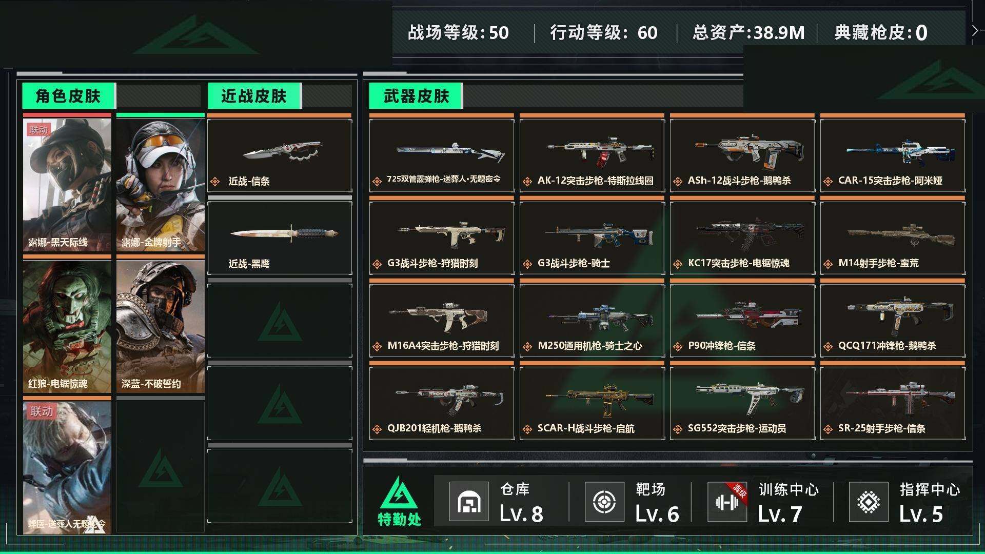 总资产38m 露娜 信条 训练中心7 靶场6 烽火地带段位: 铂金 全面战场段位: 上等兵 总资产: 38000000 哈夫币: 1063000