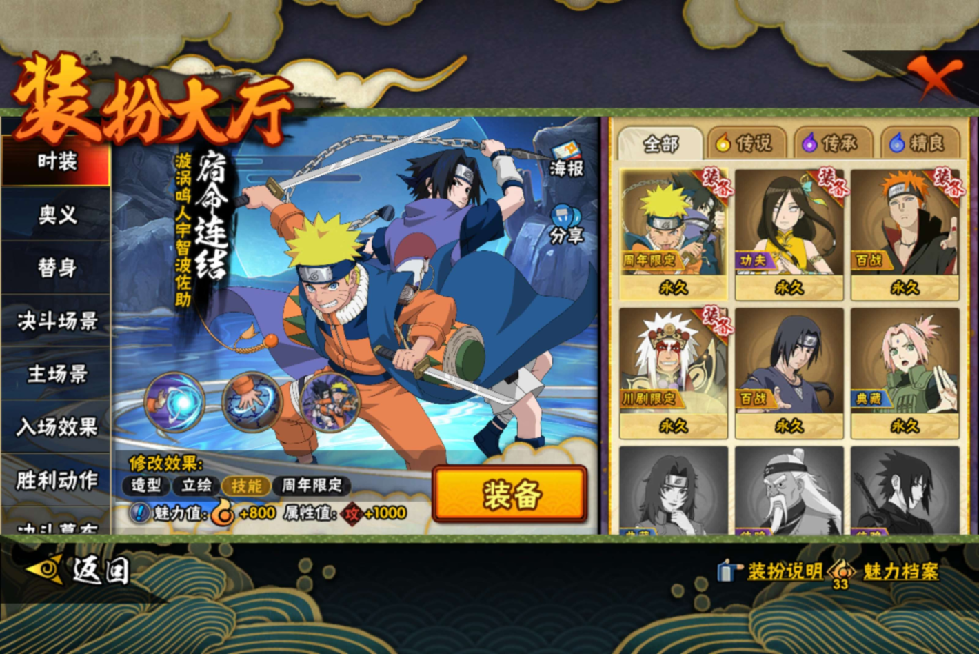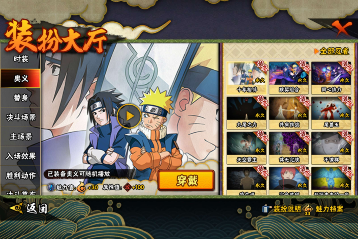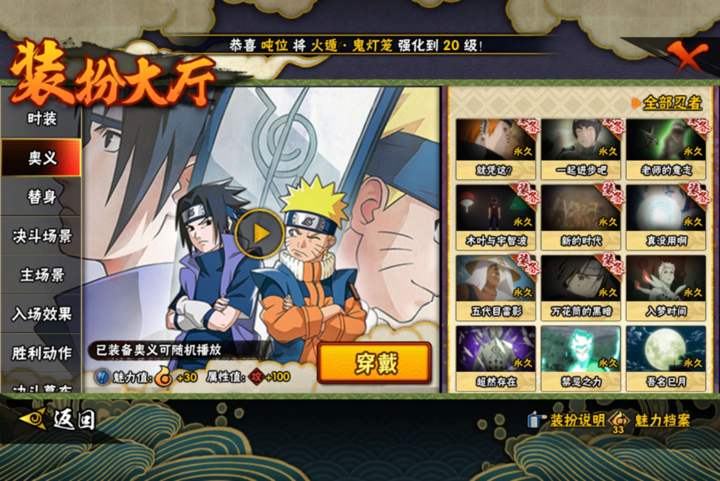 【S级忍者】旗木卡卡西「须佐能乎」(3星),漩涡鸣人「暴怒·第六尾」(3星),艾「忍界大战」(3星),宇智波止水「须佐能乎」(3星),波风水门「九喇嘛连结」(3星),自来也「舞之豪杰」(3星),宇智波带土「十尾人柱力」(3星),宇智波鼬「须佐能乎」(3星),漩涡鸣人·宇智波佐助(3星),佩恩「天道」(3星),猿飞日斩「