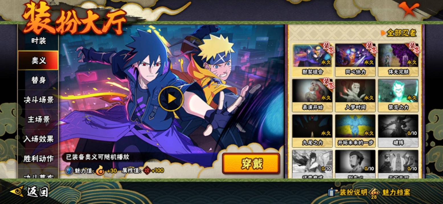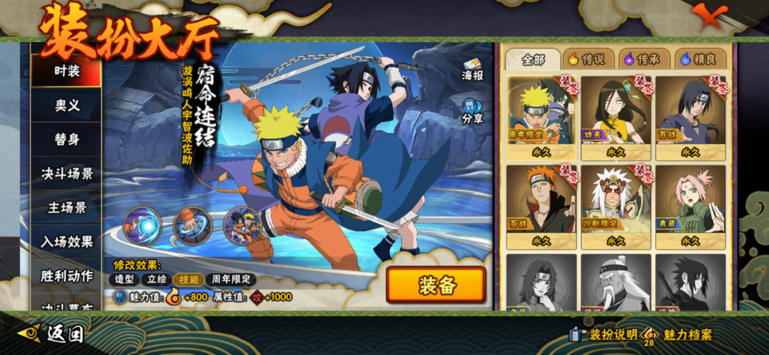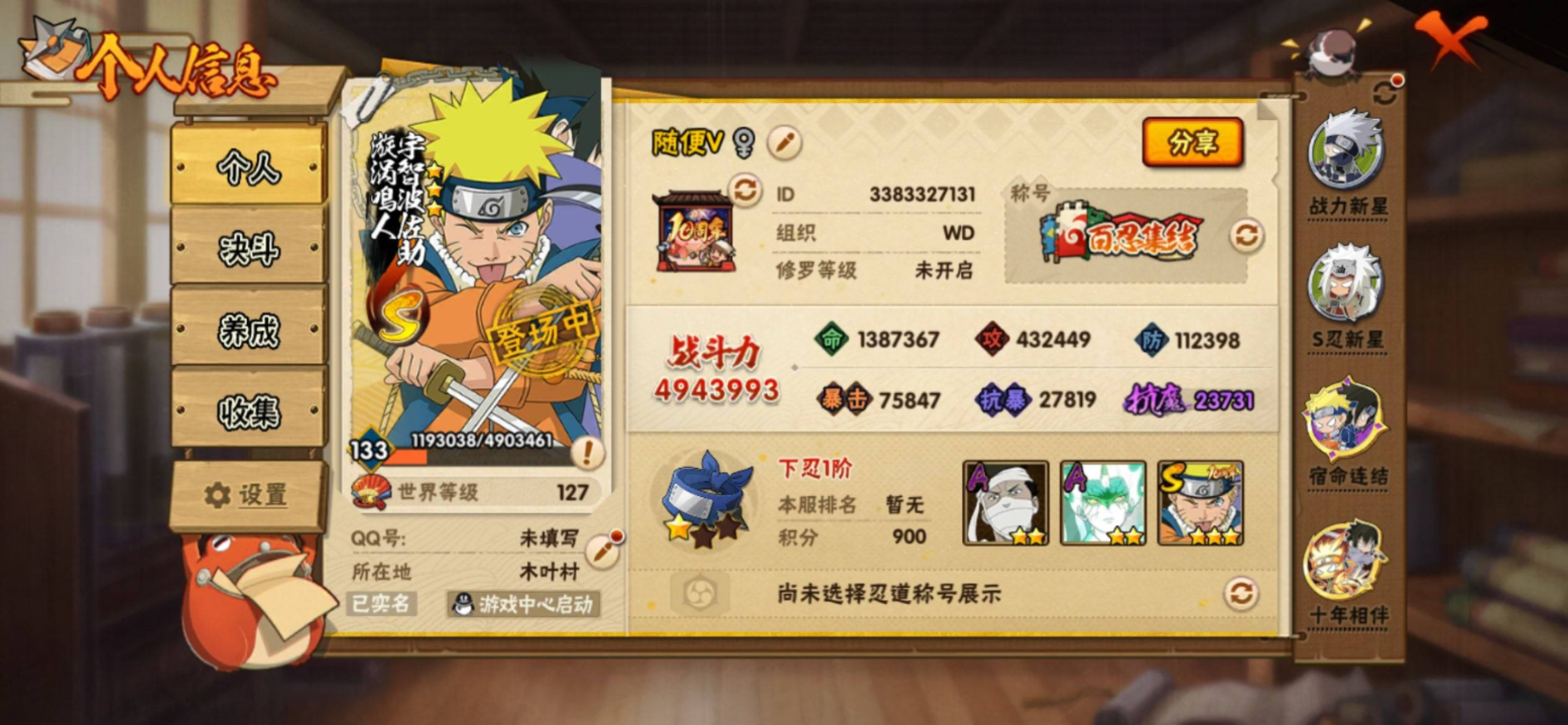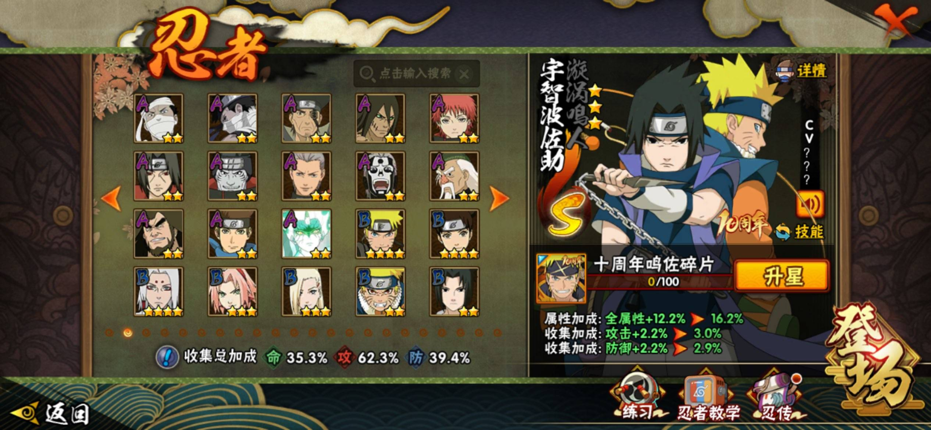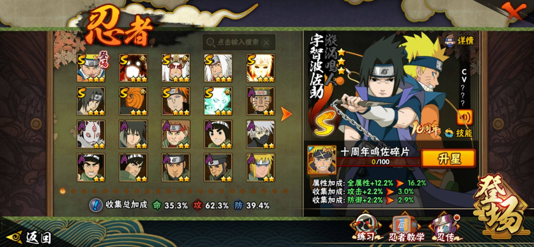 【S级忍者】自来也「传说中的三忍」(3星),大筒木舍人「最终章」(3星),漩涡鸣人「暴怒·第六尾」(3星),波风水门「九喇嘛连结」(3星),自来也「舞之豪杰」(3星),宇智波鼬「须佐能乎」(3星),漩涡鸣人·宇智波佐助(3星),佩恩「天道」(3星),宇智波斑「五影会谈」(3星),