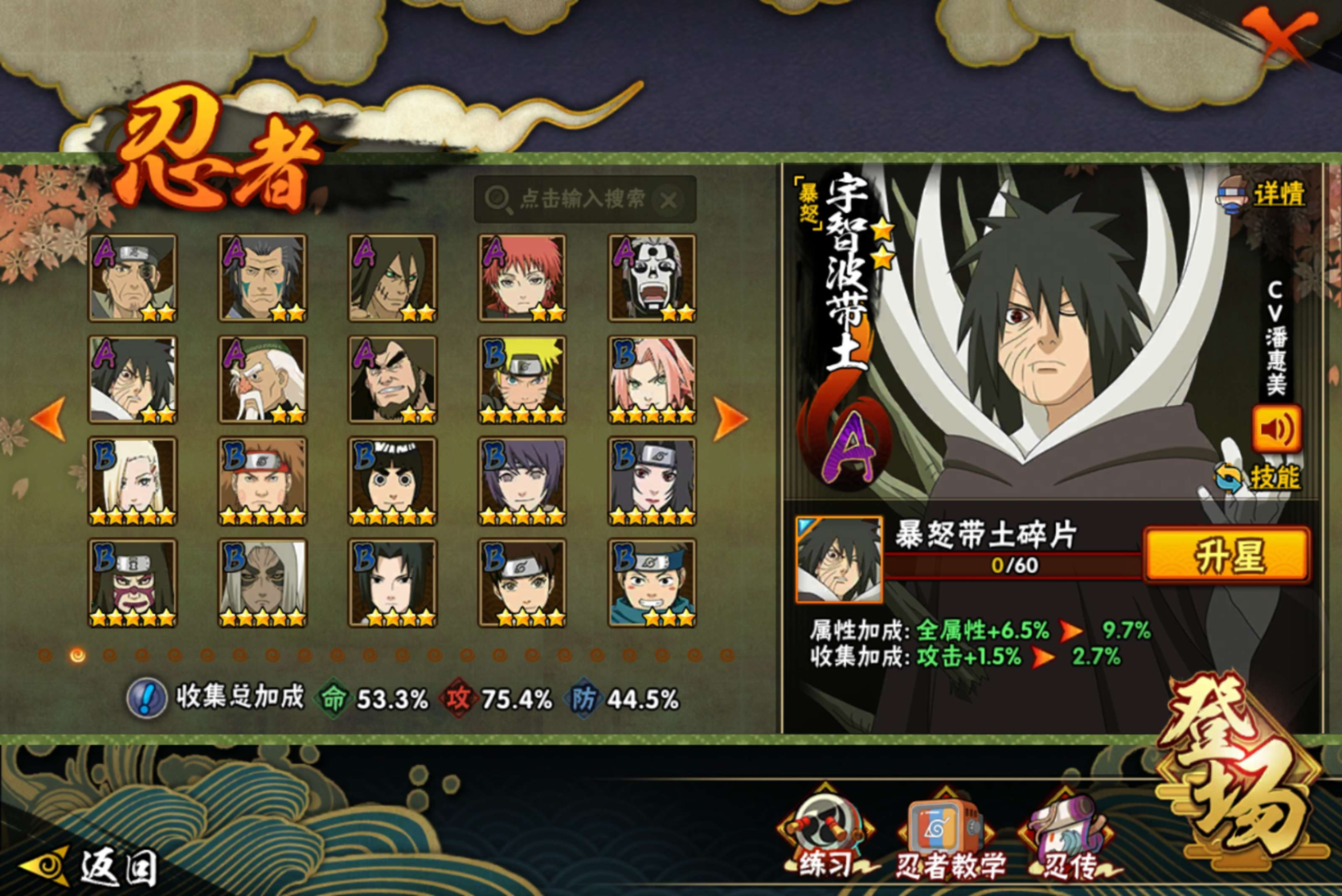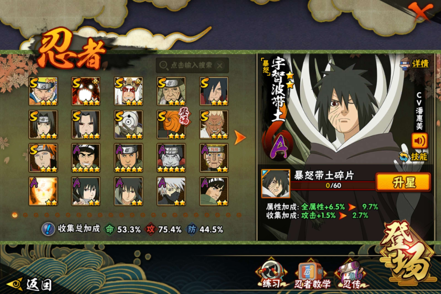 【S级忍者】漩涡鸣人「暴怒·第六尾」(3星),宇智波斑「秽土转生·解」(3星),艾「忍界大战」(3星),宇智波斑「白面具」(3星),自来也「舞之豪杰」(3星),宇智波鼬「秽土转生」(3星),宇智波鼬「须佐能乎」(3星),漩涡鸣人·宇智波佐助(3星),佩恩「天道」(3星),宇智波斑「五影会谈」(3星),猿飞日斩「秽土转生