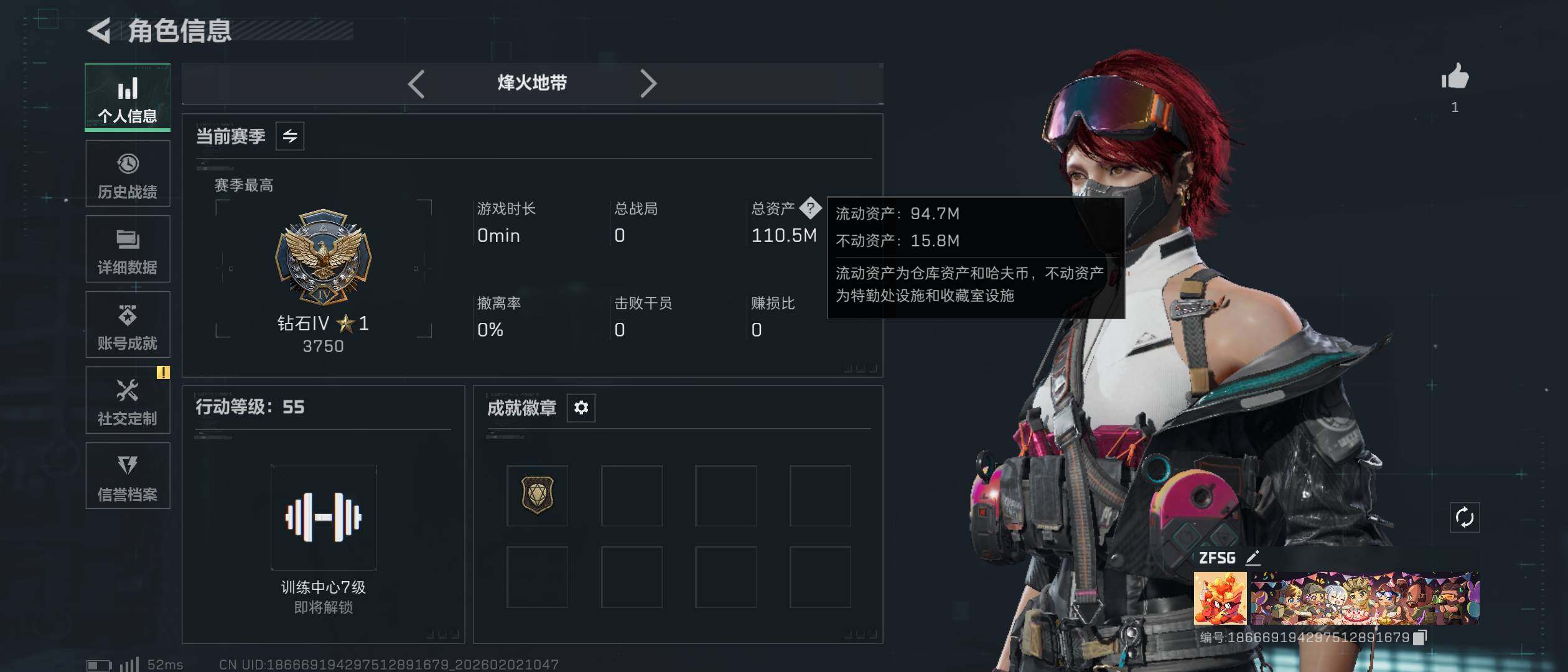 110m总资产-51312k哈伏币-55烽火等级-钻石-9战场等级-列兵