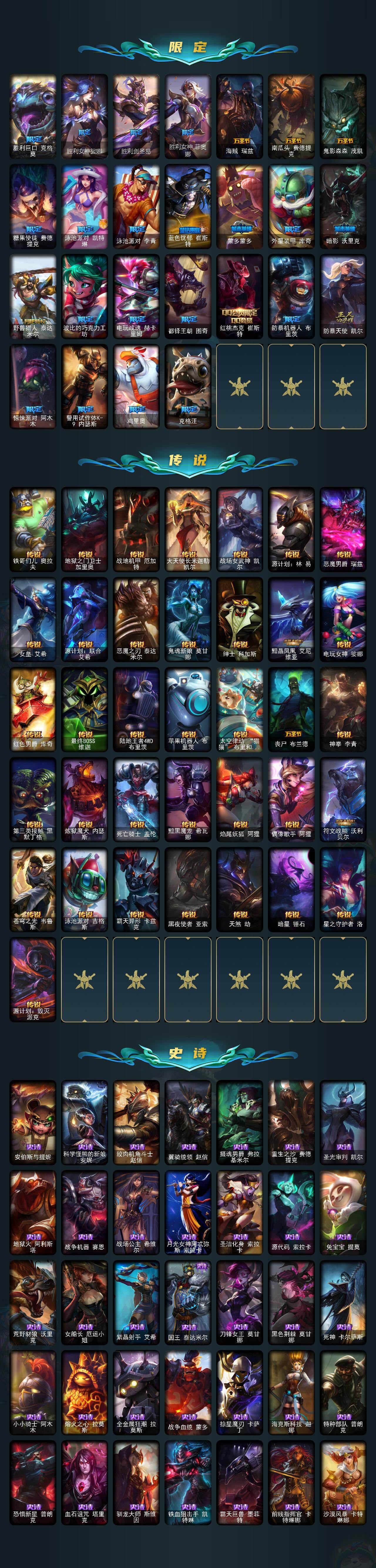 172英雄/373皮肤/1终极/4神话/85限定/5臻彩/125炫彩/36传说/97史诗/黄金/