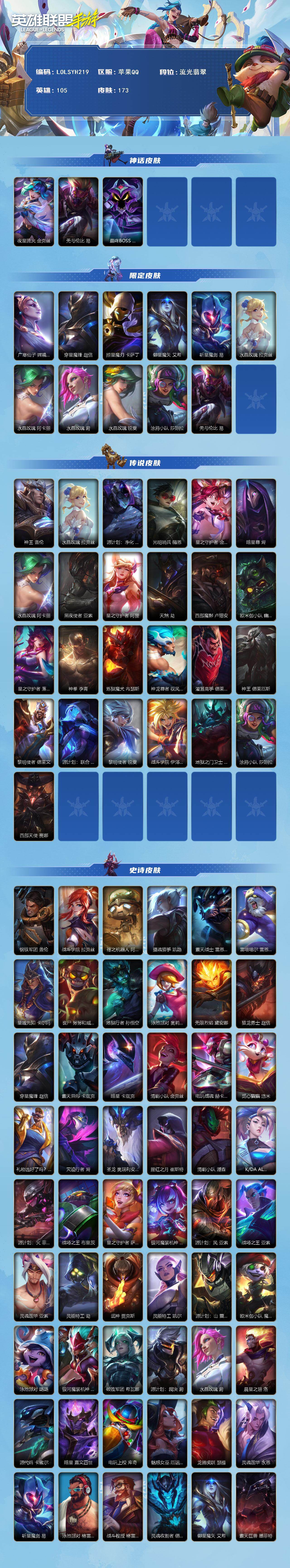 【LOLSYH219】105英雄/173皮肤/3神话/22传说/流光翡翠/夜星流火 金克丝/无与伦比 易/最终BOSS 里·大魔王 维迦/广寒仙子 嫦娥 黛安娜/穿星魔锋 赵信/掠星魔刃 卡萨丁/御星魔矢 艾希/斩星魔剑 易/水晶玫瑰 拉克丝/水晶玫瑰 阿卡丽/水晶玫瑰 蔚/水晶玫瑰 锐雯/涂鸦小队 莎弥拉/神王 盖伦/源计划:净化 薇恩/光明哨兵 薇恩/星之守护者 金克丝/暗星尊 烬/黑夜使者 亚索/星之守护者 阿狸/天煞 劫/西部魔影 卢锡安/欧米伽小队 幽灵特工 提莫/星之守护者 落 霞/