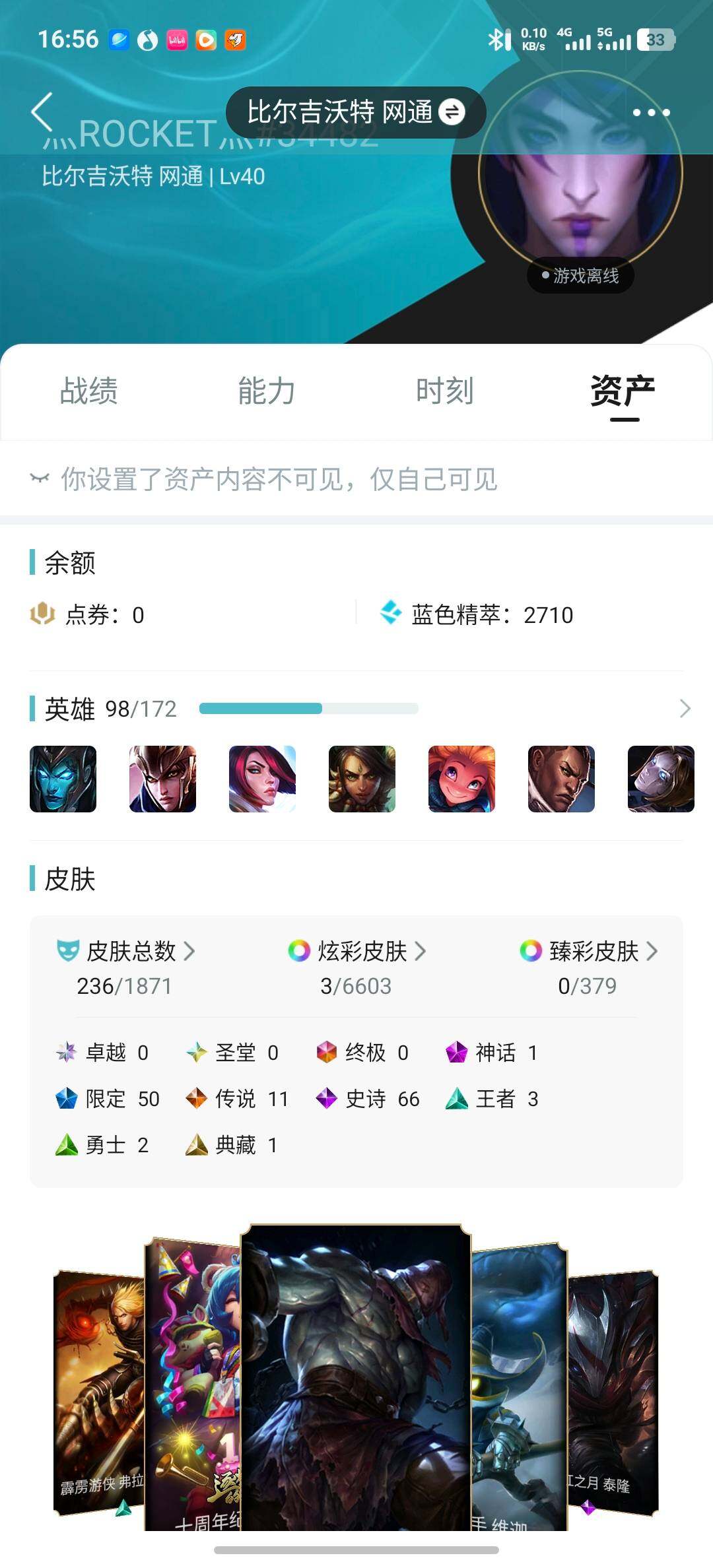 【店主推荐捡漏号】未定级段位-98英雄-236皮肤-3炫彩-0终极-1神话-50限定-11传说-66史诗