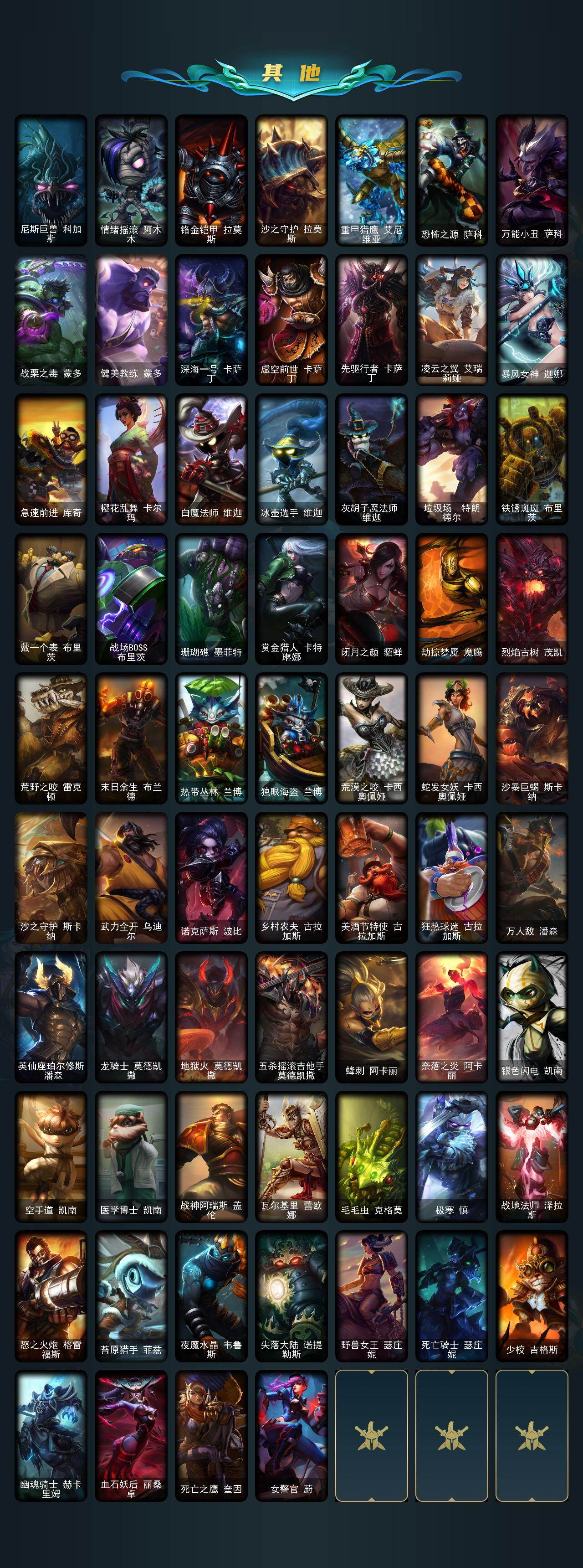 【冰雪限定】:幸福女神乐芙兰,圣诞开心鬼提莫,圣诞精灵崔丝塔娜,圣诞狂欢努努和威朗普,圣诞糖果棒厄运小姐,阿木木“主人不要我了”,胡桃夹子萨科,平安夜女神娑娜,英勇玩具兵普朗克,夺命美人卡特琳娜,喜庆之树茂凯,冬