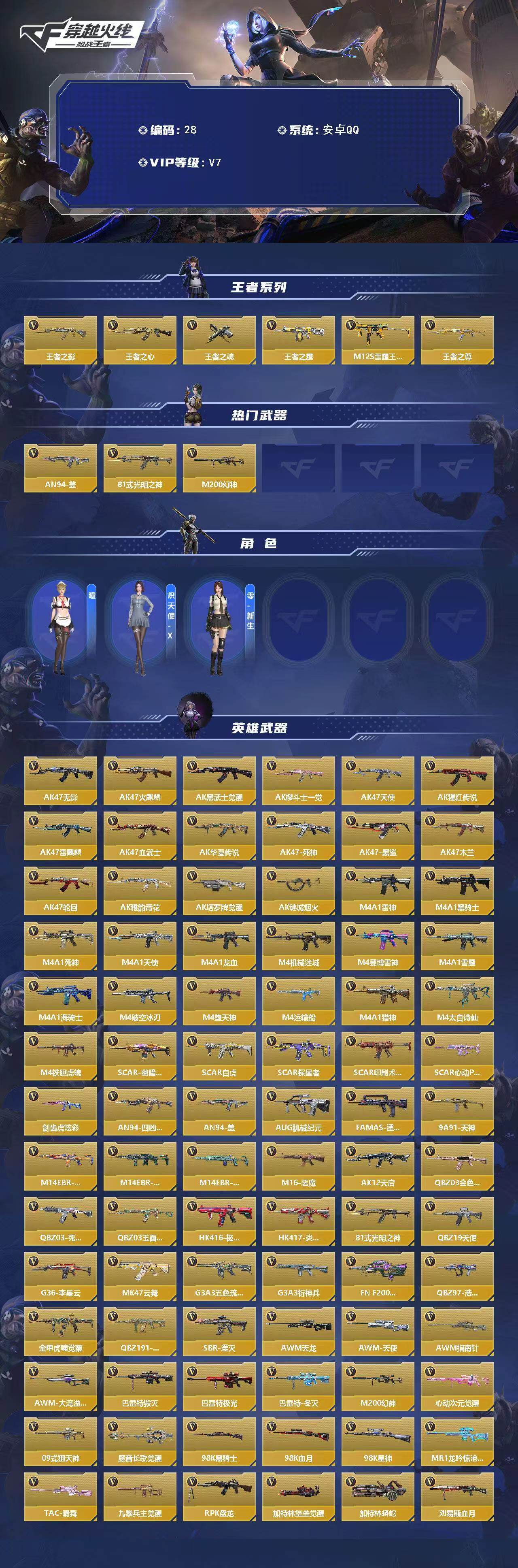 TZ2889【全模式畅玩号!自瞄星象+奉先无双+热门狙权+仁德+盖+仲达+仲康+7把王者主武+生化热门本初+黑龙魂+幻神+孟获+M4游骑兵紫魇+M4竞界荣光+81式+4把cop+虹儿】可转区V7-265V-7王者/47-仁德AN94-盖M4A1-星象M4A1-仲达AK47-奉先无双M200-权CZS2-仲康VEPR12-本初KSG-孟获/王者之霆QBZ03-王者蔷薇M4A1-雷霆王者王者之狱王者之影HeartShotM12S-雷霆王者冰霜奇迹王者之神HeartShot/黑龙魂M200-幻神M4A