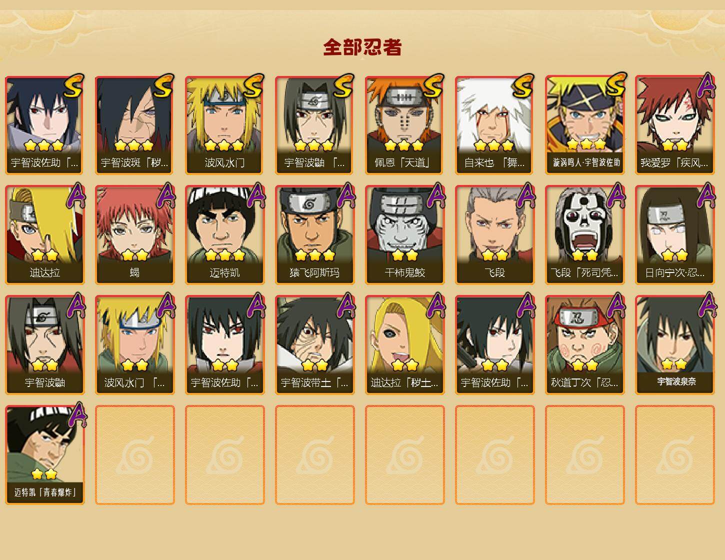 【HYN5156】V1/战力462W/S忍7/A忍18/通灵兽14/忍界大战-日向宁次/疾风传-我爱罗/死司凭血-飞段/宇智波鼬/永恒万花筒-宇智波佐助/蝎/天道-佩恩/3星漩涡鸣人·宇智波佐助/波风水门/忍界大战-秋道丁次/青年-波风水门/舞之豪杰-自来也/暴怒-宇智波带土/秽土转生-迪达拉/飞段/万花筒写轮眼-宇智波佐助/2星宇智波泉奈/迪达拉/干柿鬼鲛/3星迈特凯/秽土转生·解-宇智波斑/3星猿飞阿斯玛/2星迈特凯「青春爆炸」/须佐能乎-宇智波佐助/须佐能乎-宇智波鼬