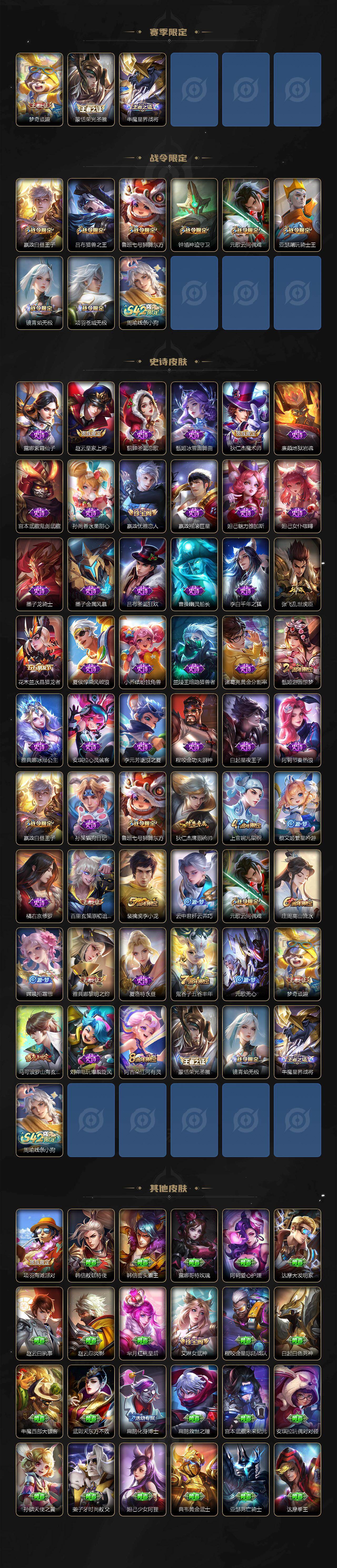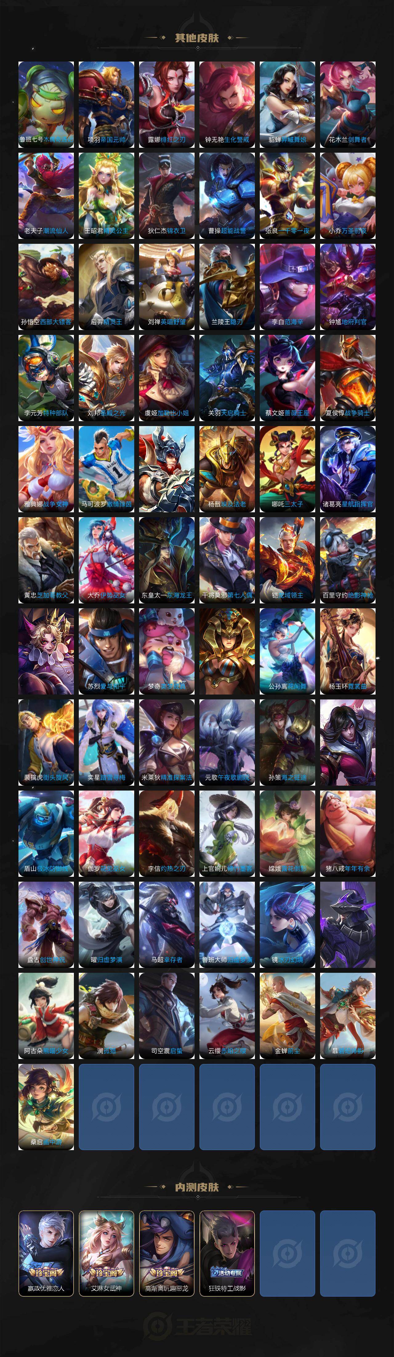 【限定皮肤】:姜子牙天穹之誓,狄仁杰阴阳师,赵云皇家上将,嬴政优雅恋人,嬴政白昼王子,鲁班七号狮舞东方,庄周高山流水,高渐离死亡摇滚,高渐离玩趣恶龙,吕布猎兽之王,元歌云间偶戏,元